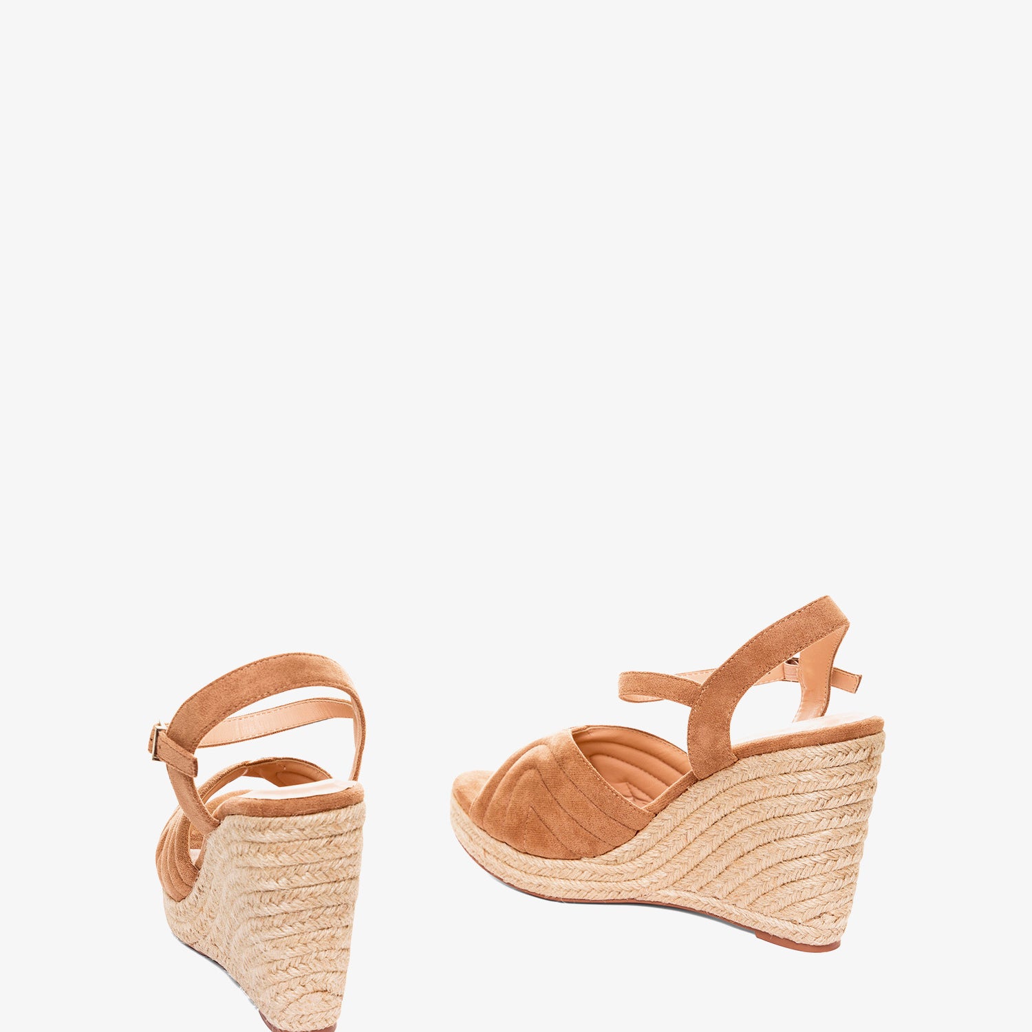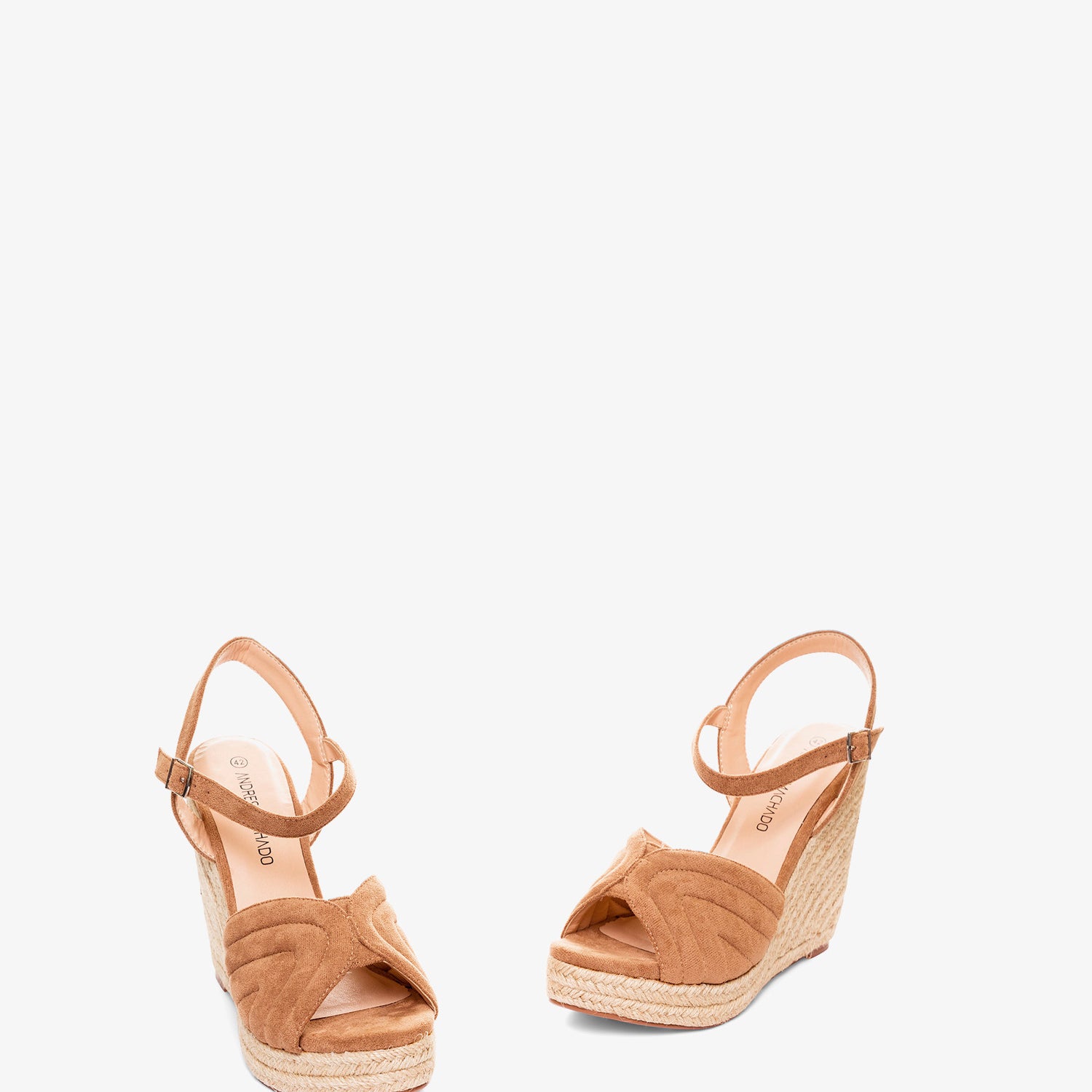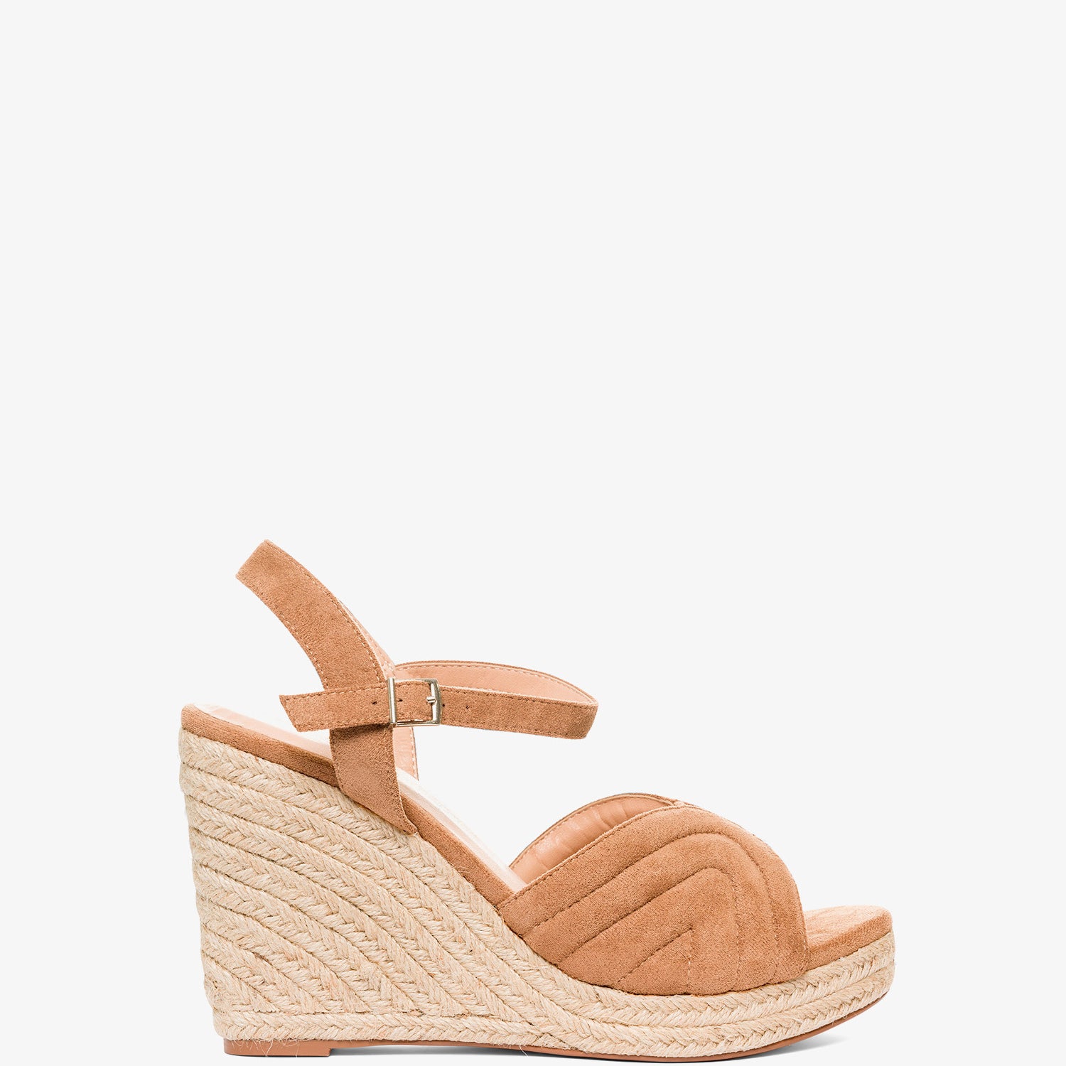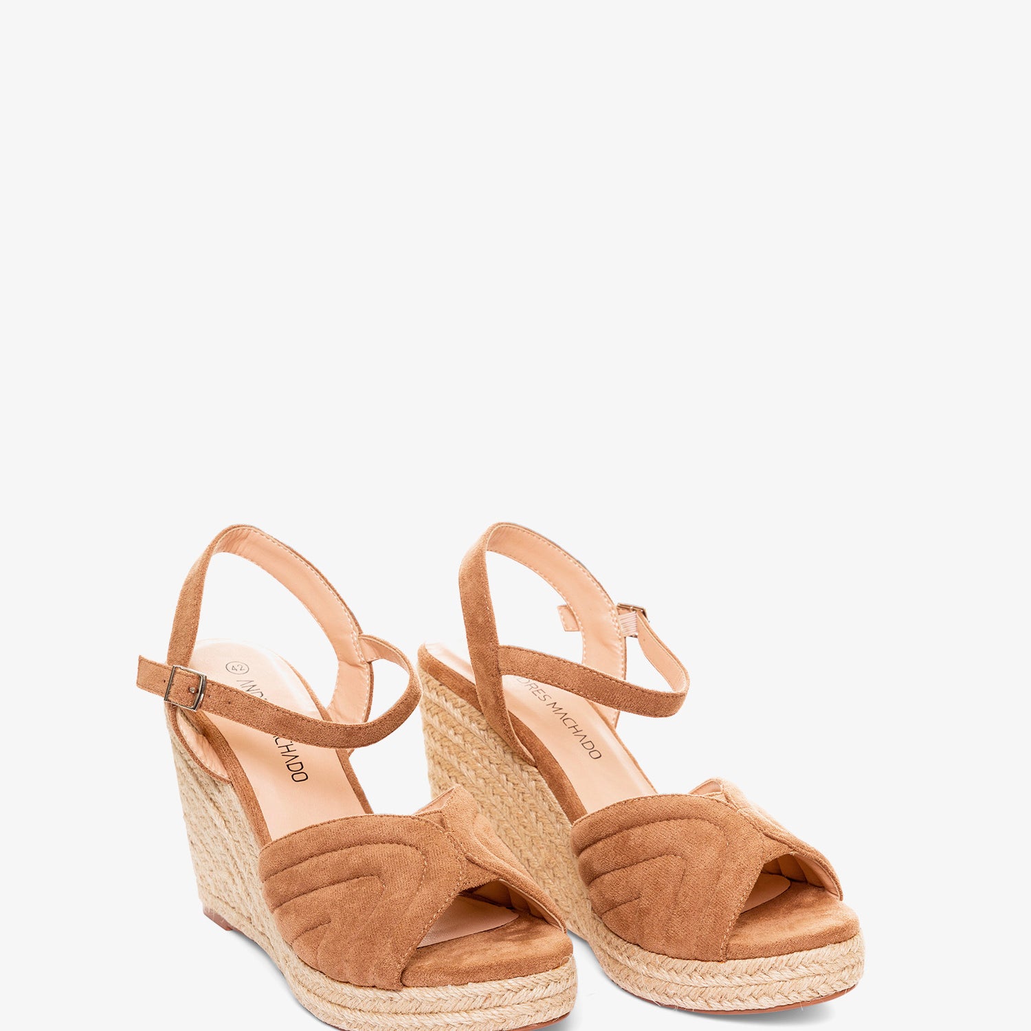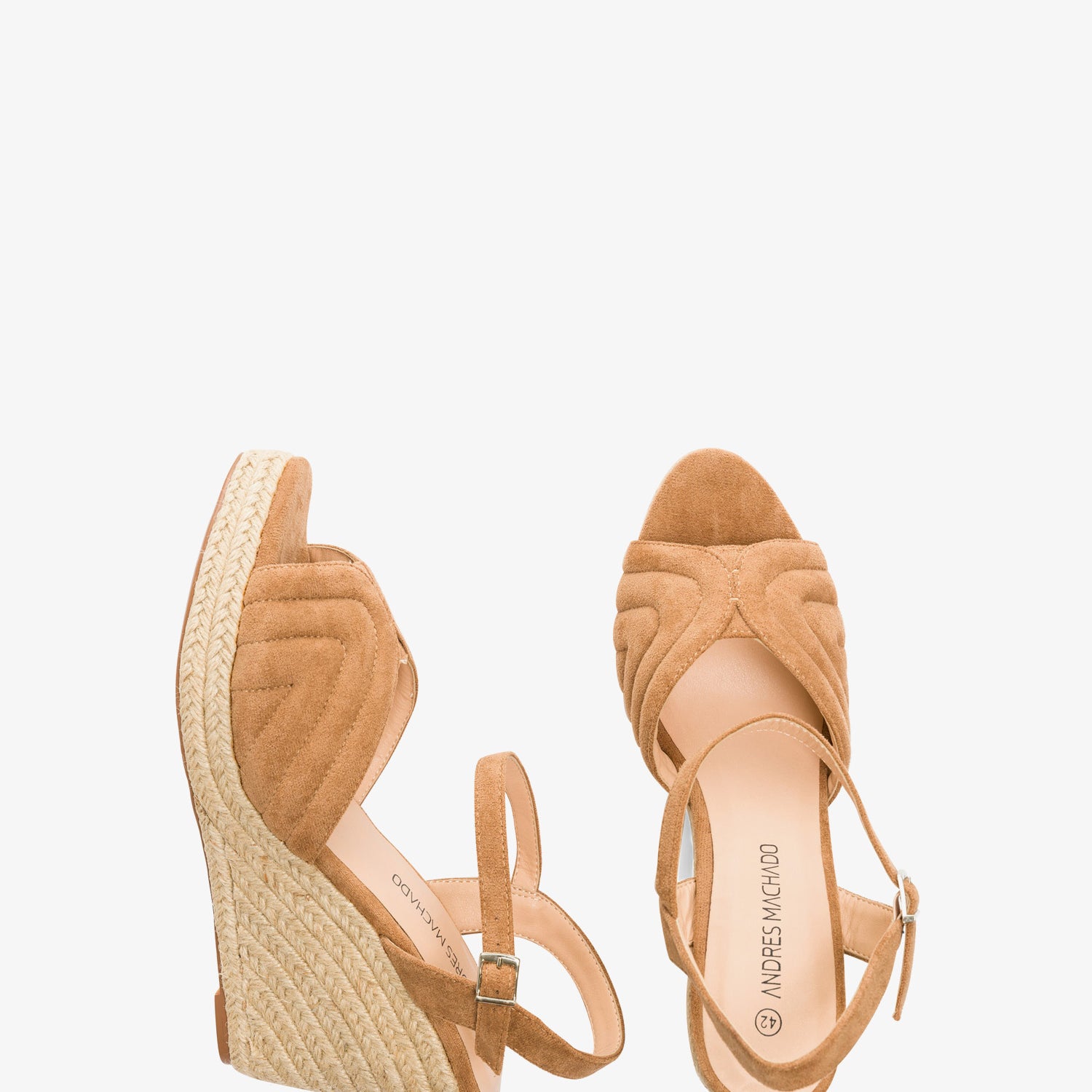 Espadryle zamszowe w kolorze wielbłądzim, na koturnie. Fason z odkrytymi plecami i falistym, tłoczonym kształtem z przodu. Zapięcie na klamrę z paskiem na kostce. Odkryte palce. Koturny i platforma z przodu wykonane z juty. Koturn o wysokości 10 cm i platformie o wysokości 2 cm dla małych rozmiarów od 32 do 35. Koturn o wysokości 12 cm i platformie o wysokości 2 cm dla dużych rozmiarów od 42 do 45.