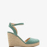Turkusowe espadryle zamszowe z koturnem z juty. Buty typu slingback z zapięciem na klamrę i paskiem na kostce. Zamknięte i zaokrąglone palce. Koturny i platforma z przodu wykonane z juty. Koturn o wysokości 10 cm i platformie 2 cm dla małych rozmiarów od 32 do 35. Koturn o wysokości 11,5 cm i platformie 2 cm dla dużych rozmiarów od 42 do 45.