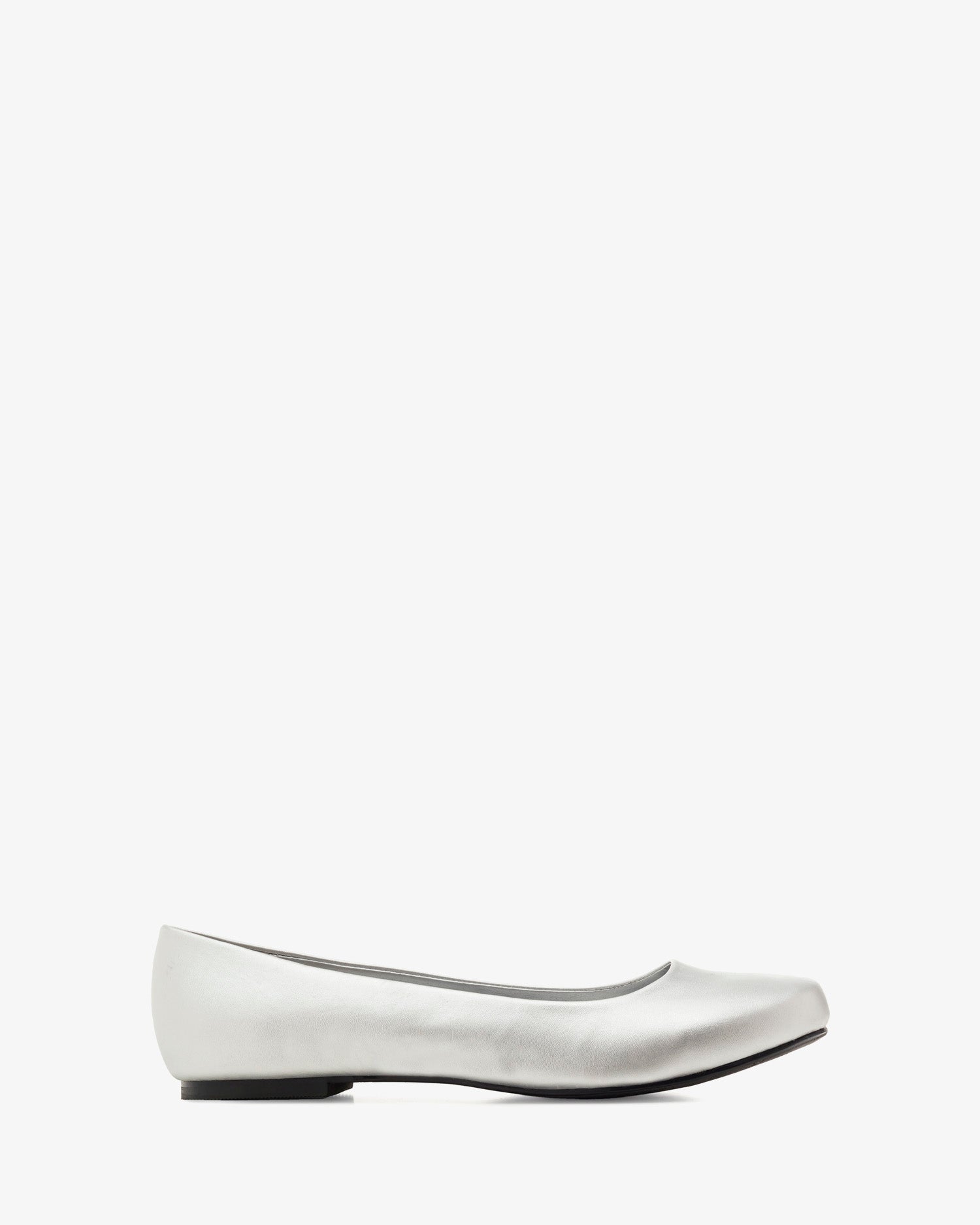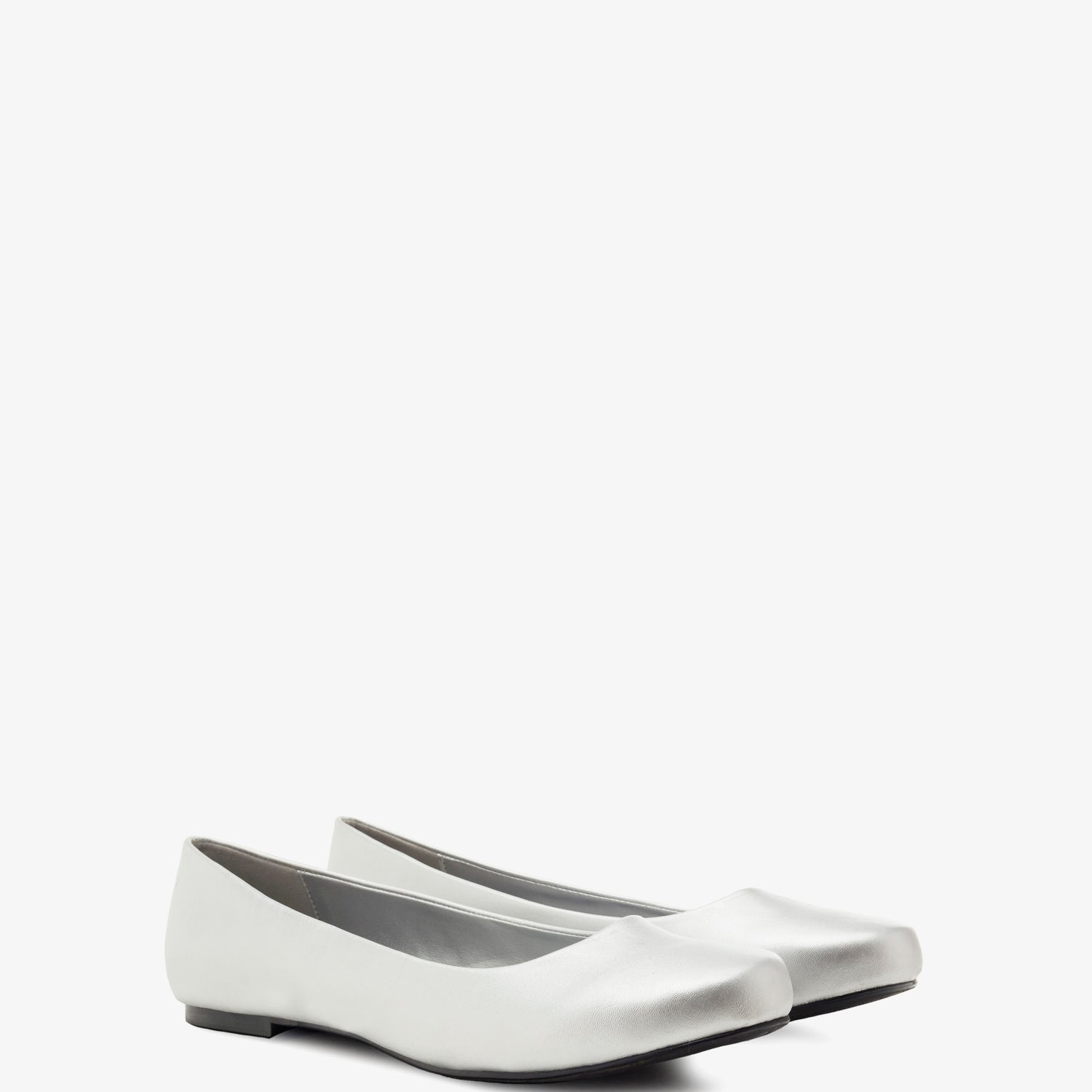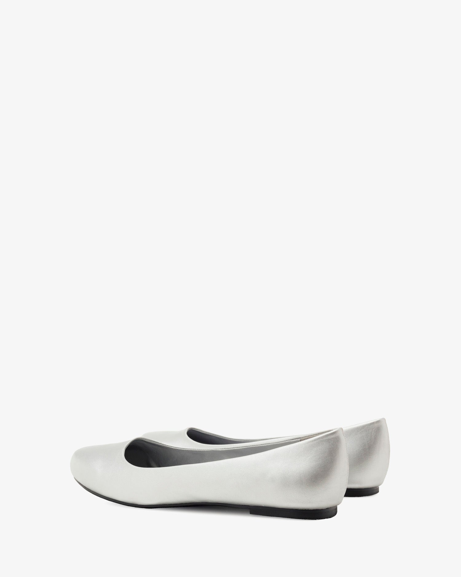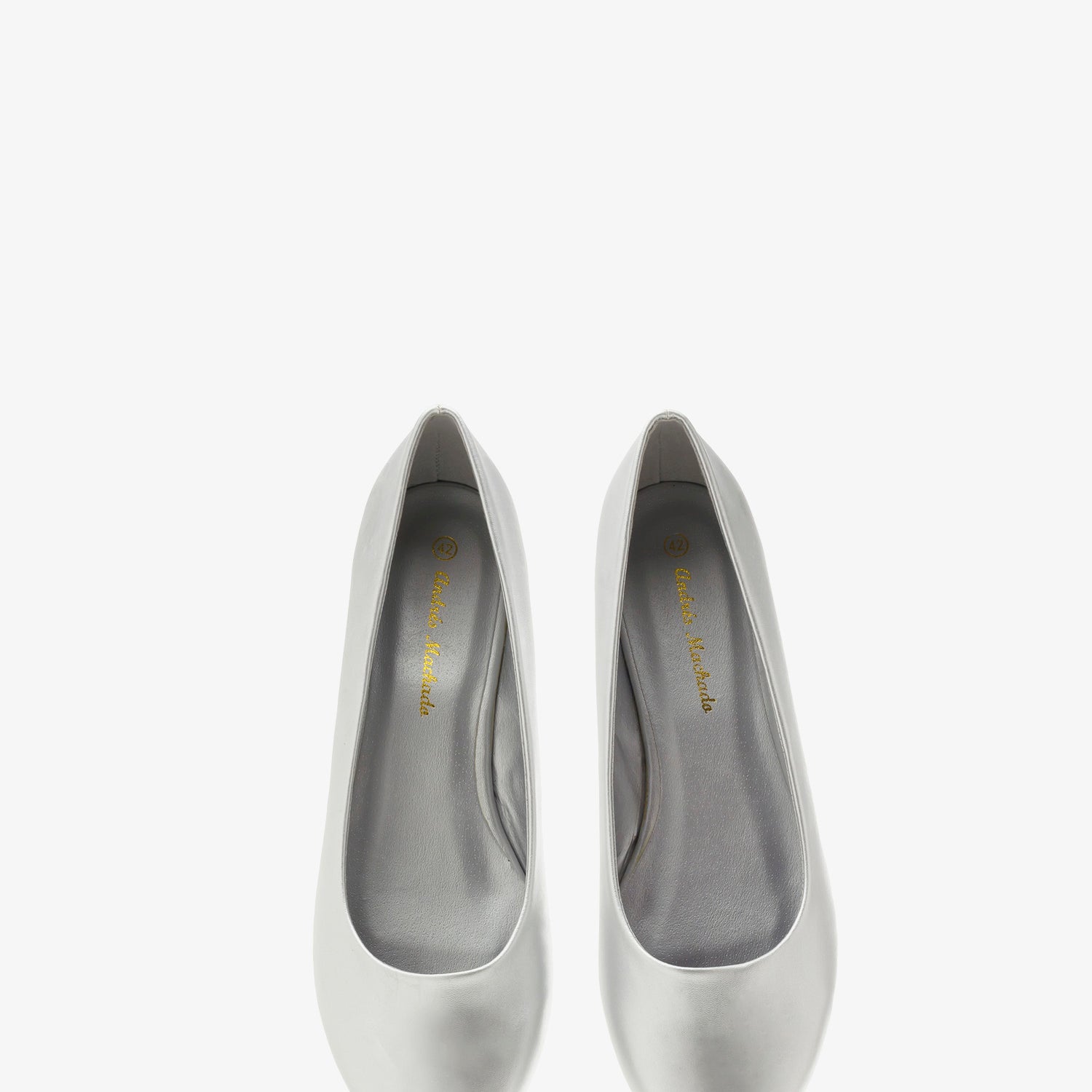Eleganckie klasyczne baleriny w kolorze delikatnego srebra. Okrągły nosek i czarna gumowa podeszwa z mini obcasem o wysokości 0,5 cm. Rozmiary plus od 42 do 46. Ten model jest większy, zaleca się wybór rozmiaru mniejszego niż zwykle.
