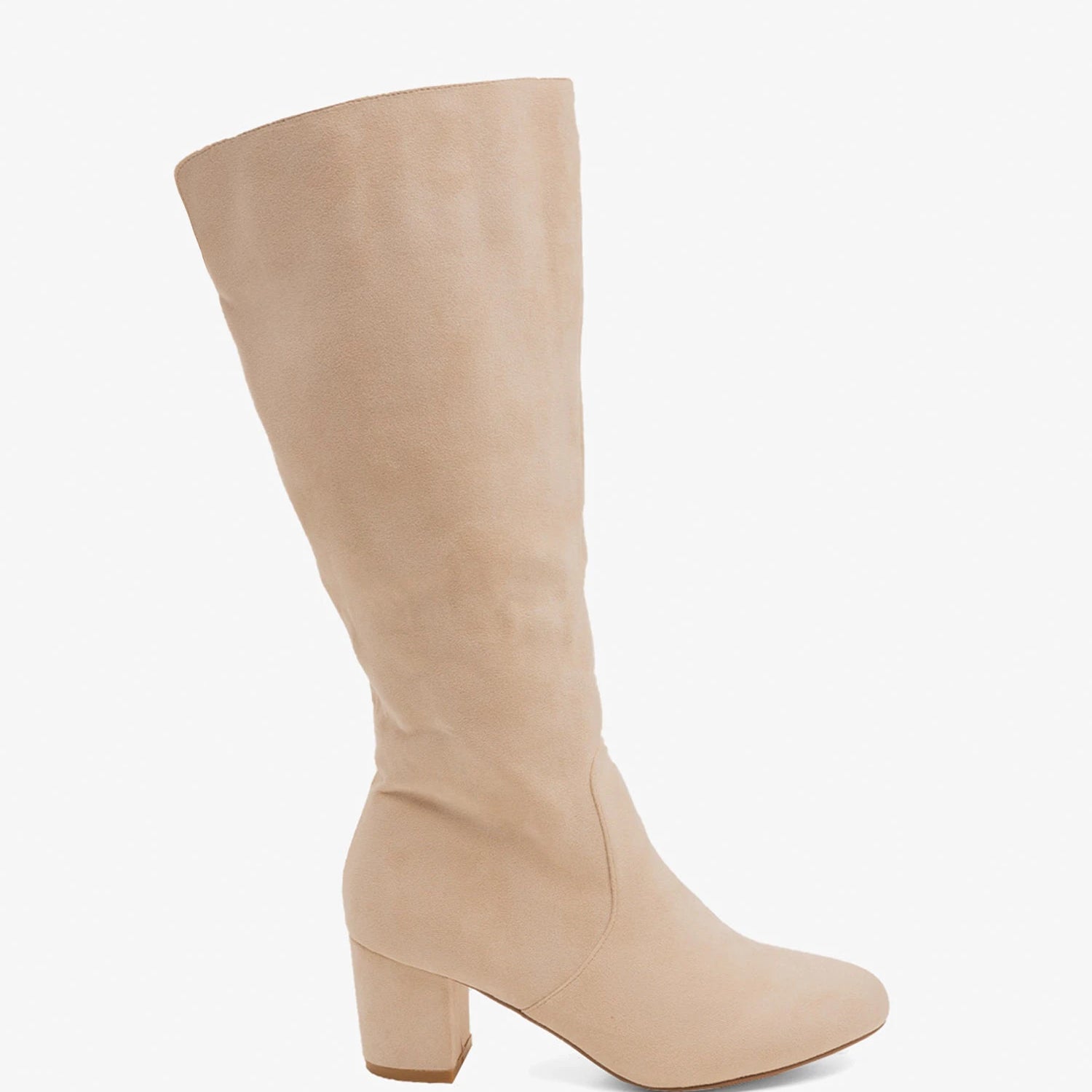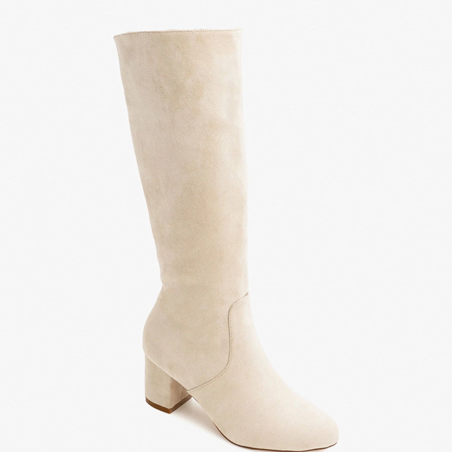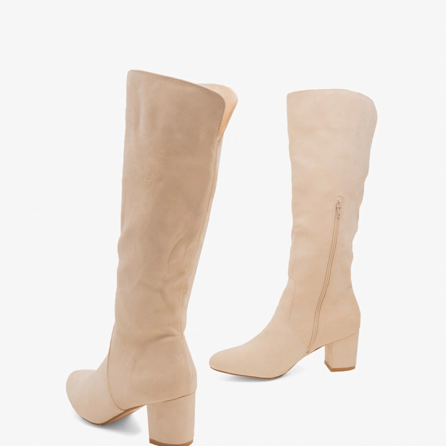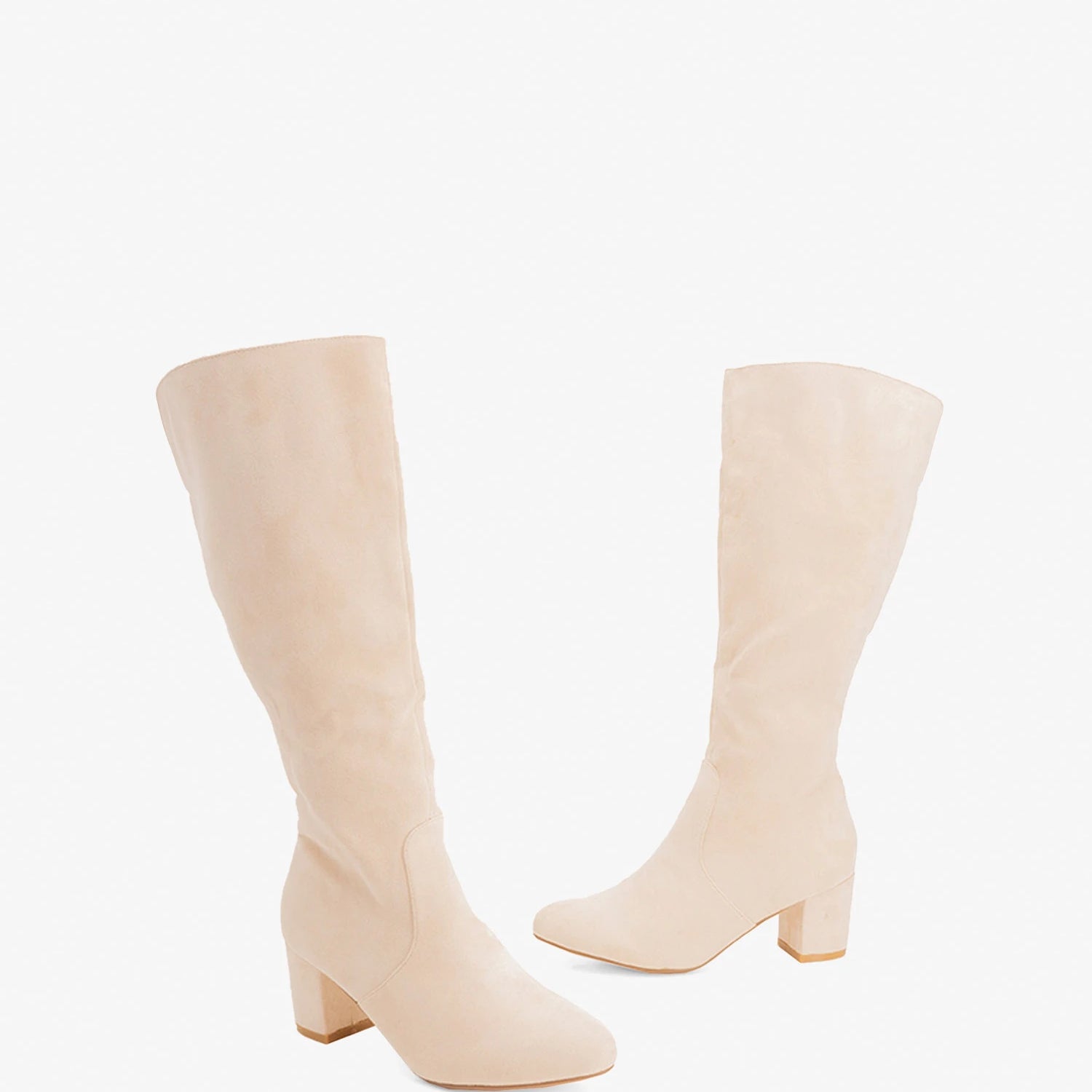 Wysokie buty zamszowe w kolorze kości słoniowej. Dopasowany zamek błyskawiczny po wewnętrznej stronie cholewki. Końcówka w kształcie migdała. Obcas o wysokości 5,5 cm pasujący do małych rozmiarów od 32 do 35. Obcas o wysokości 7 cm do dużych rozmiarów od 42 do 45.