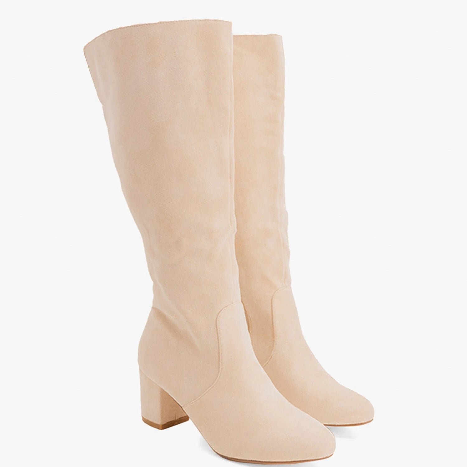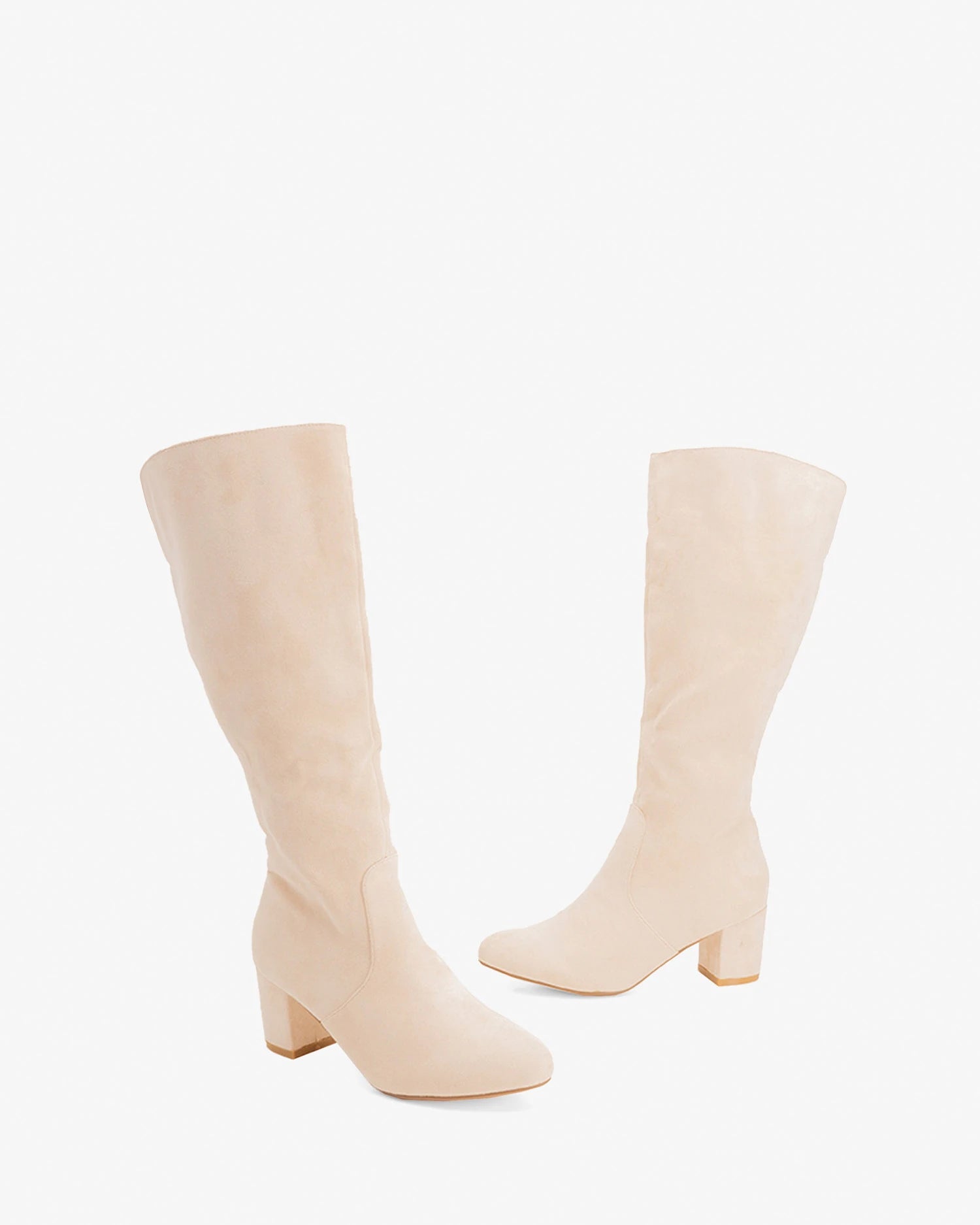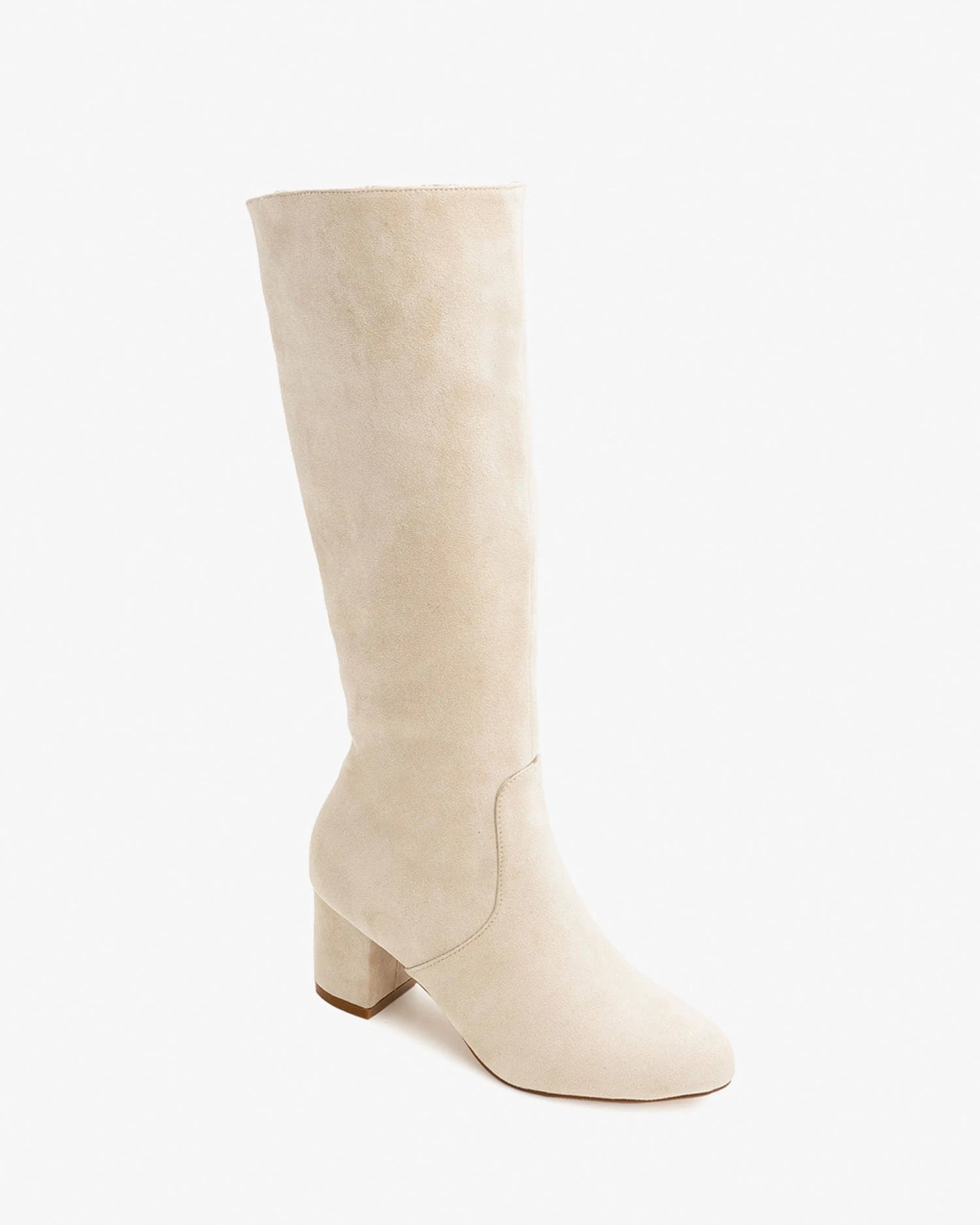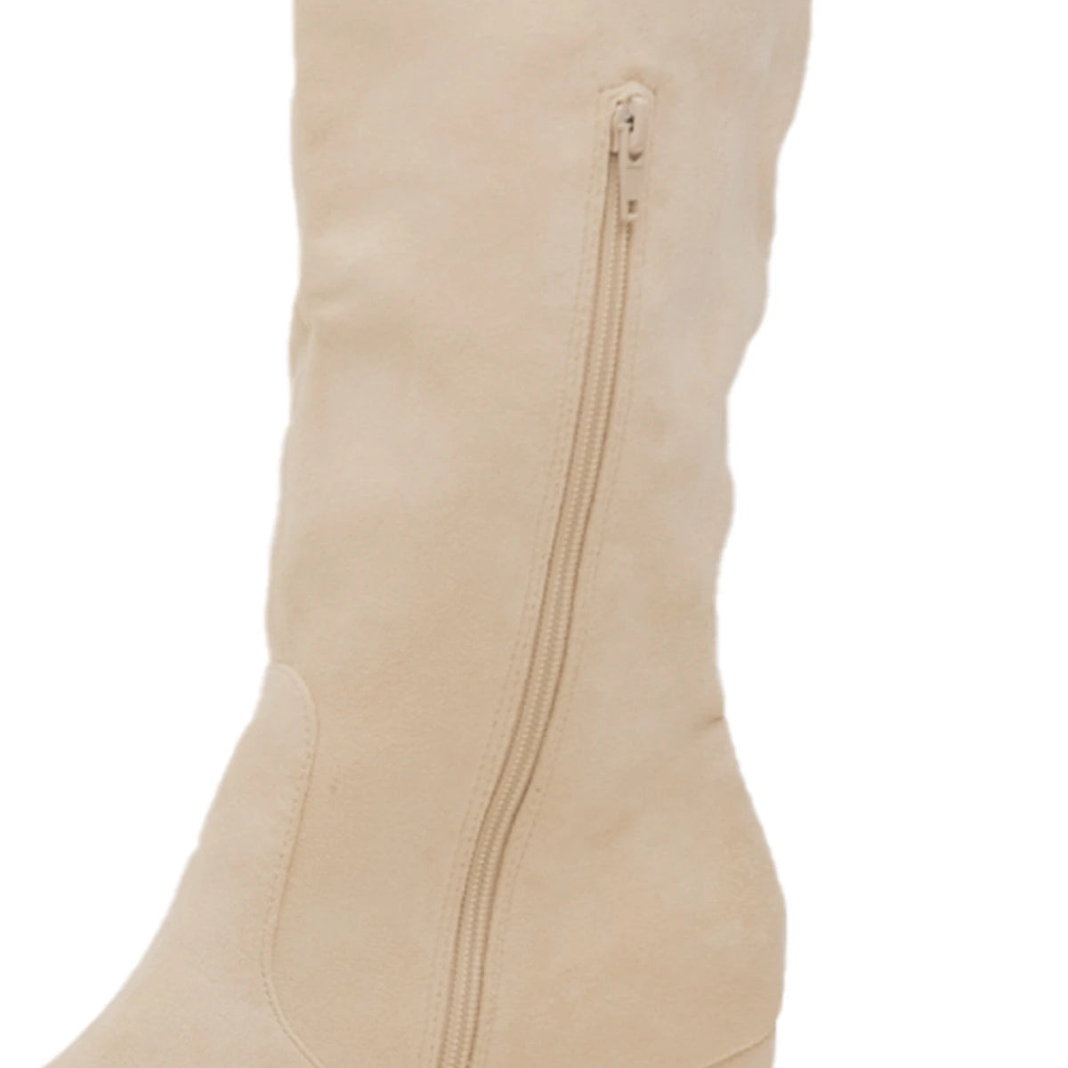 Wysokie buty zamszowe w kolorze kości słoniowej. Dopasowany zamek błyskawiczny po wewnętrznej stronie cholewki. Końcówka w kształcie migdała. Obcas o wysokości 5,5 cm pasujący do małych rozmiarów od 32 do 35. Obcas o wysokości 7 cm do dużych rozmiarów od 42 do 45.