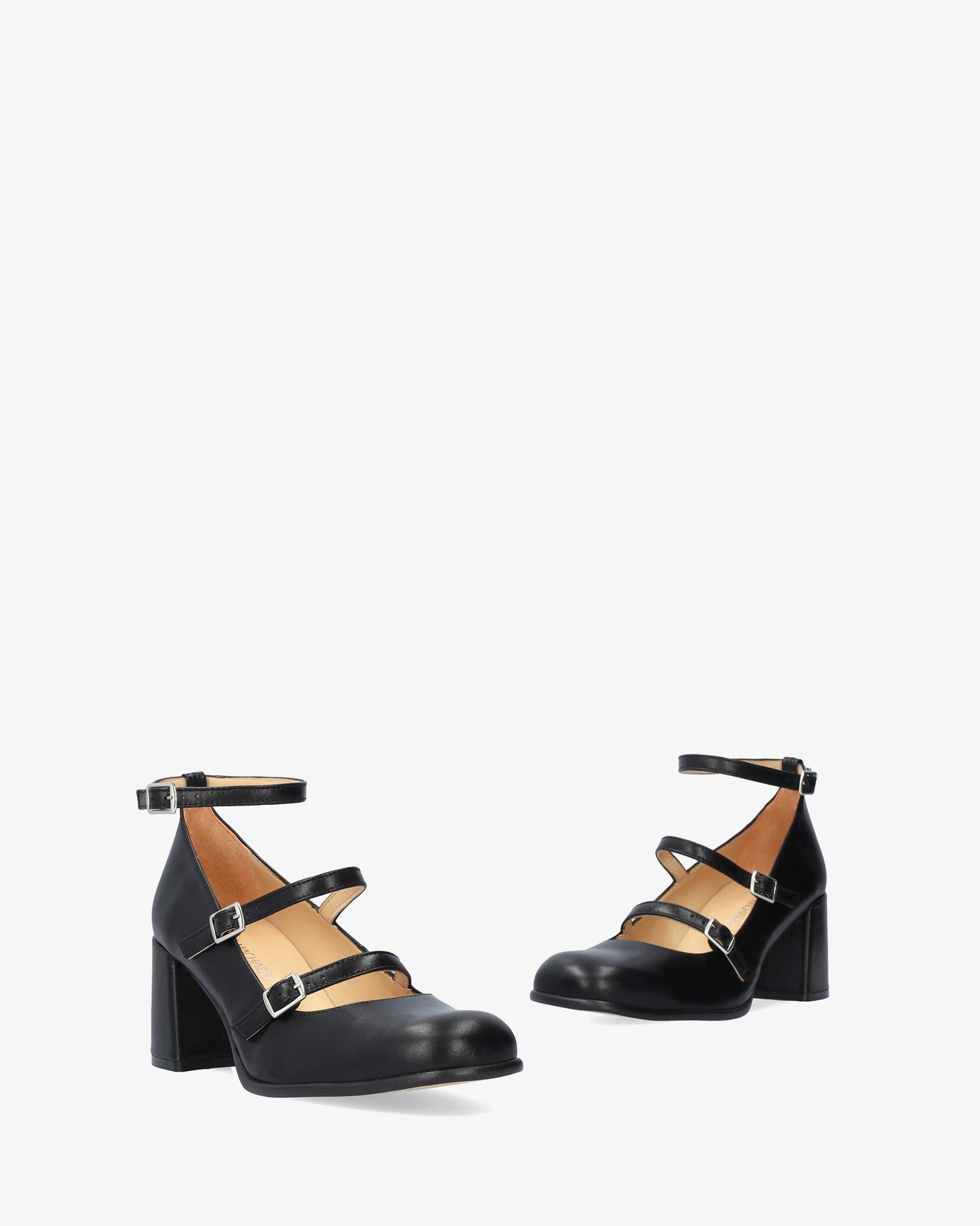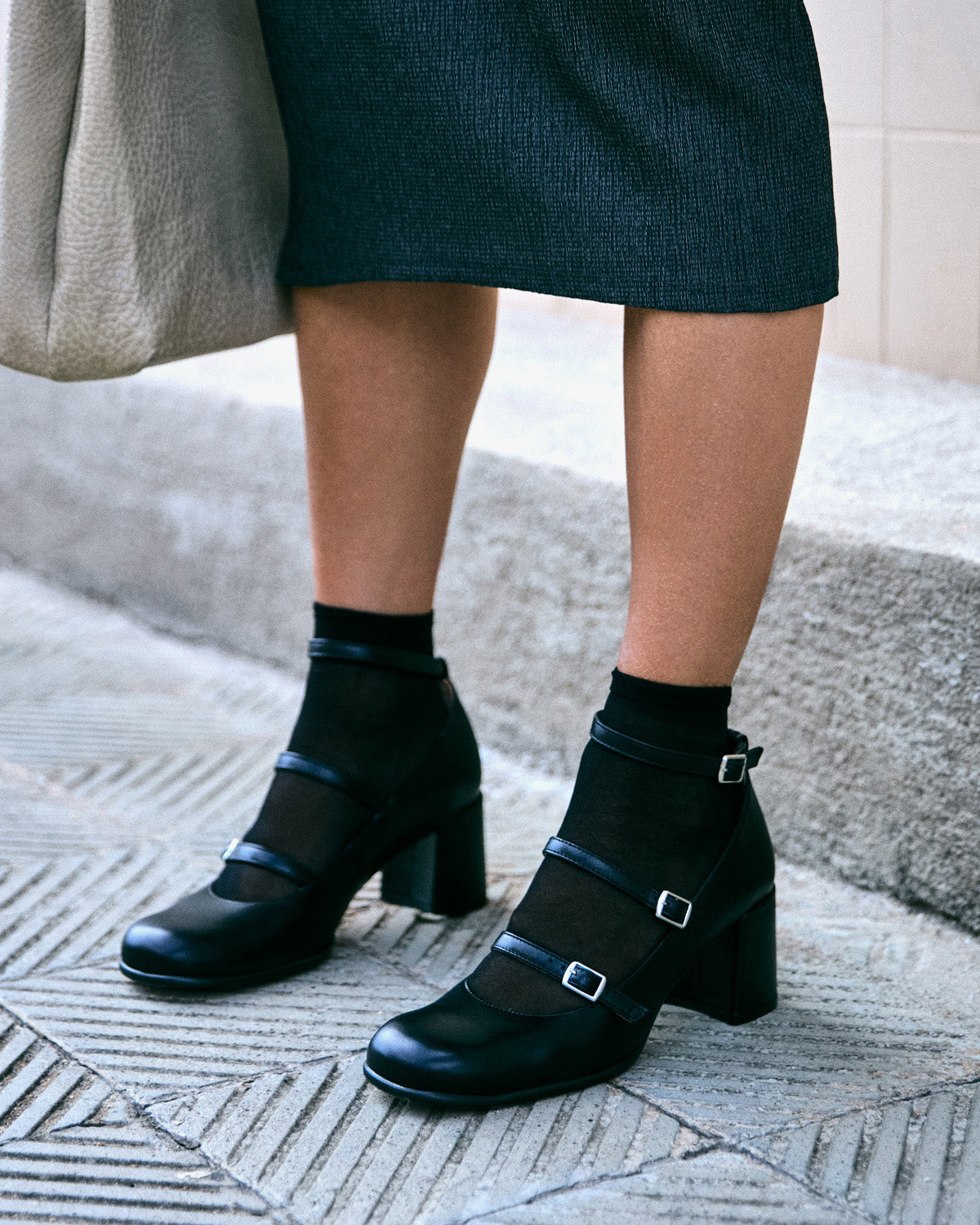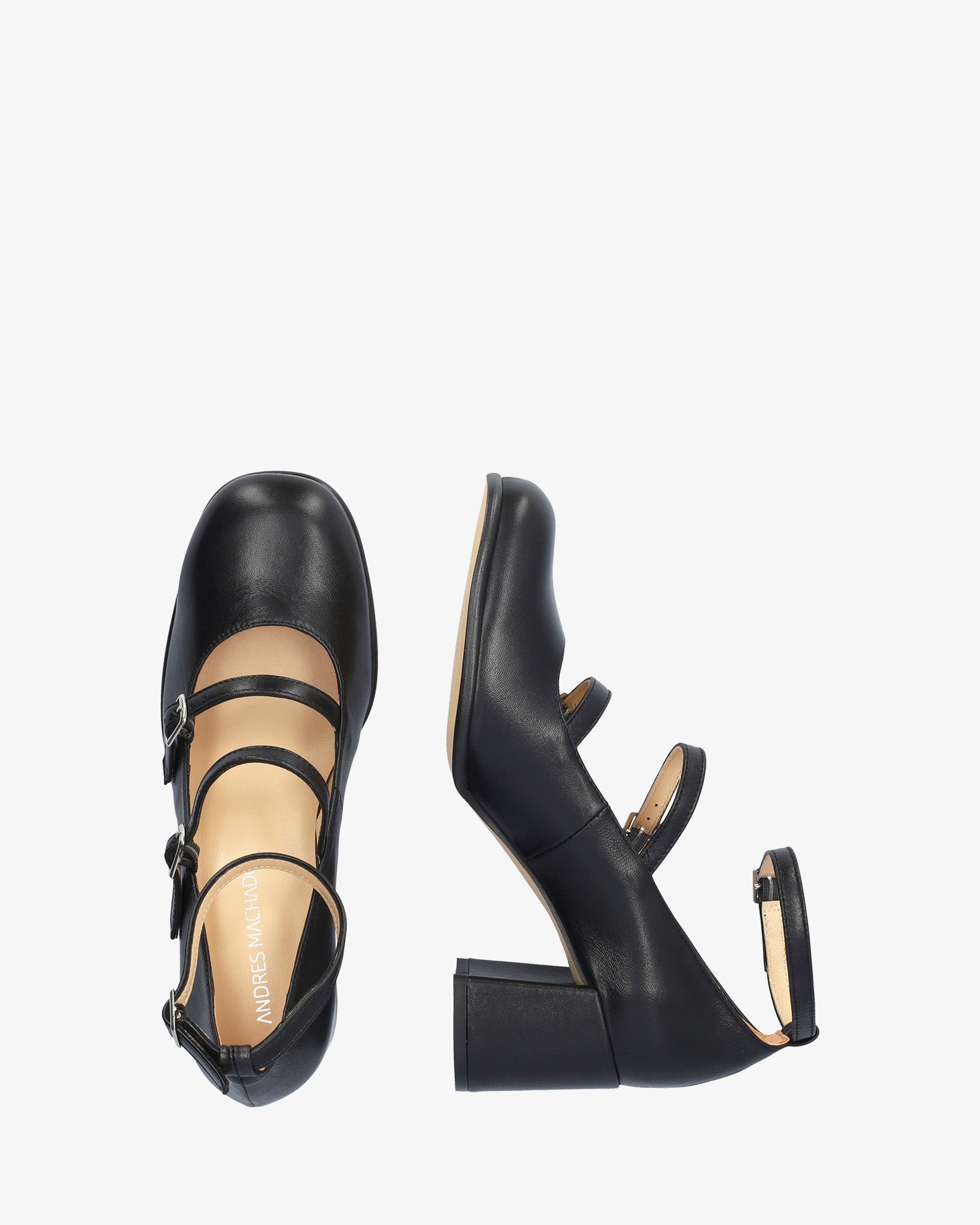 Buty w stylu Mary Jane, wykonane z czarnej skóry, z okrągłym noskiem i trzema paskami z pasującą gumką. Posiadają regulację w kostce i podbiciu, a także metalowe klamry po bokach. Kwadratowy obcas w tym samym kolorze, 6,5 cm dla małych rozmiarów od 32 do 35 i 7 cm dla dużych rozmiarów od 42 do 45. Wyprodukowano w Hiszpanii.