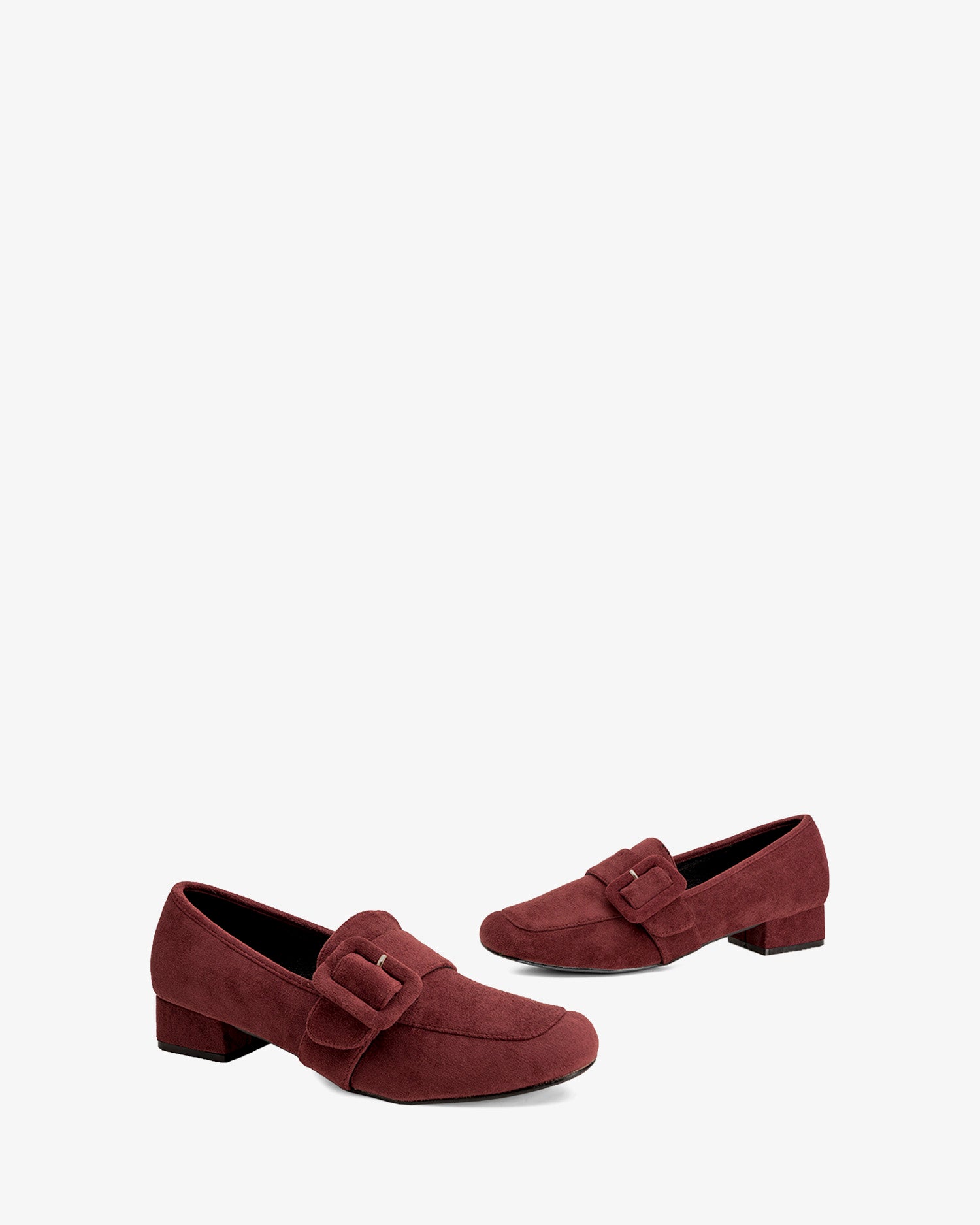 Buty w stylu mokasyna, wykonane z bordowego zamszu. Fragment szerokiego, dopasowanego paska z prostokątną klamrą w tym samym kolorze na podbiciu. Ozdobne przeszycia nicią w tym samym kolorze na palcach. Wykończenie w formie kwadratowego noska. Obcas o szerokości 3 cm, podszyty materiałem w tym samym kolorze dla małych rozmiarów od 32 do 35. Obcas o szerokości 3 cm dla dużych rozmiarów od 42 do 45.