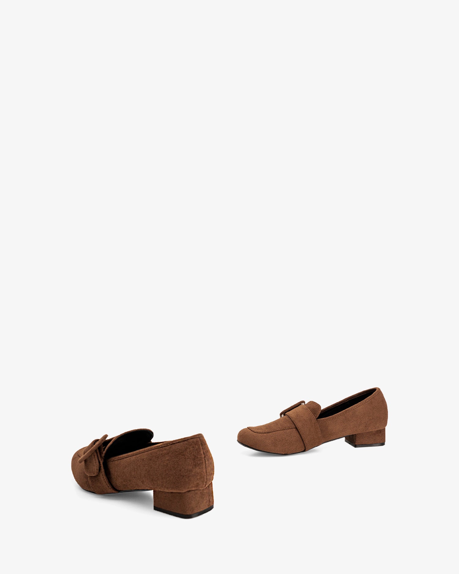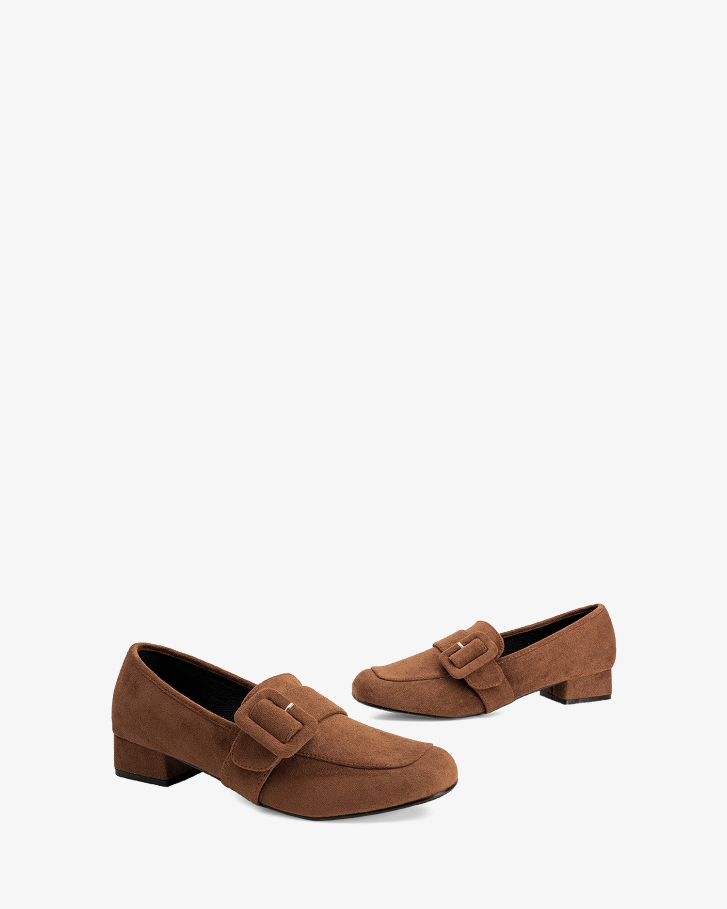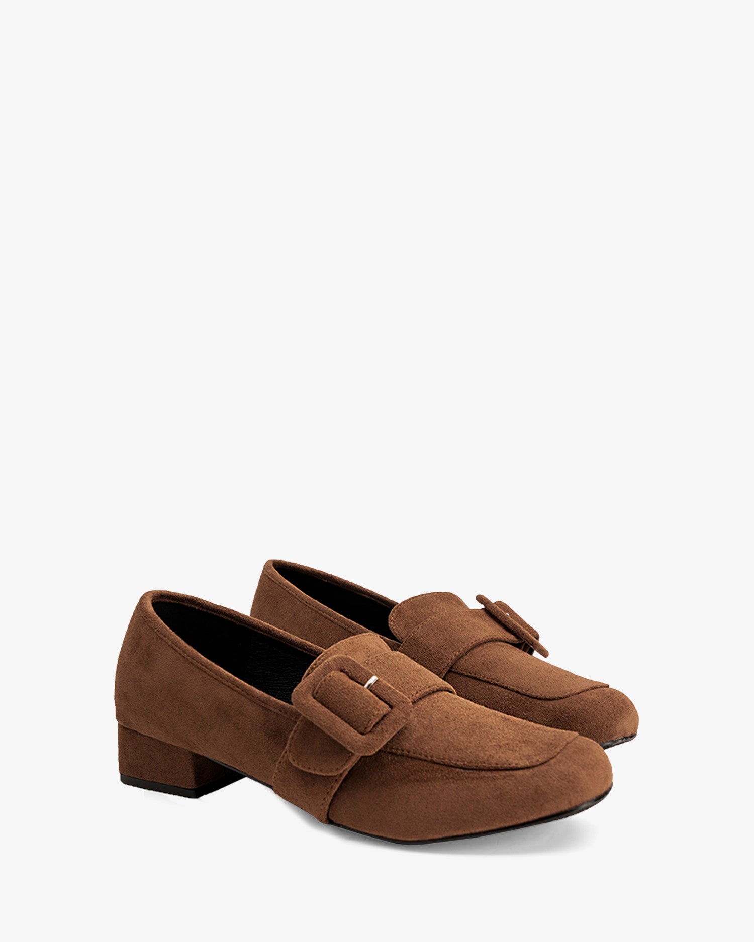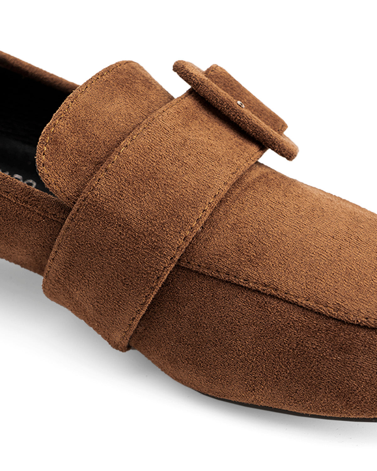 Buty w stylu mokasyna, wykonane z brązowego zamszu. Fragment szerokiego, dopasowanego paska z prostokątną klamrą w tym samym kolorze na podbiciu. Ozdobne przeszycia nicią w tym samym kolorze na palcach. Wykończenie w formie kwadratowego noska. Obcas o szerokości 3 cm, podszyty materiałem w tym samym kolorze dla małych rozmiarów od 32 do 35. Obcas o szerokości 3 cm dla dużych rozmiarów od 42 do 45.