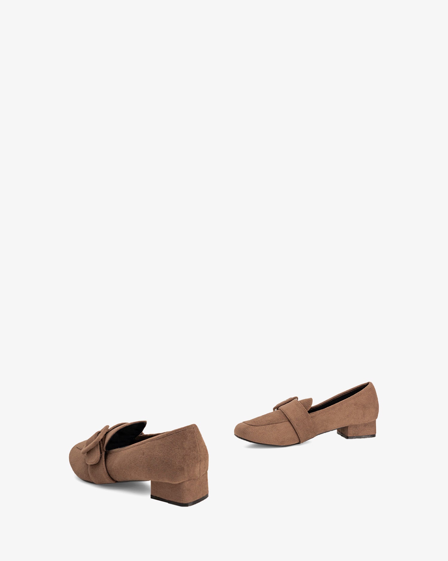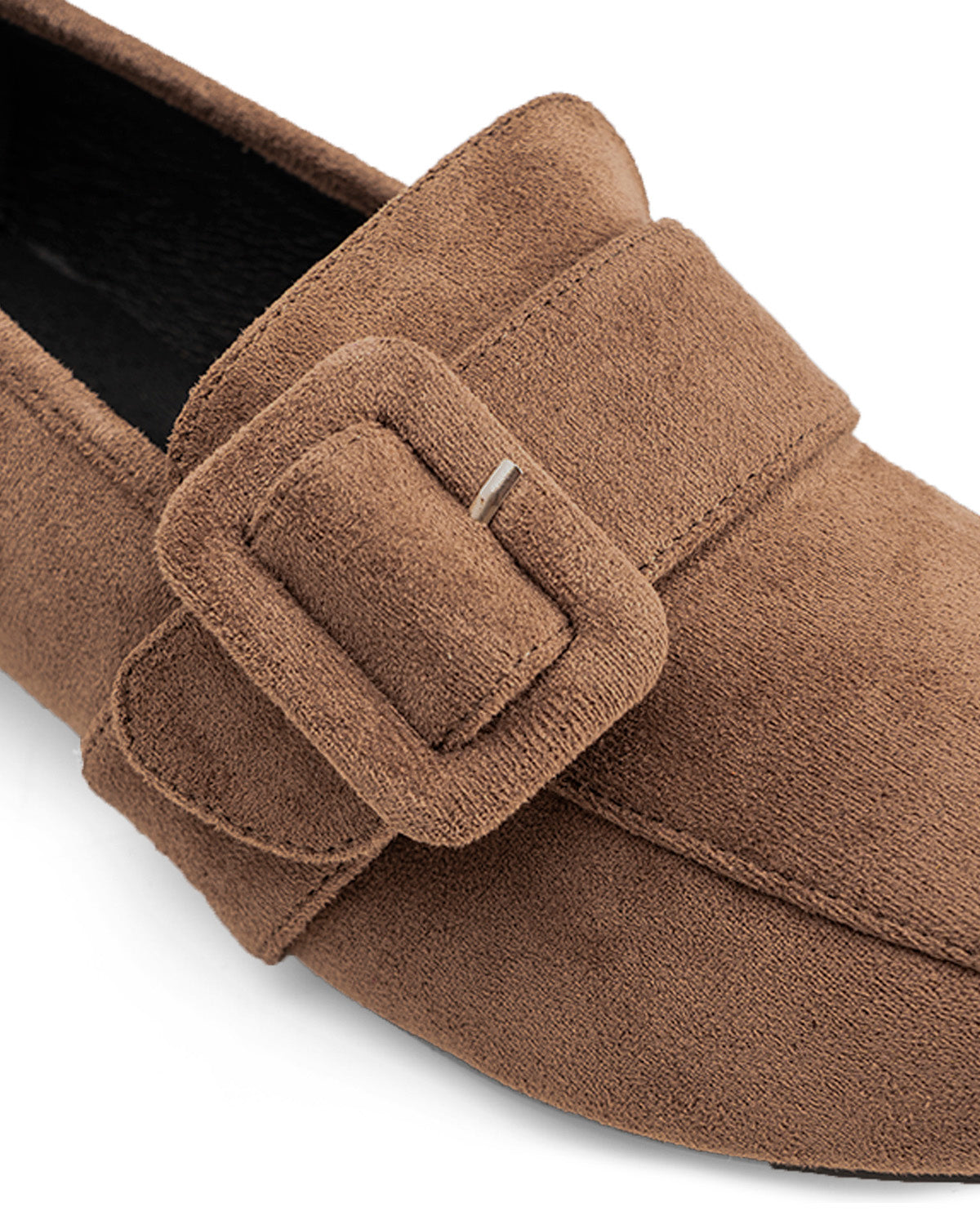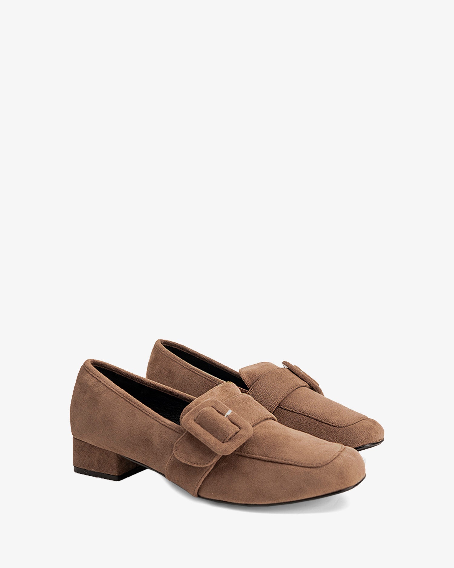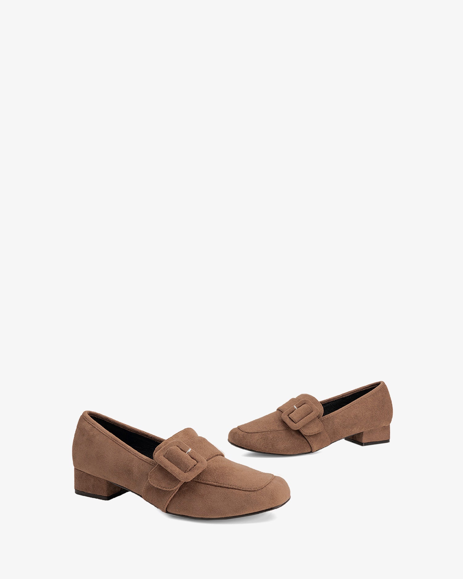 Buty w stylu mokasyna, wykonane ze zamszu w kolorze sieny. Fragment szerokiego, dopasowanego paska z prostokątną klamrą w tym samym kolorze na podbiciu. Ozdobne przeszycia nicią w tym samym kolorze na palcach. Wykończenie w formie kwadratowego noska. Obcas o szerokości 3 cm, podszyty materiałem w tym samym kolorze dla małych rozmiarów od 32 do 35. Obcas o szerokości 3 cm dla dużych rozmiarów od 42 do 45.