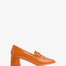 Buty w stylu mokasynów, wykonane z lakierowanej skóry w kolorze wielbłądzim. Złote aplikacje i ozdobne przeszycia z pasującą nicią na palcach. Wykończenie w formie kwadratowego noska. Obcas o wysokości 5,5 cm pasujący do małych rozmiarów od 32 do 35. Obcas o wysokości 5,5 cm do dużych rozmiarów od 42 do 45.