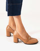 Miękkie mokasyny w kolorze wielbłądzim. Język i maska na oczy w tym samym odcieniu z delikatnymi złotymi zdobieniami w kształcie rurek na podbiciu. Zaokrąglone wykończenie końcówki. Obcas o szerokości 7 cm, w tym samym kolorze, dla małych rozmiarów od 32 do 35. Obcas o szerokości 8 cm dla dużych rozmiarów od 42 do 45. Ten model może mieć odchylenia od standardowego wymiaru; zalecamy sprawdzenie grubości wkładki lub podeszwy wewnętrznej.