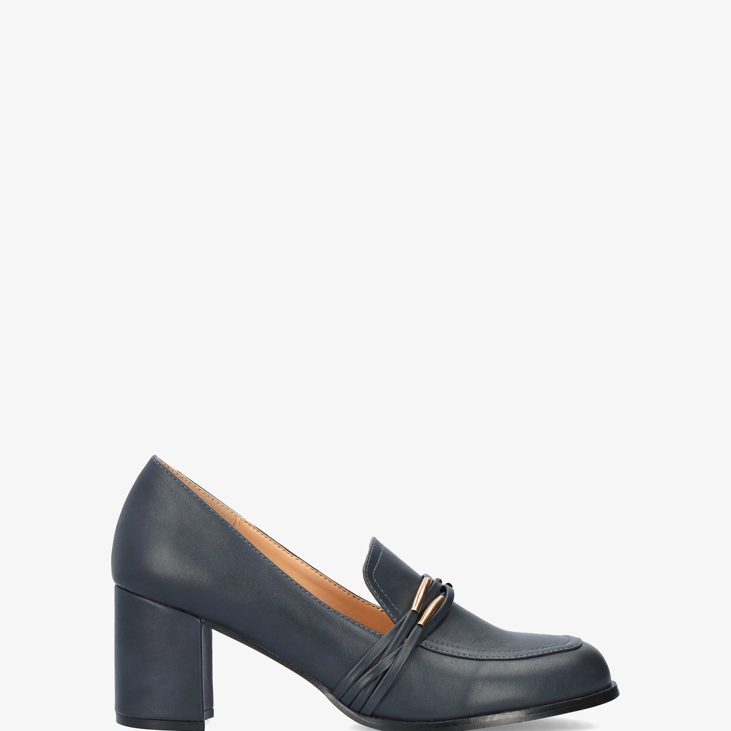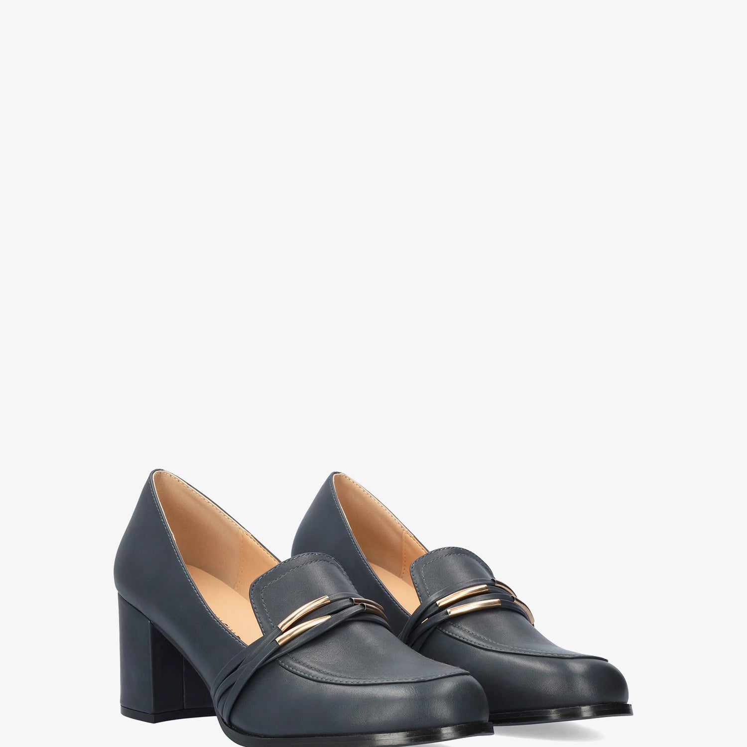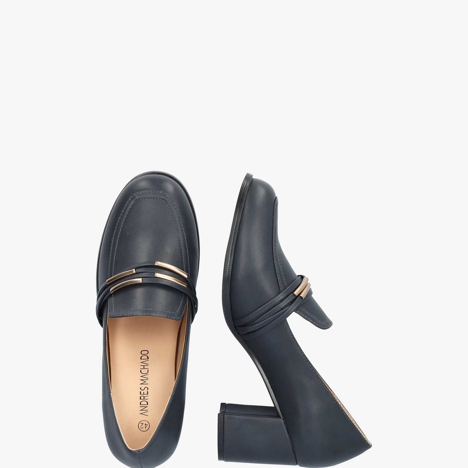 Miękki mokasyn w kolorze granatowym. Język i maska na oczy w tym samym odcieniu z delikatnymi złotymi zdobieniami w kształcie rurek na podbiciu. Zaokrąglone wykończenie końcówki. Obcas o szerokości 7 cm, w tym samym kolorze, dla małych rozmiarów od 32 do 35. Obcas o szerokości 8 cm dla dużych rozmiarów od 42 do 45. Ten model może mieć odchylenia od standardowego wymiaru; zalecamy sprawdzenie grubości wkładki lub podeszwy wewnętrznej.
