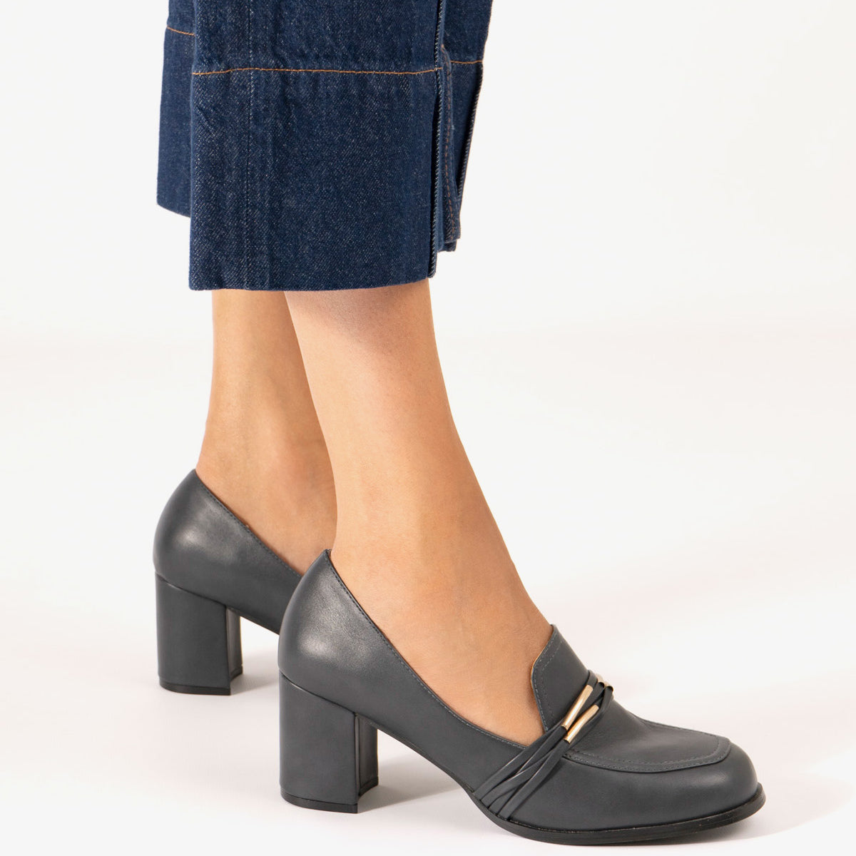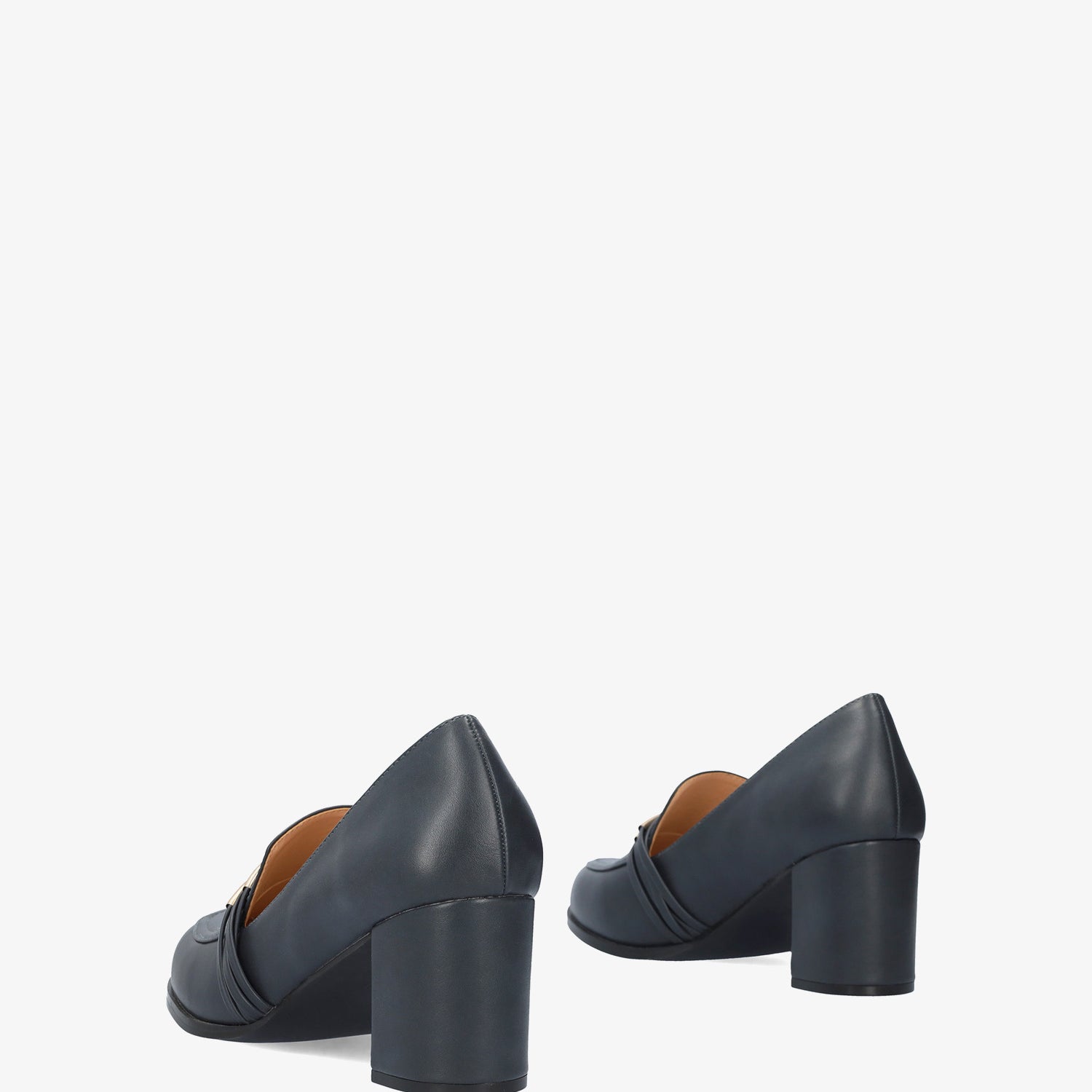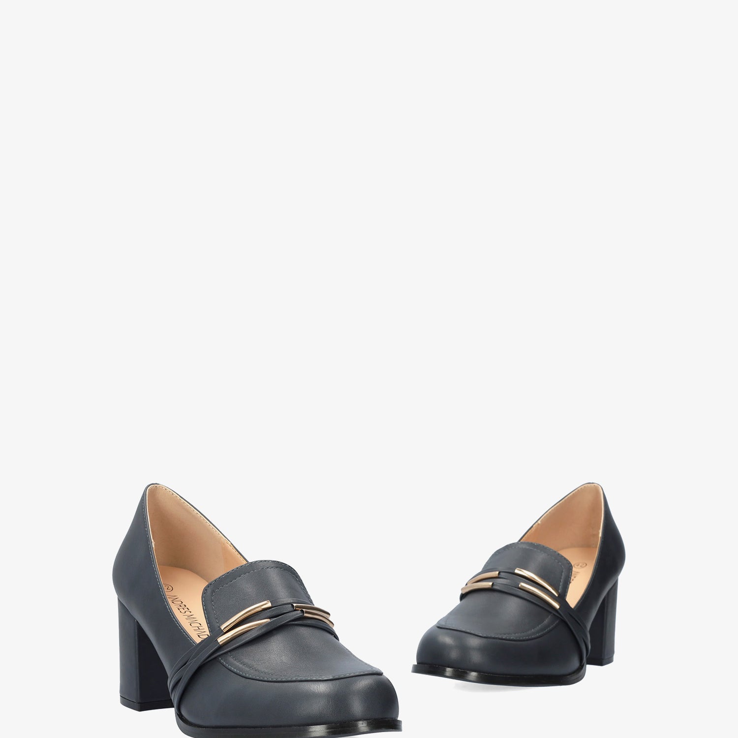Miękki mokasyn w kolorze granatowym. Język i maska na oczy w tym samym odcieniu z delikatnymi złotymi zdobieniami w kształcie rurek na podbiciu. Zaokrąglone wykończenie końcówki. Obcas o szerokości 7 cm, w tym samym kolorze, dla małych rozmiarów od 32 do 35. Obcas o szerokości 8 cm dla dużych rozmiarów od 42 do 45. Ten model może mieć odchylenia od standardowego wymiaru; zalecamy sprawdzenie grubości wkładki lub podeszwy wewnętrznej.