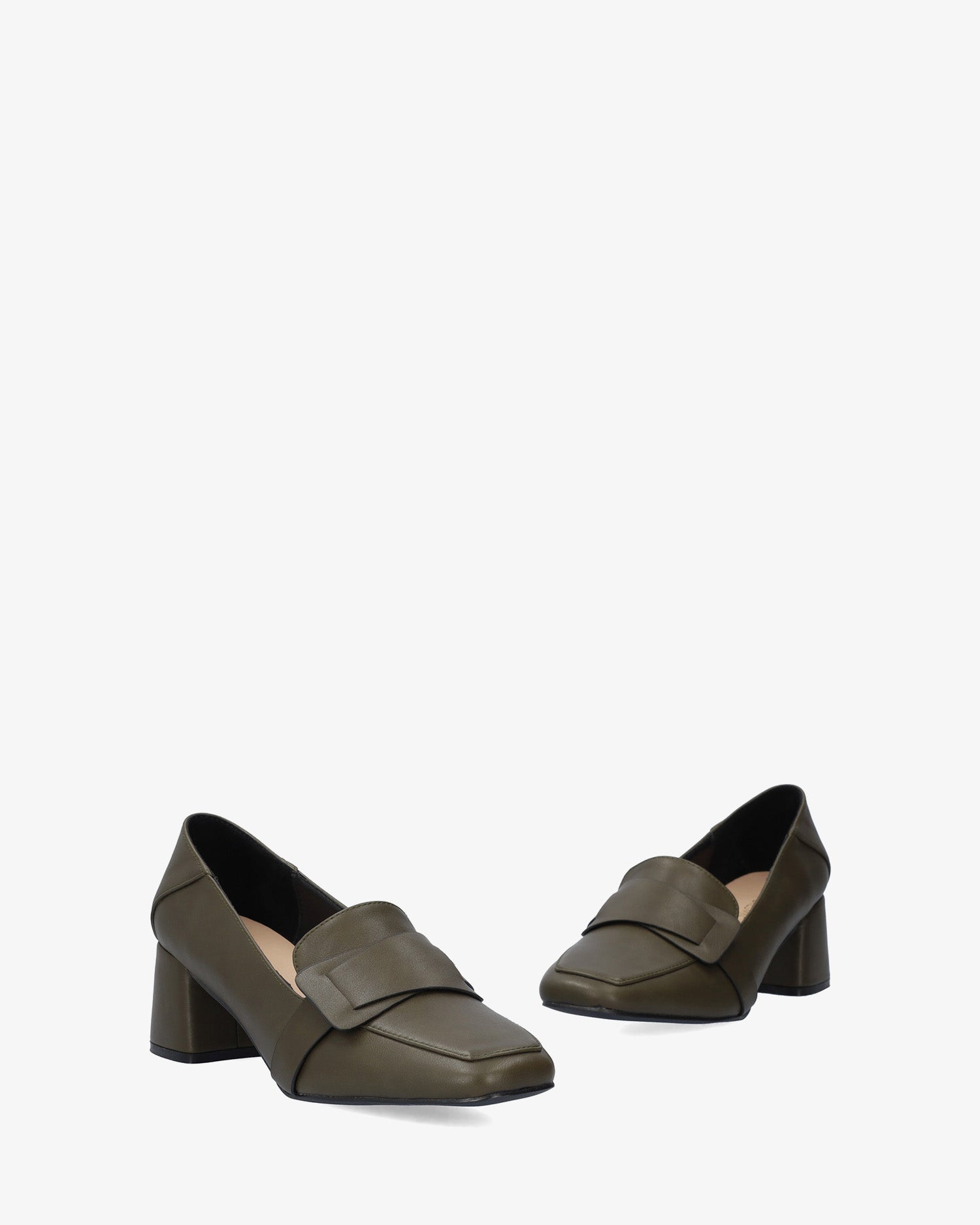 Buty w stylu mokasyna, w delikatnym zielonym kolorze. Detale języka i przeplatane paski na podbiciu w tym samym odcieniu. Ozdobne przeszycia z użyciem dopasowanej nici na palcach i pięcie. Wykończenie w formie kwadratowego noska. Obcas o szerokości 5,5 cm, podszyty materiałem w tym samym kolorze dla małych rozmiarów od 32 do 35. Obcas o szerokości 6 cm dla dużych rozmiarów od 42 do 45.