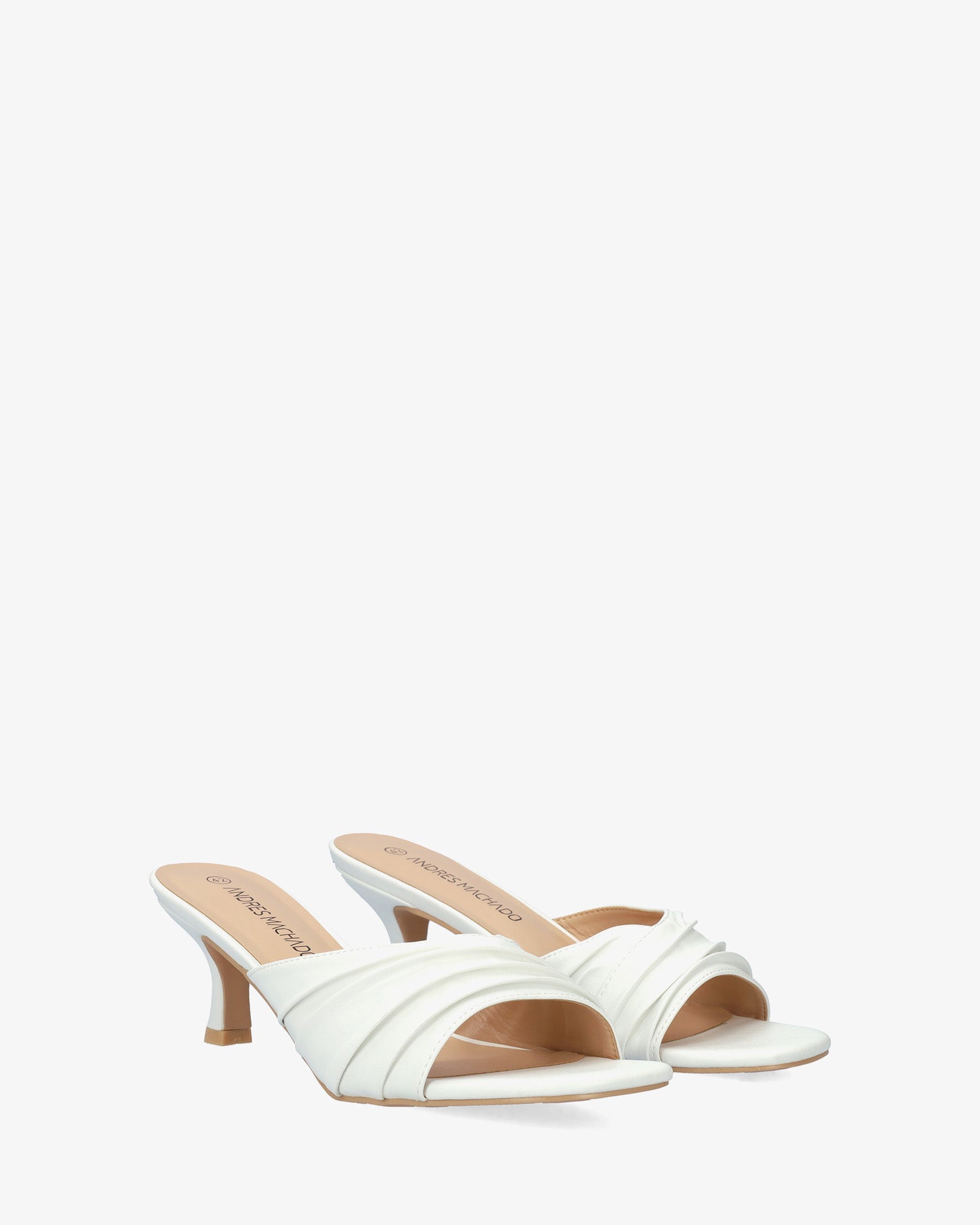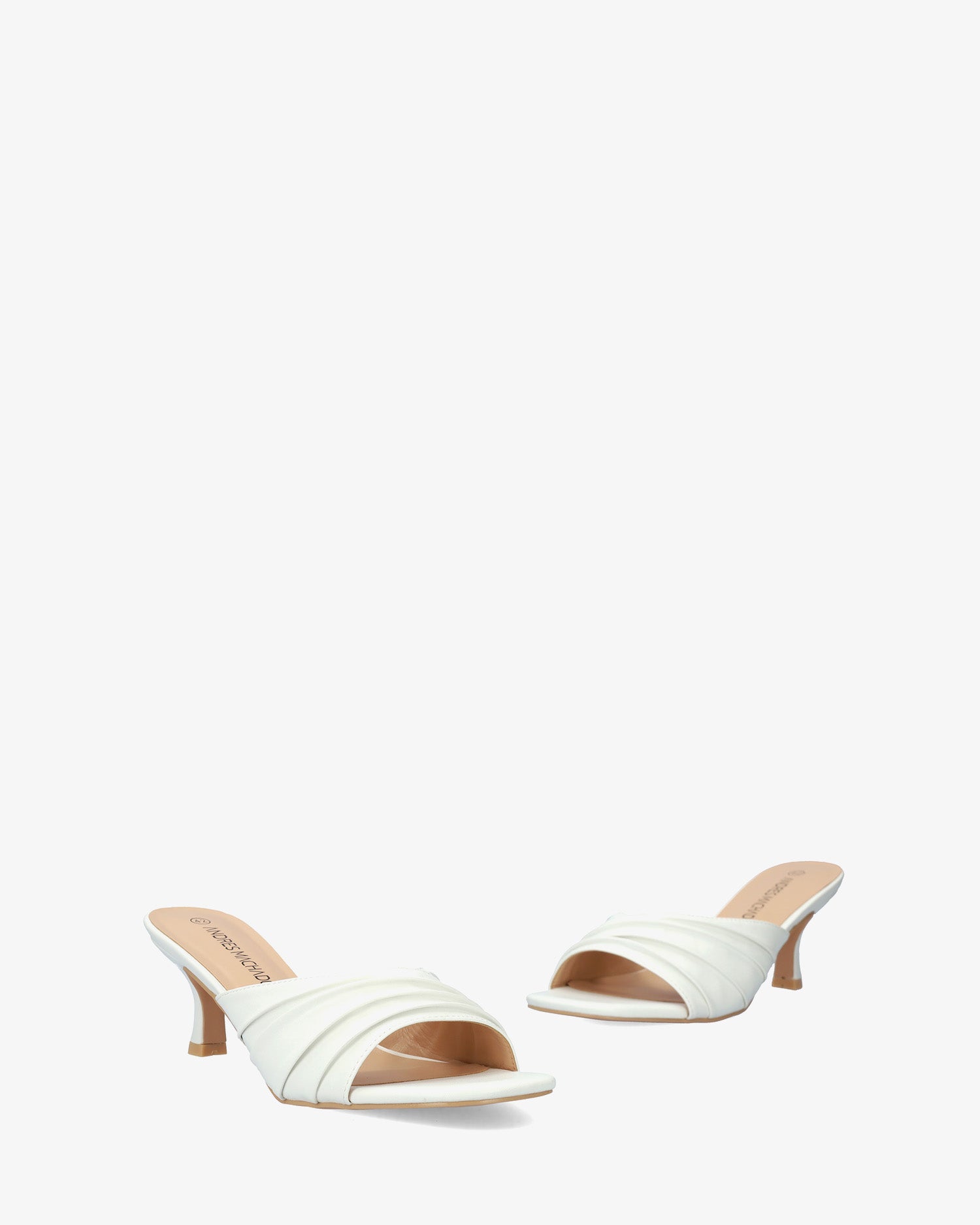 Muły w miękkiej bieli na obcasie typu kaczuszka. Fason z odkrytymi plecami i szerokim, drapowanym paskiem z przodu. Otwarte, kwadratowe palce. Obcas o wysokości 6,5 cm dla małych rozmiarów od 32 do 35. Obcas o wysokości 7 cm dla dużych rozmiarów od 42 do 45.