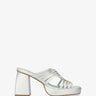 Muły w delikatnym srebrnym kolorze, na szerokim kwadratowym obcasie i platformie. Fason z odkrytym tyłem i wieloma cienkimi, splecionymi paskami na podbiciu. Otwarte, kwadratowe palce. Obcas o wysokości 10,5 cm i platforma o wysokości 2,5 cm dla małych rozmiarów od 32 do 35. Obcas o wysokości 11 cm i platforma o wysokości 2,5 cm dla dużych rozmiarów od 42 do 45.