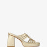 Muły w delikatnym złotym kolorze, na szerokim kwadratowym obcasie i platformie. Fason z odkrytym tyłem i wieloma cienkimi, splecionymi paskami na podbiciu. Otwarte, kwadratowe palce. Obcas o wysokości 10,5 cm i platforma o wysokości 2,5 cm dla małych rozmiarów od 32 do 35. Obcas o wysokości 11 cm i platforma o wysokości 2,5 cm dla dużych rozmiarów od 42 do 45.