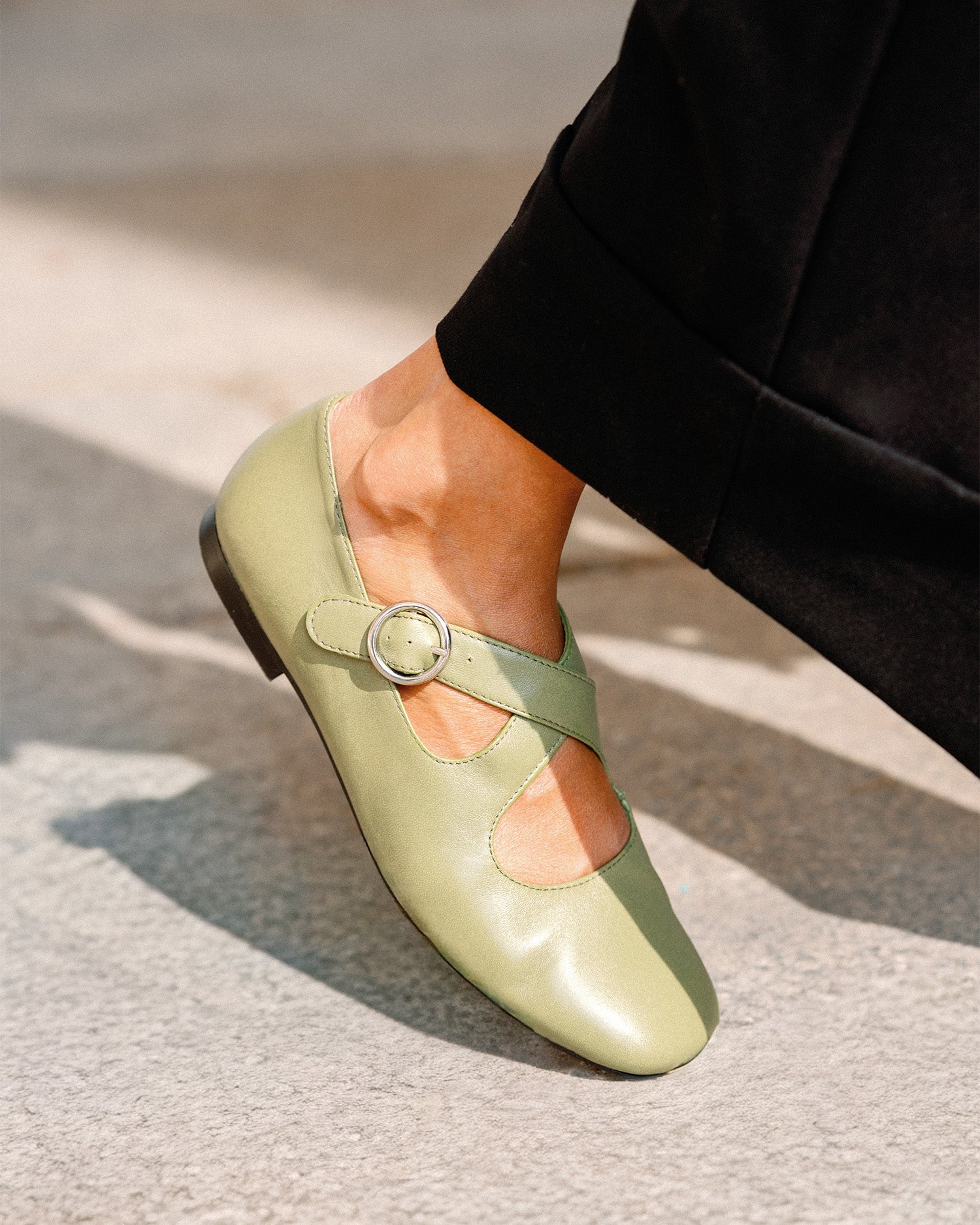 Płaskie, skórzane baleriny. Wykończone kwadratowym noskiem, posiadają dwa szerokie, pasujące do siebie paski krzyżujące się na podbiciu oraz zapięcie na klamrę. Dostępne w małych rozmiarach, od 32 do 35, oraz w dużych, od 42 do 45. Wyprodukowano w Hiszpanii.