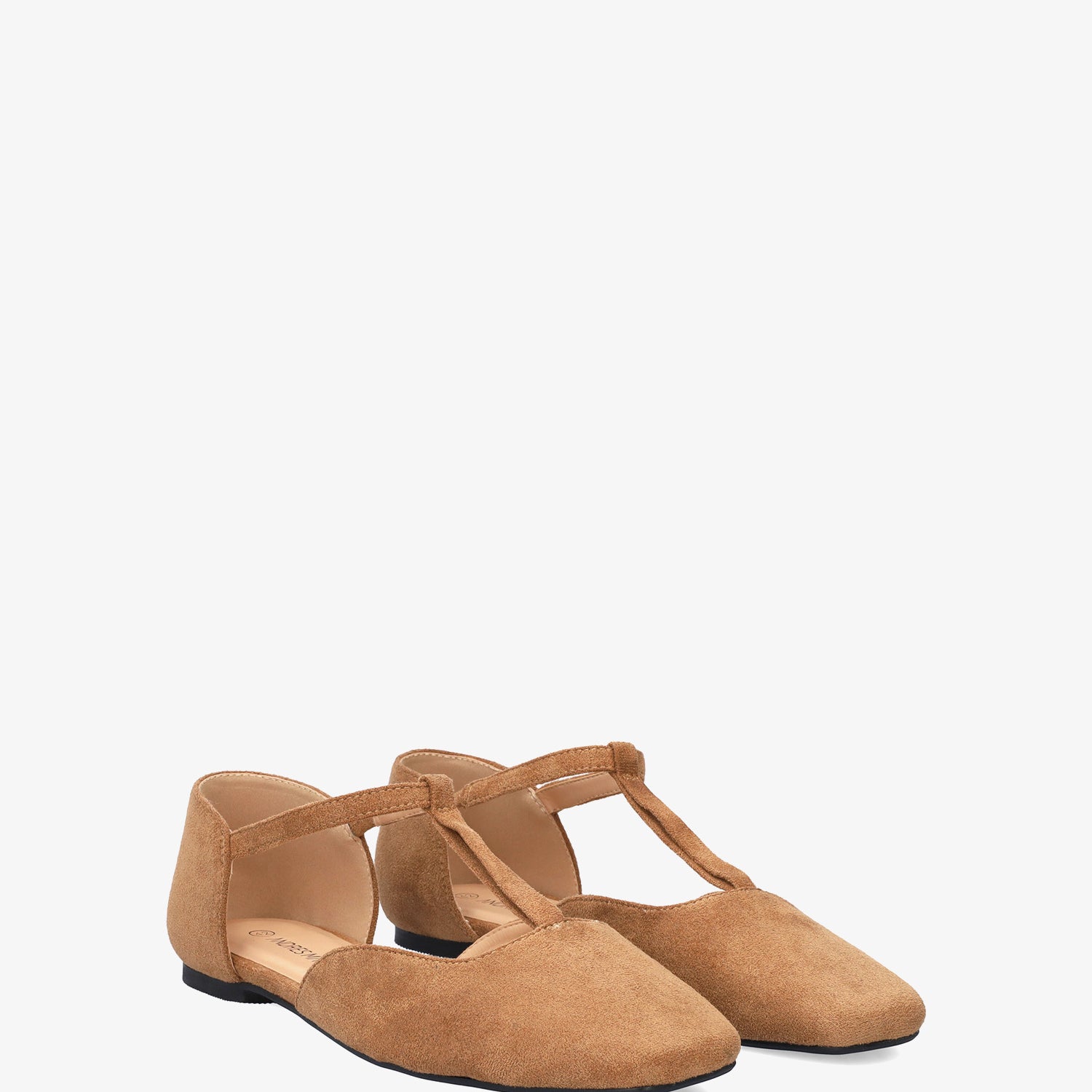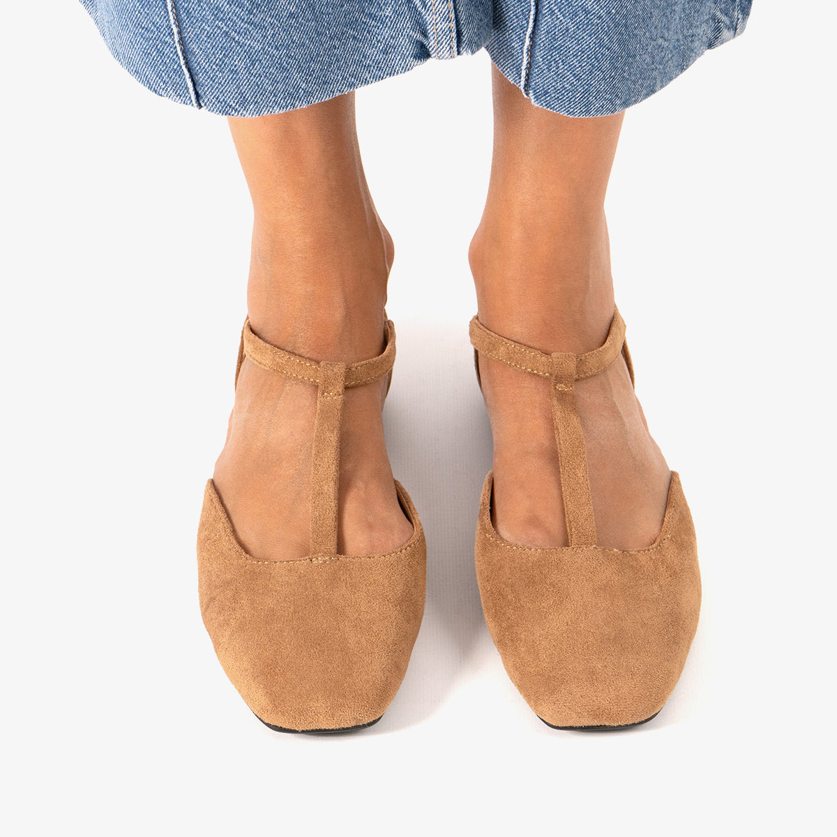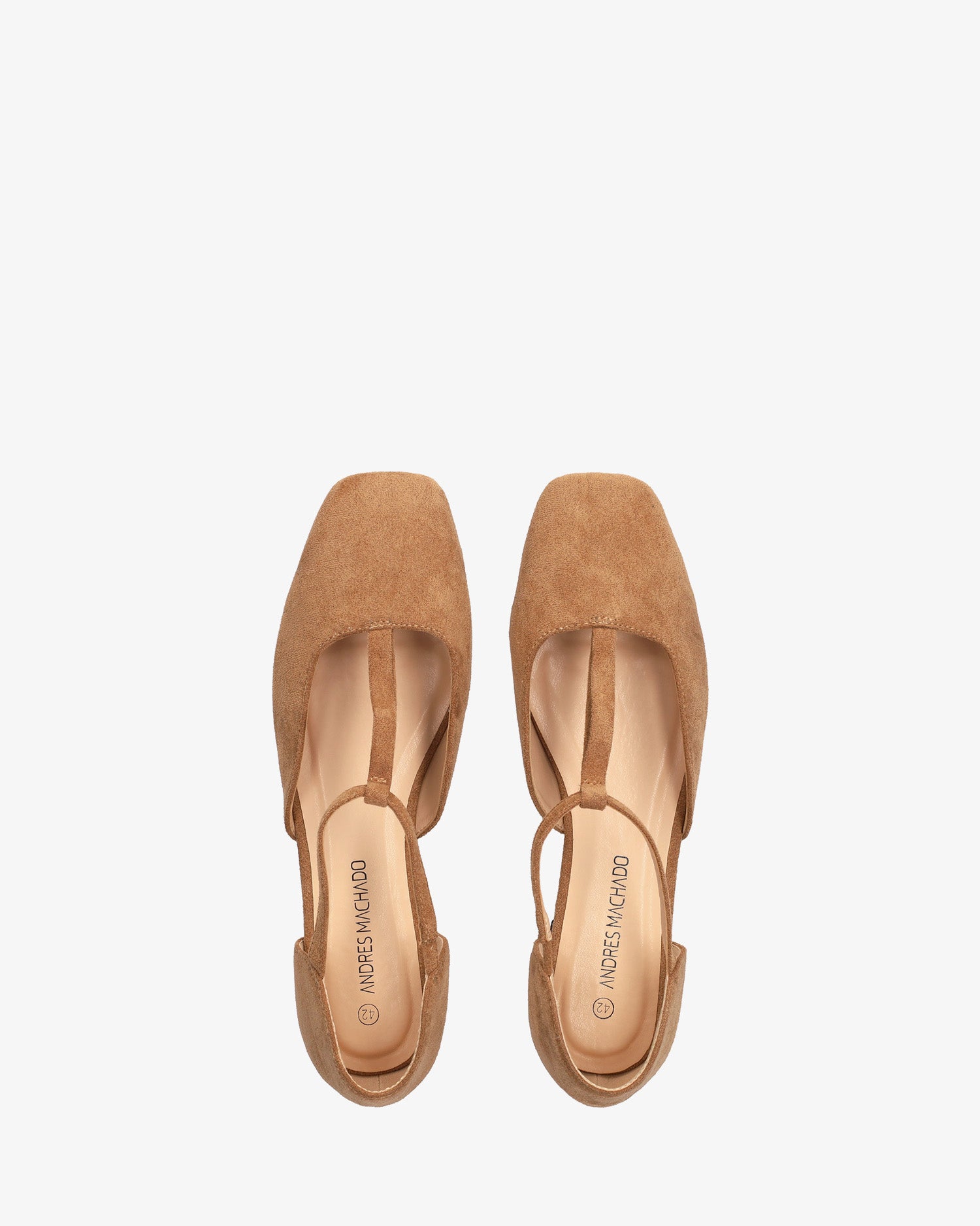 Baleriny na płaskim obcasie ze skóry zamszowej w kolorze brązowym. Konstrukcja wykończona zamkniętym, kwadratowym noskiem, z centralnym paskiem w kształcie odwróconej litery T na podbiciu z elastyczną wstawką, dla lepszego wsparcia kostki. Dostępne w dużych rozmiarach od 42 do 46.