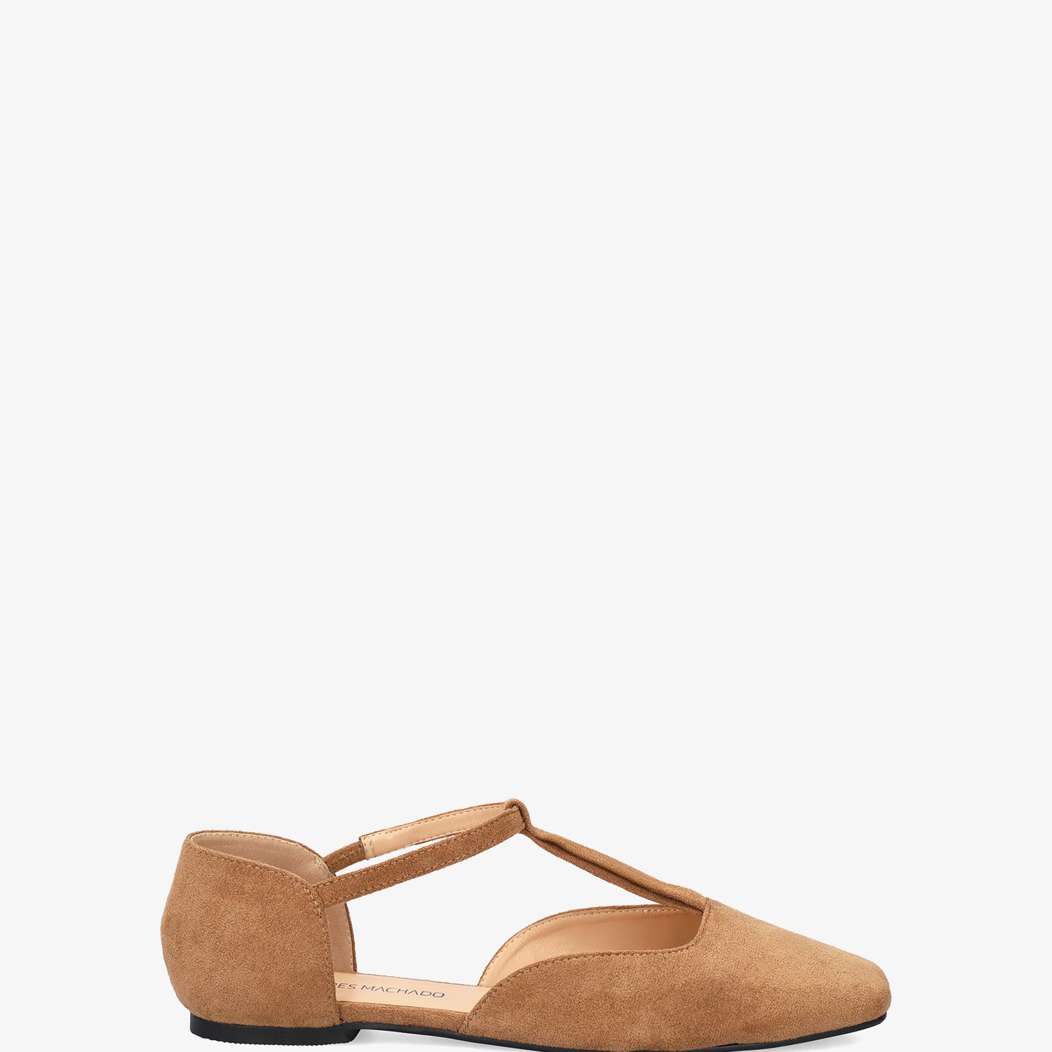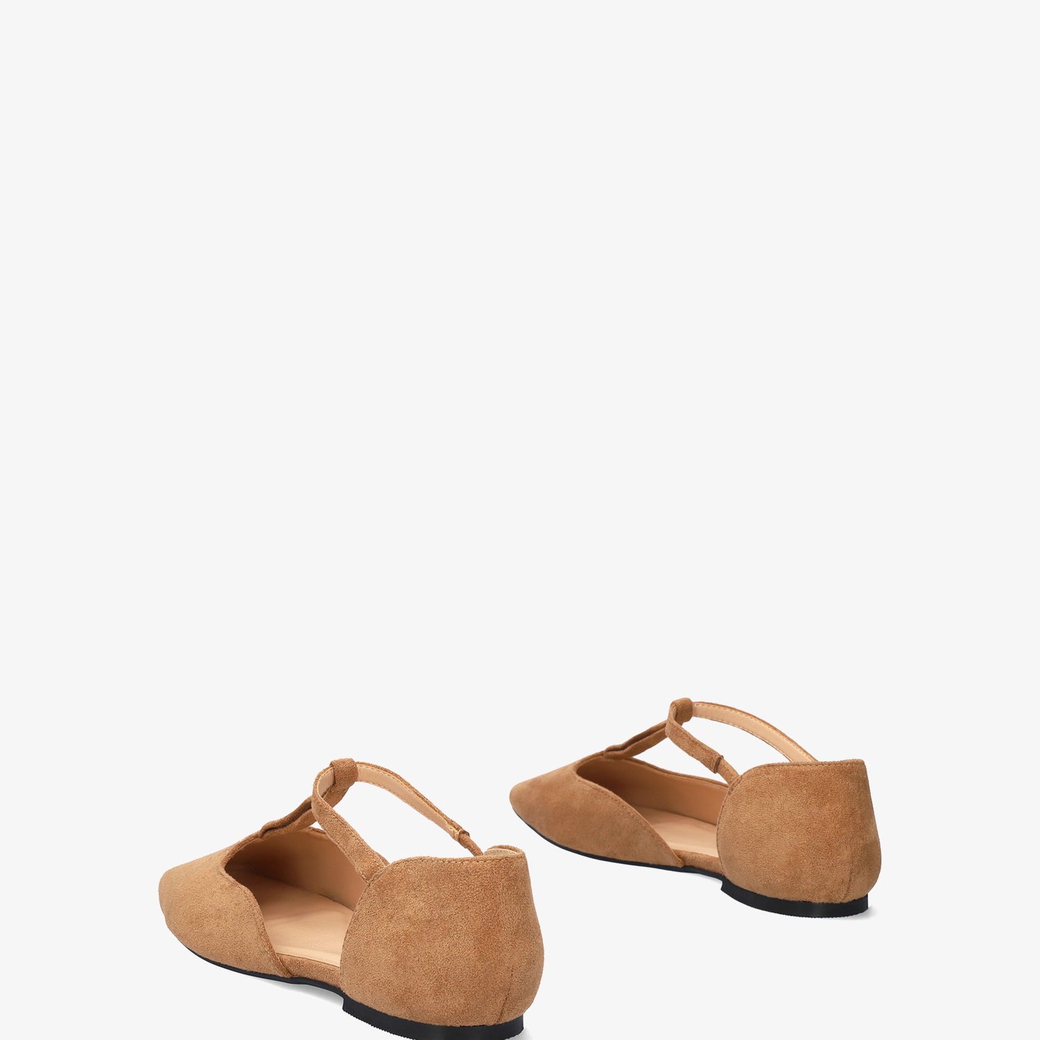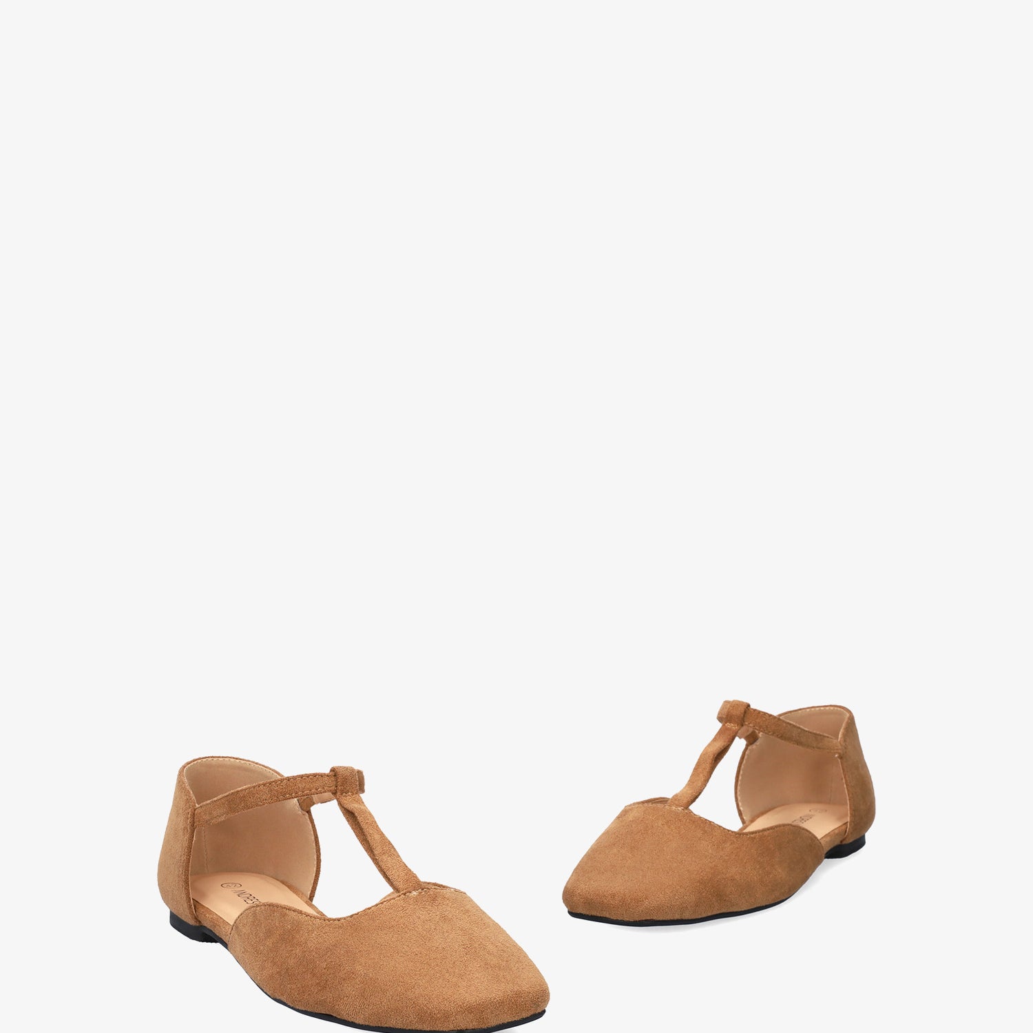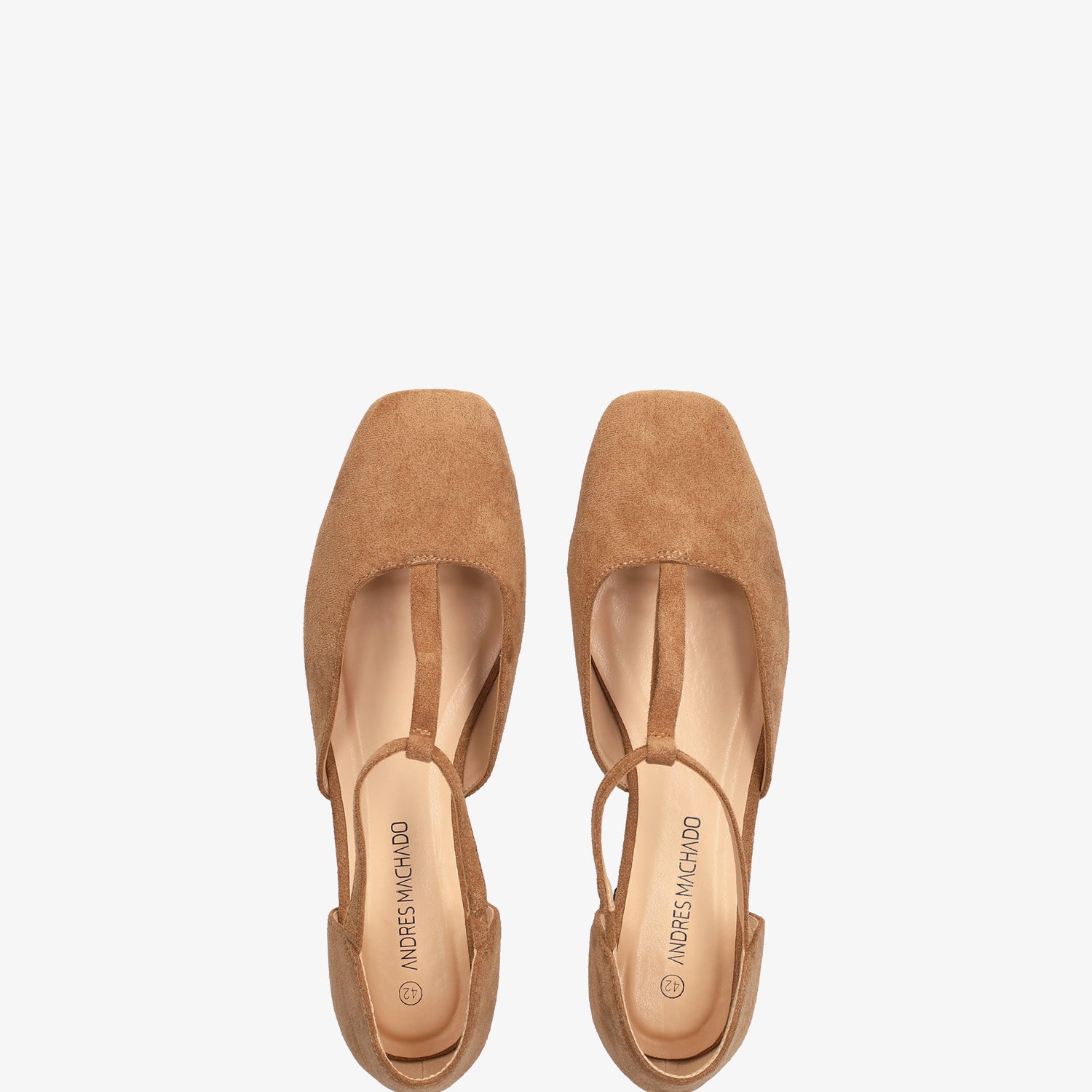 Baleriny na płaskim obcasie ze skóry zamszowej w kolorze brązowym. Konstrukcja wykończona zamkniętym, kwadratowym noskiem, z centralnym paskiem w kształcie odwróconej litery T na podbiciu z elastyczną wstawką, dla lepszego wsparcia kostki. Dostępne w dużych rozmiarach od 42 do 46.