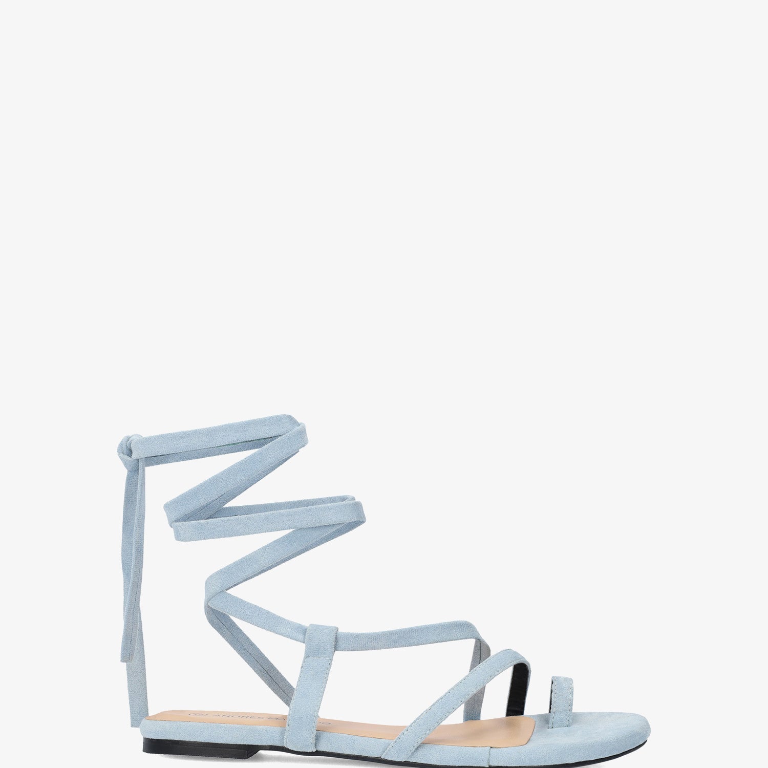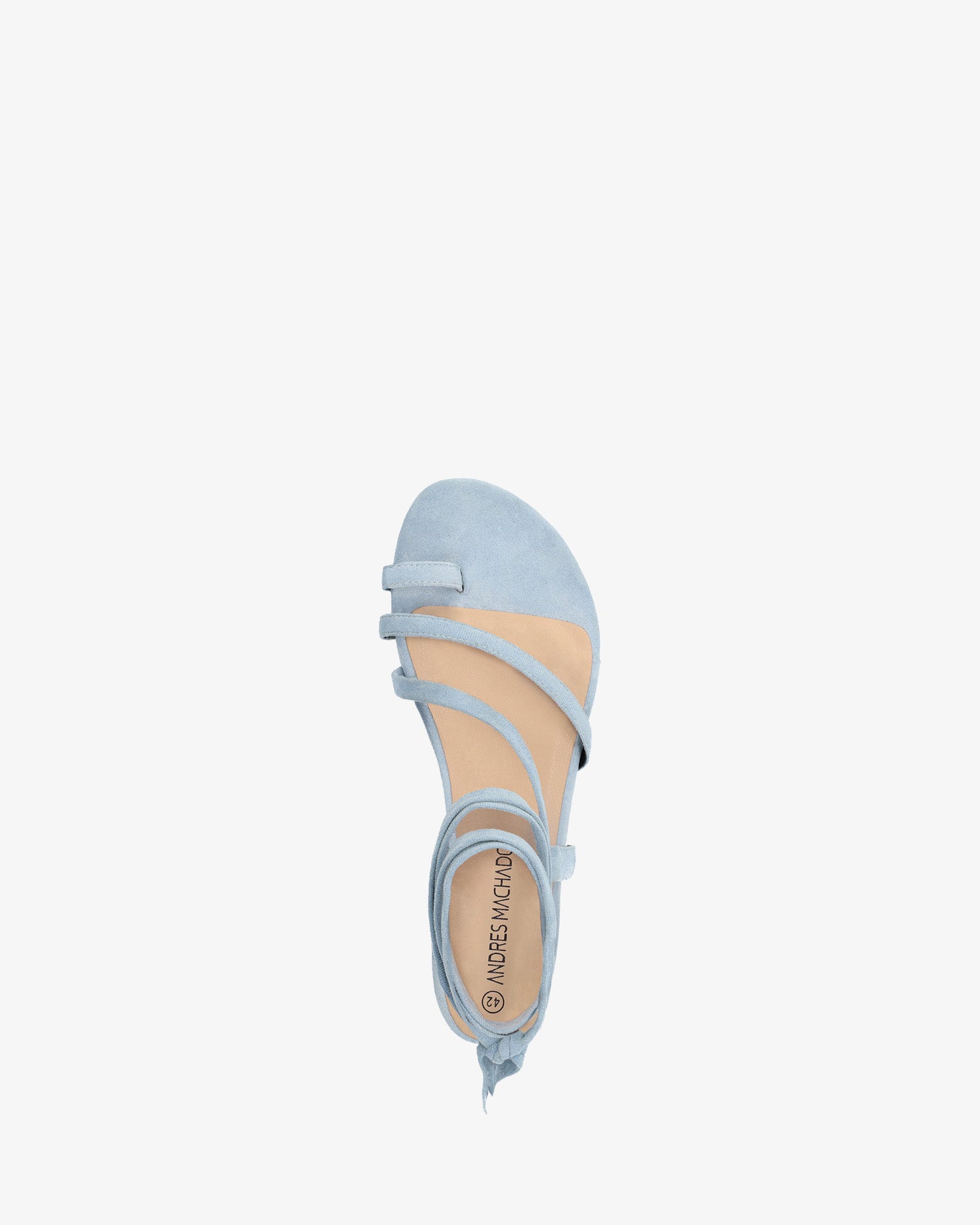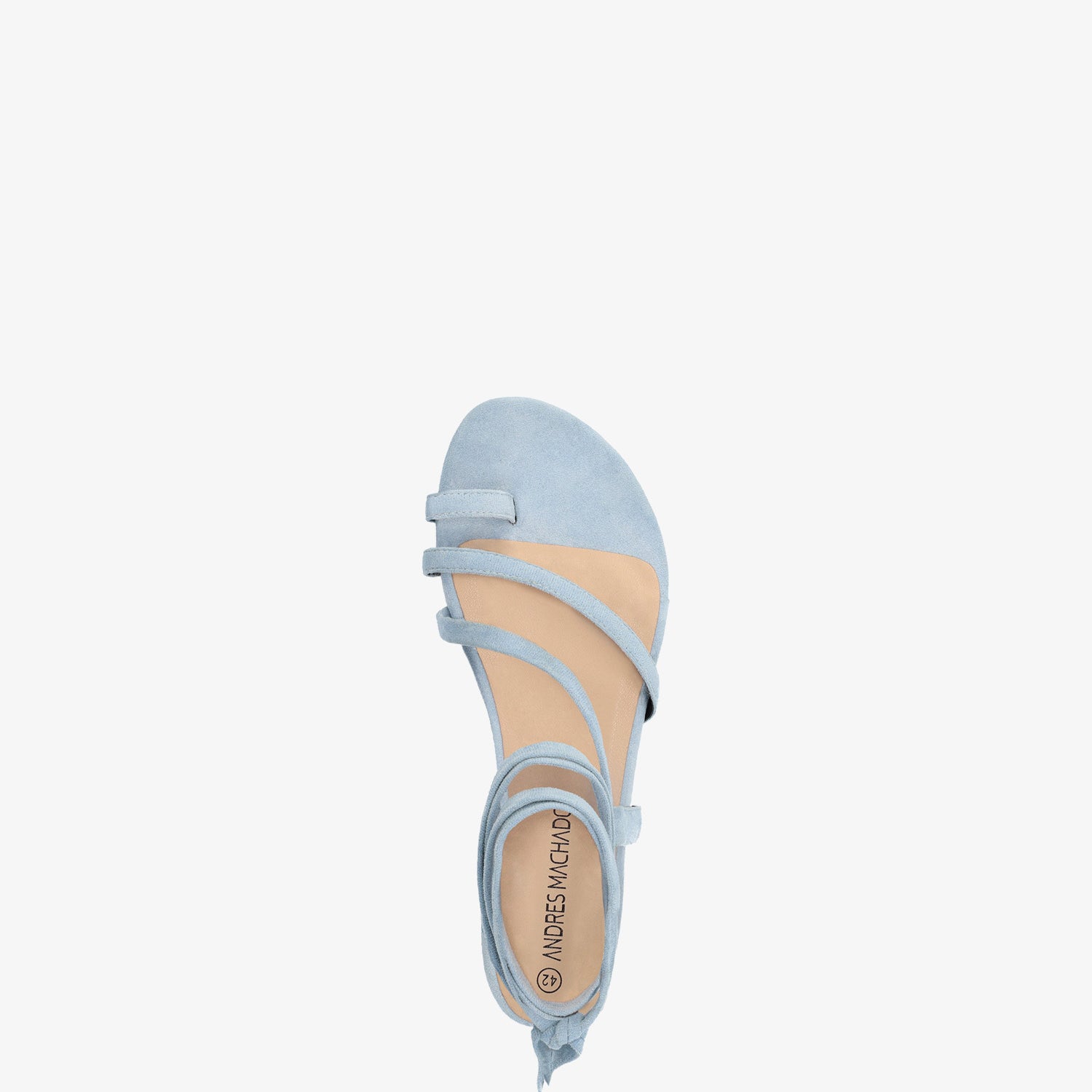 Płaskie sandały z jasnoniebieskiego zamszu o specjalnie szerokim kopycie. Buty z odkrytą piętą, paskiem na palce i krzyżującymi się paskami na podbiciu. Sznurowane zapięcie wokół kostki, wiązane w tym samym odcieniu. Zaokrąglone i odkryte palce. Duże rozmiary od 42 do 45.