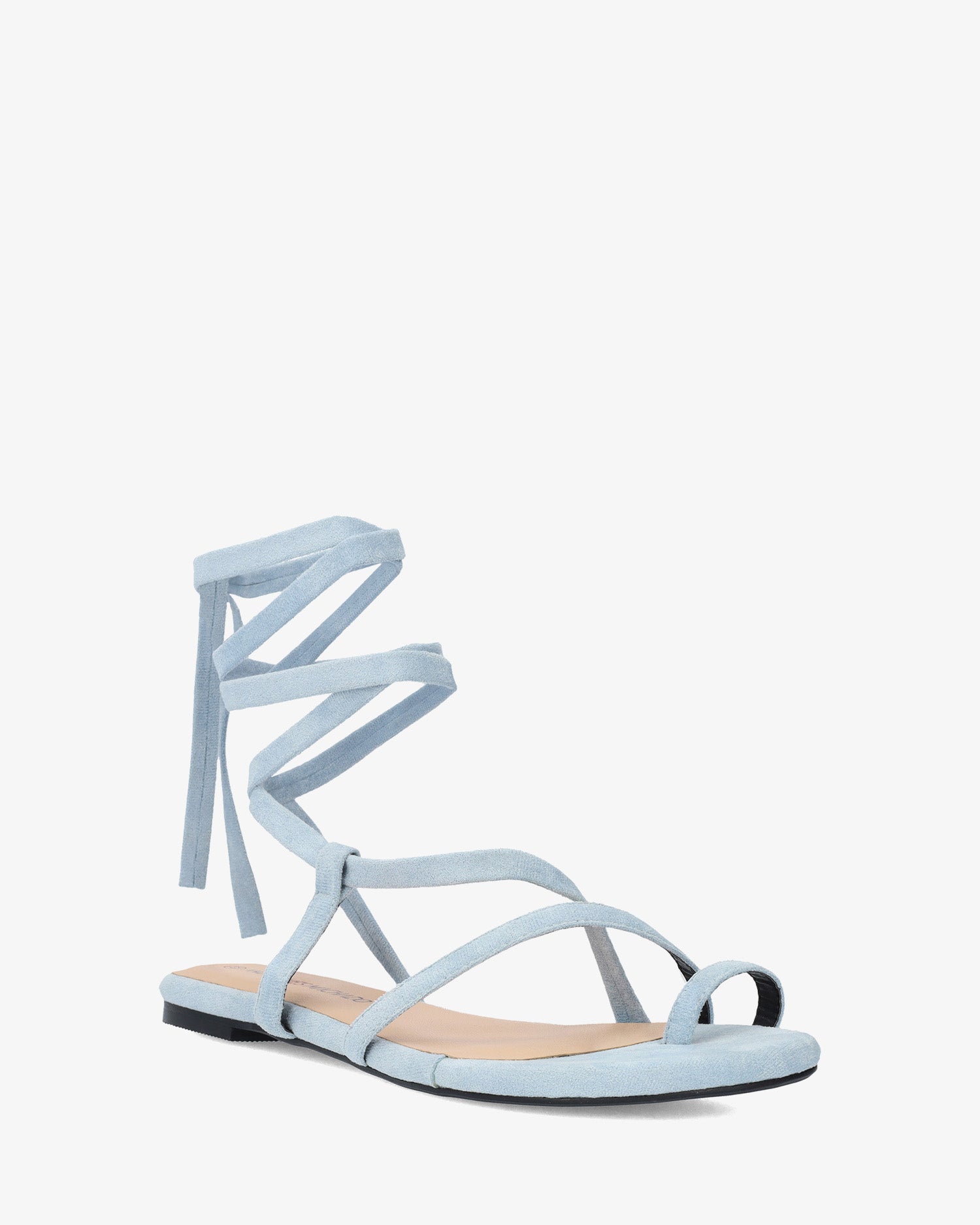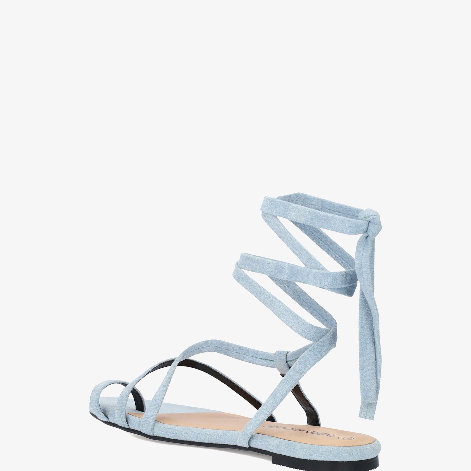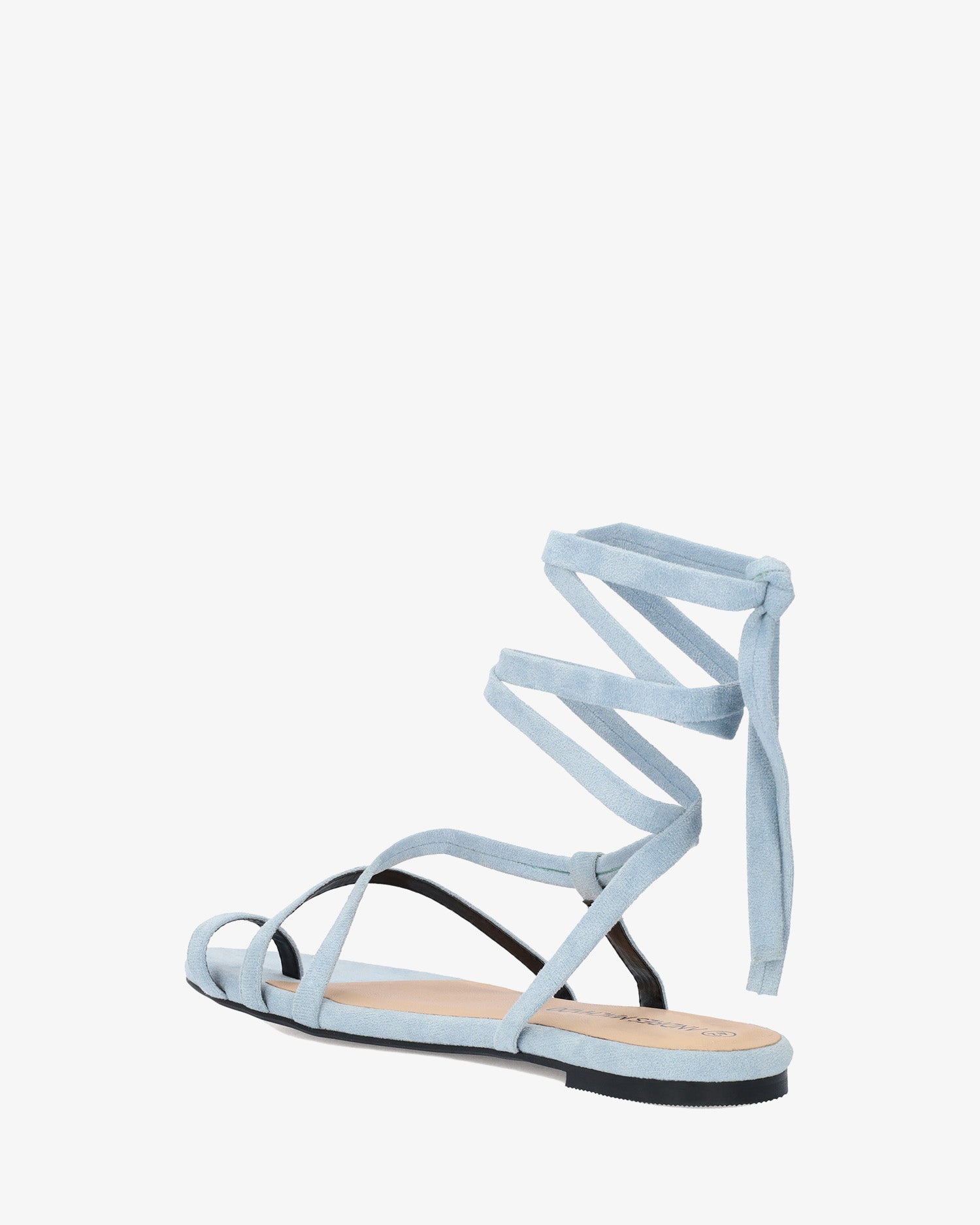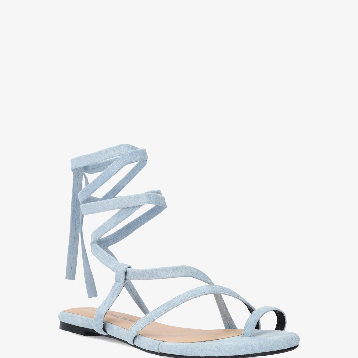 Płaskie sandały z jasnoniebieskiego zamszu o specjalnie szerokim kopycie. Buty z odkrytą piętą, paskiem na palce i krzyżującymi się paskami na podbiciu. Sznurowane zapięcie wokół kostki, wiązane w tym samym odcieniu. Zaokrąglone i odkryte palce. Duże rozmiary od 42 do 45.