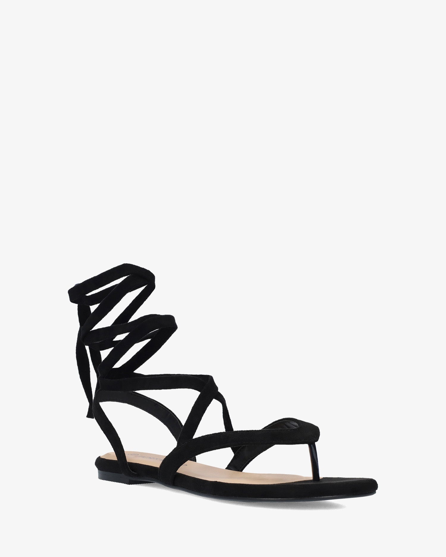 Płaskie sandały z czarnego zamszu. Sandały typu slingback, zakończone japonkami i sznurowaniem wokół kostki. Zaokrąglone i odkryte palce. Duże rozmiary od 42 do 45.