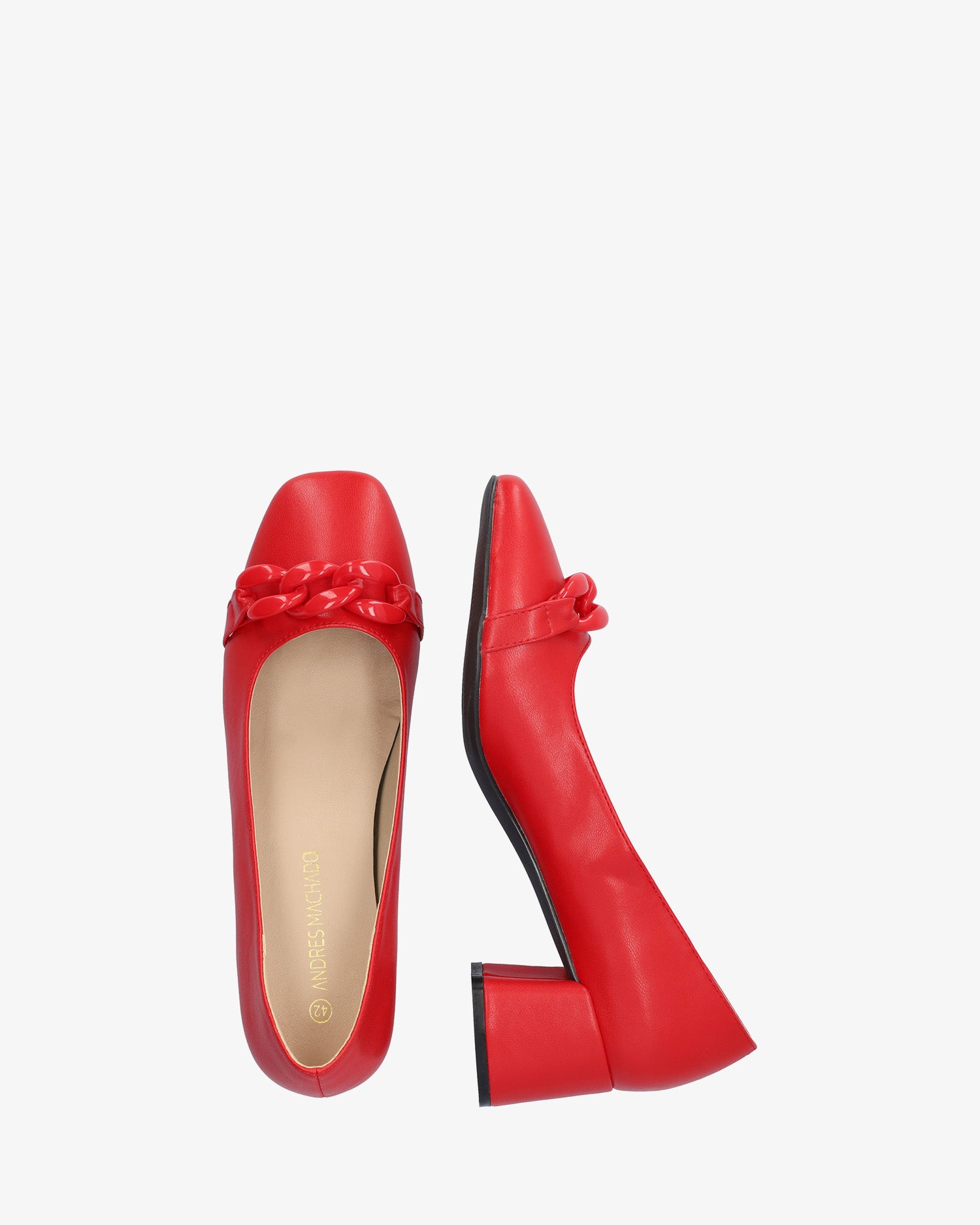 Czerwony, miękki salon na obcasie. Detal w postaci łańcuszka ogniwowego w tym samym kolorze na podbiciu. Wykończenie w formie kwadratowego noska. Obcas o wysokości 6 cm, szeroki, podszyty materiałem w tym samym kolorze, odpowiedni dla małych rozmiarów od 32 do 35. Obcas o wysokości 6,5 cm odpowiedni dla dużych rozmiarów od 42 do 45.