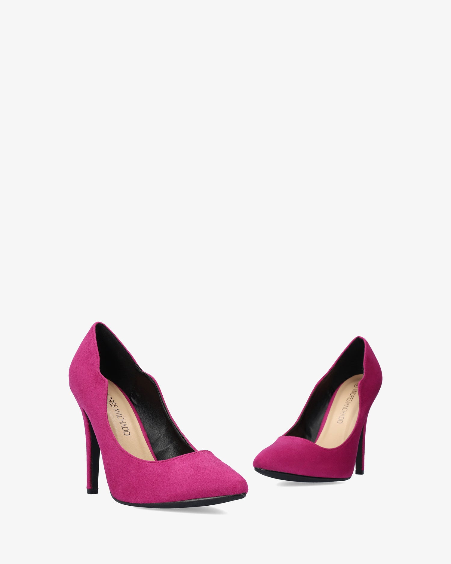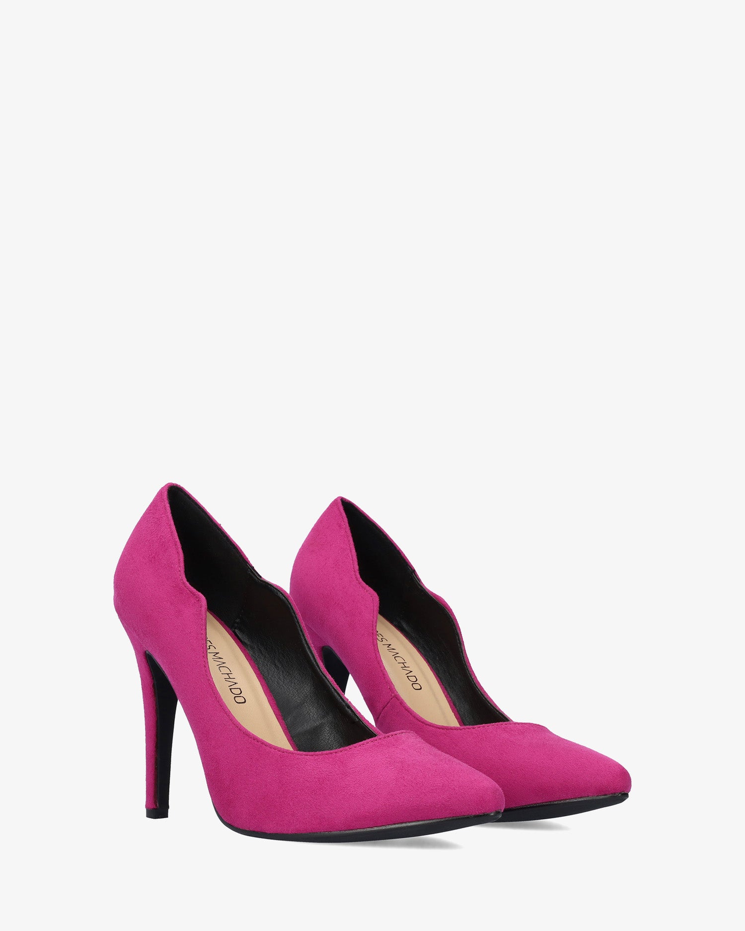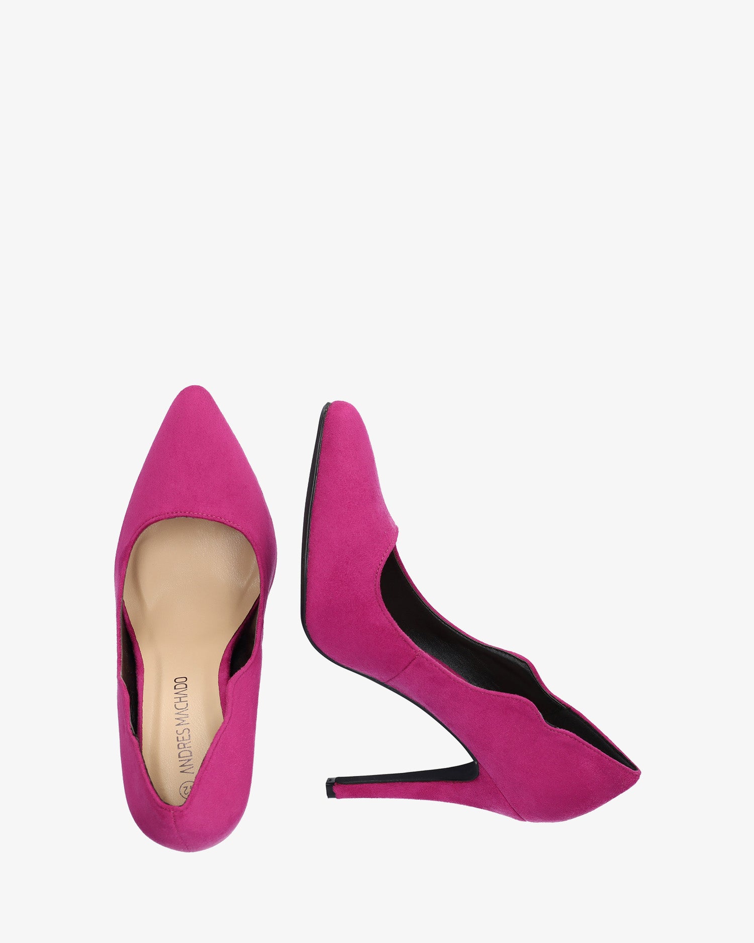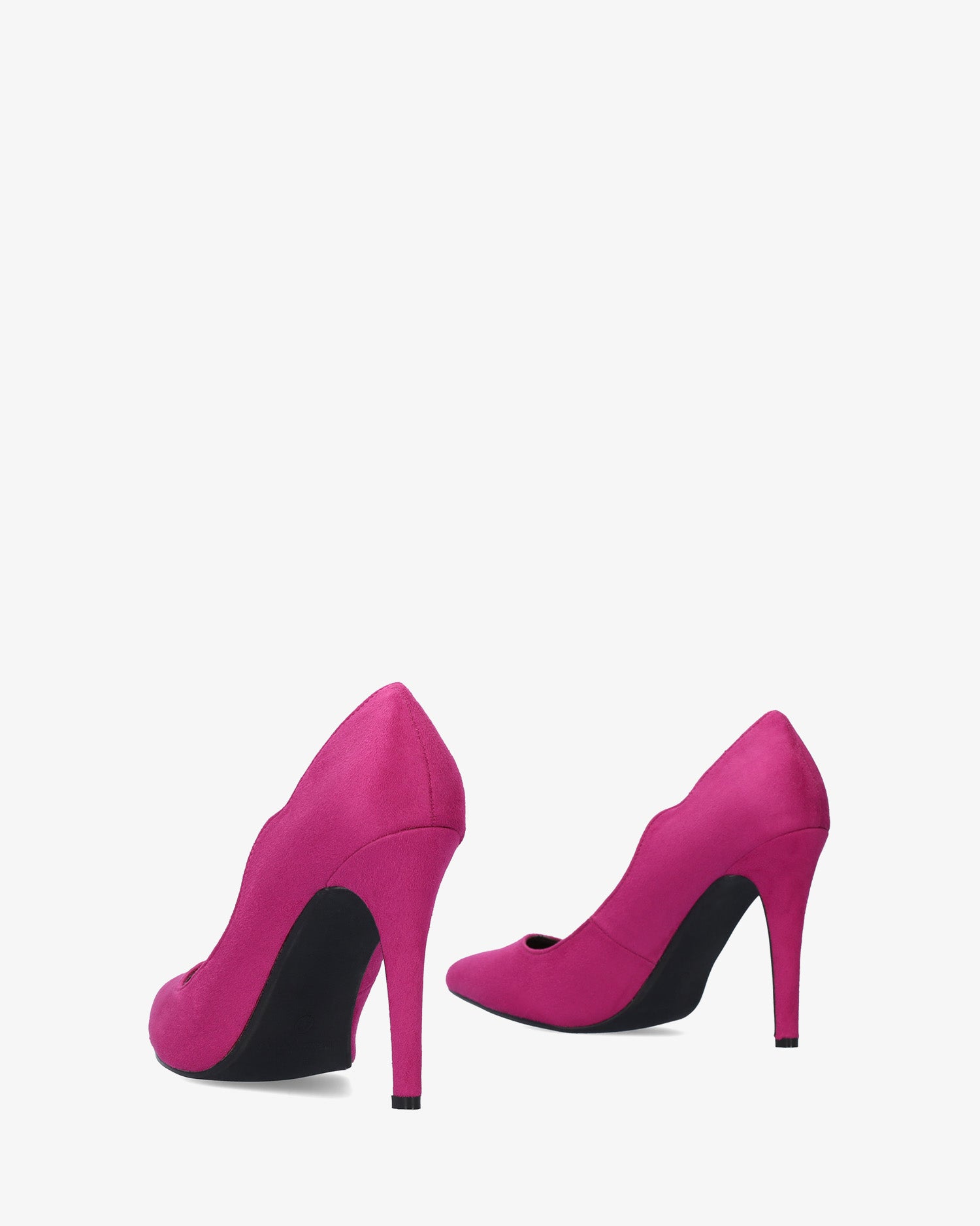 Salon w kolorze fuksji, przypominający zamsz. Ozdobne faliste krawędzie po obu stronach buta. Wykończenie Fine Point. Obcas o wysokości 9,5 cm, dopasowany do małych rozmiarów od 32 do 35. Obcas o wysokości 11 cm do dużych rozmiarów od 42 do 45.