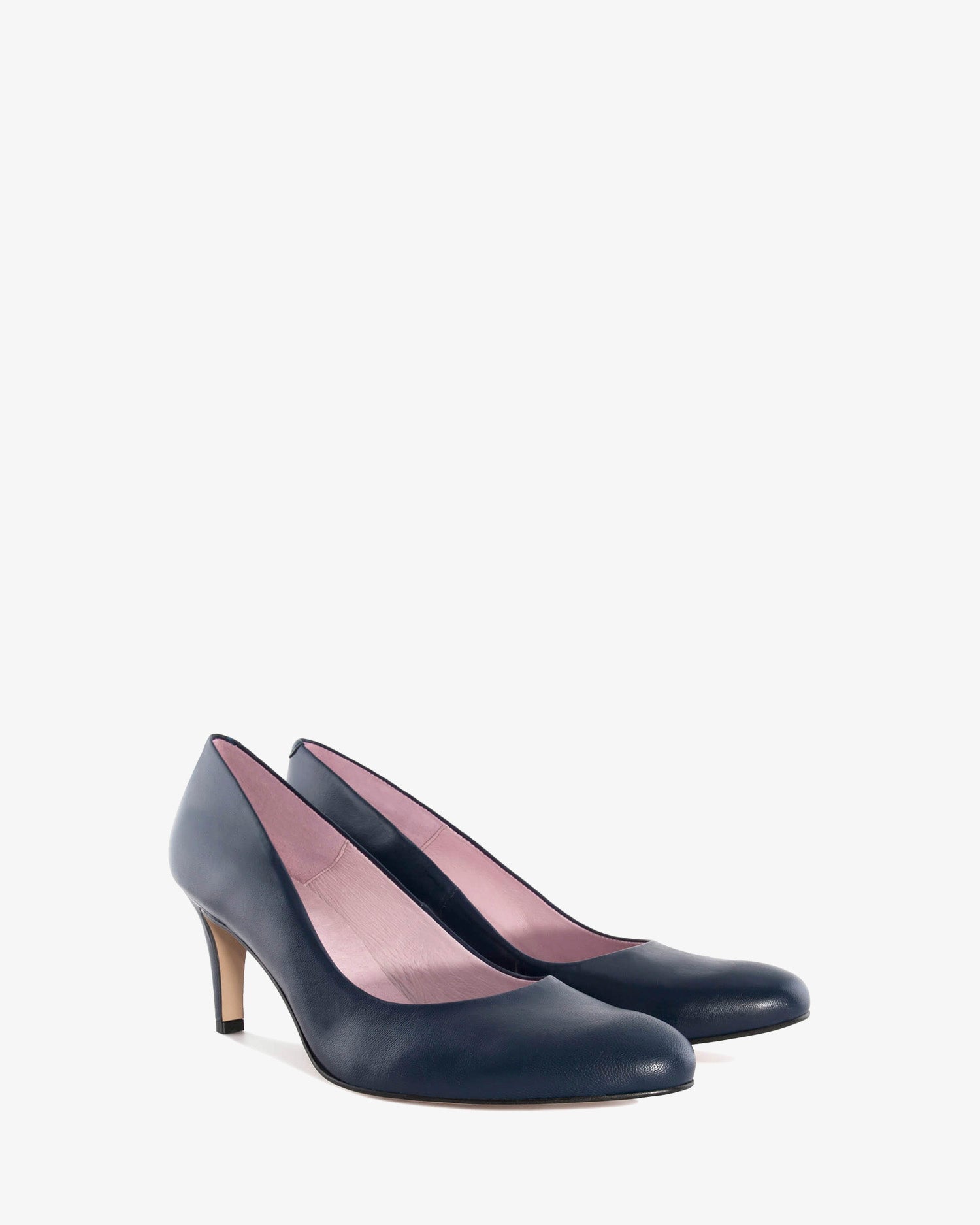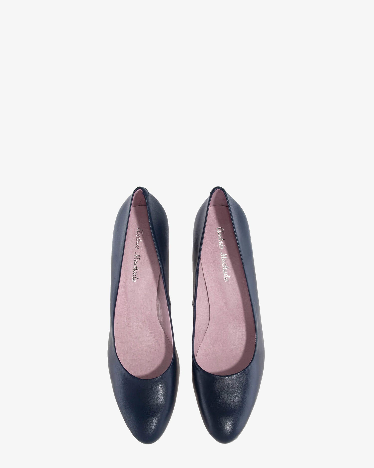 Skórzana sofa w kolorze granatowym. Wkładka i podszewka wykonane z różowej skóry. Średni, 7-centymetrowy obcas dla małych rozmiarów od 32 do 35. Obcas 7 cm dla średnich rozmiarów od 36 do 41. Obcas 8 cm dla dużych rozmiarów od 42 do 45. Wyprodukowano w Hiszpanii. Ten model jest zawyżony, dlatego zaleca się wybór rozmiaru o jeden mniejszego niż zwykle.