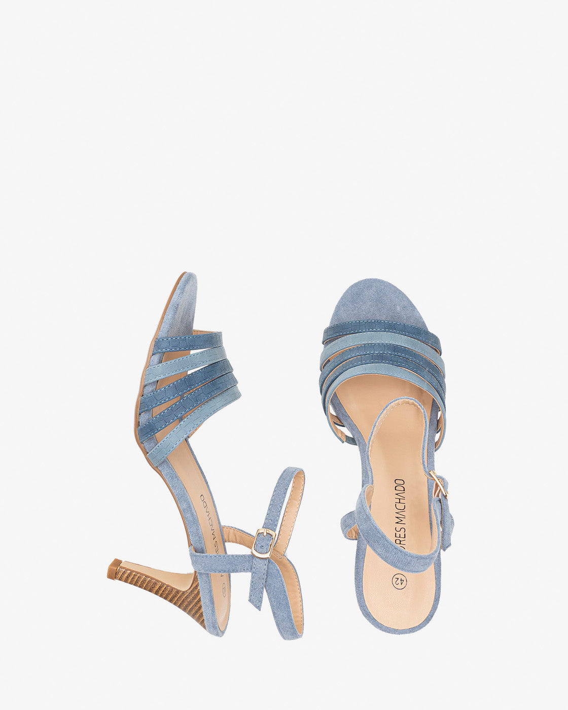 Sandały wykonane ze skóry zamszowej, z miękkim tłoczeniem w różnych odcieniach niebieskiego. Wzór w postaci cienkich pasków z delikatnym niebieskim wytłoczeniem na palcach. Zapięcie na klamrę i niebieski pasek zamszowy wokół kostki. Otwarte, zaokrąglone palce. 8-centymetrowy cienki obcas pokryty imitacją drewna dla małych rozmiarów od 32 do 35. 9-centymetrowy cienki obcas pokryty imitacją drewna dla dużych rozmiarów od 42 do 45.