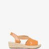 Miękkie sandały w kolorze wielbłądzim. Szeroki, miękki pasek z przodu połączony z dwoma skośnymi elastycznymi paskami w tym samym odcieniu na podbiciu. Fason z odkrytym tyłem i miękkim paskiem dopasowanym do pięty w pasującym odcieniu. Koturn o wysokości 4,5 cm i platforma o wysokości 2 cm dla małych rozmiarów od 32 do 35. Koturn o wysokości 5,5 cm i platforma o wysokości 2 cm dla dużych rozmiarów od 42 do 45.