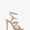 Miękkie beżowe sandały. Konstrukcja z wieloma paskami, cienkimi paskami na palcach i krzyżującymi się na podbiciu. Zapięcie na skrzyżowaną klamrę na podbiciu i klamrę oplatającą kostkę. Kwadratowe i odkryte palce. Obcas o wysokości 9 cm, dopasowany do małych rozmiarów od 32 do 35. Obcas o wysokości 11,5 cm do dużych rozmiarów od 42 do 45.