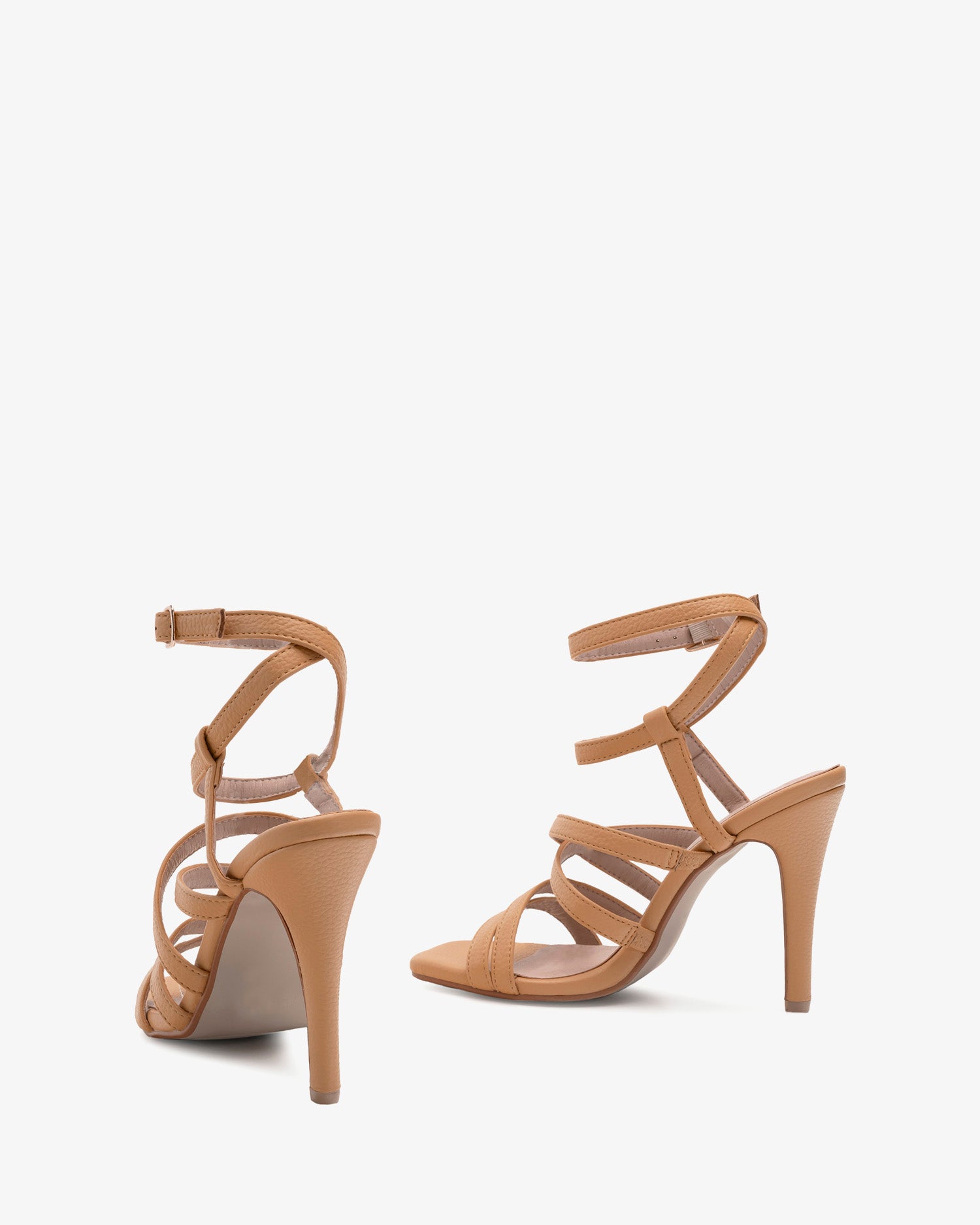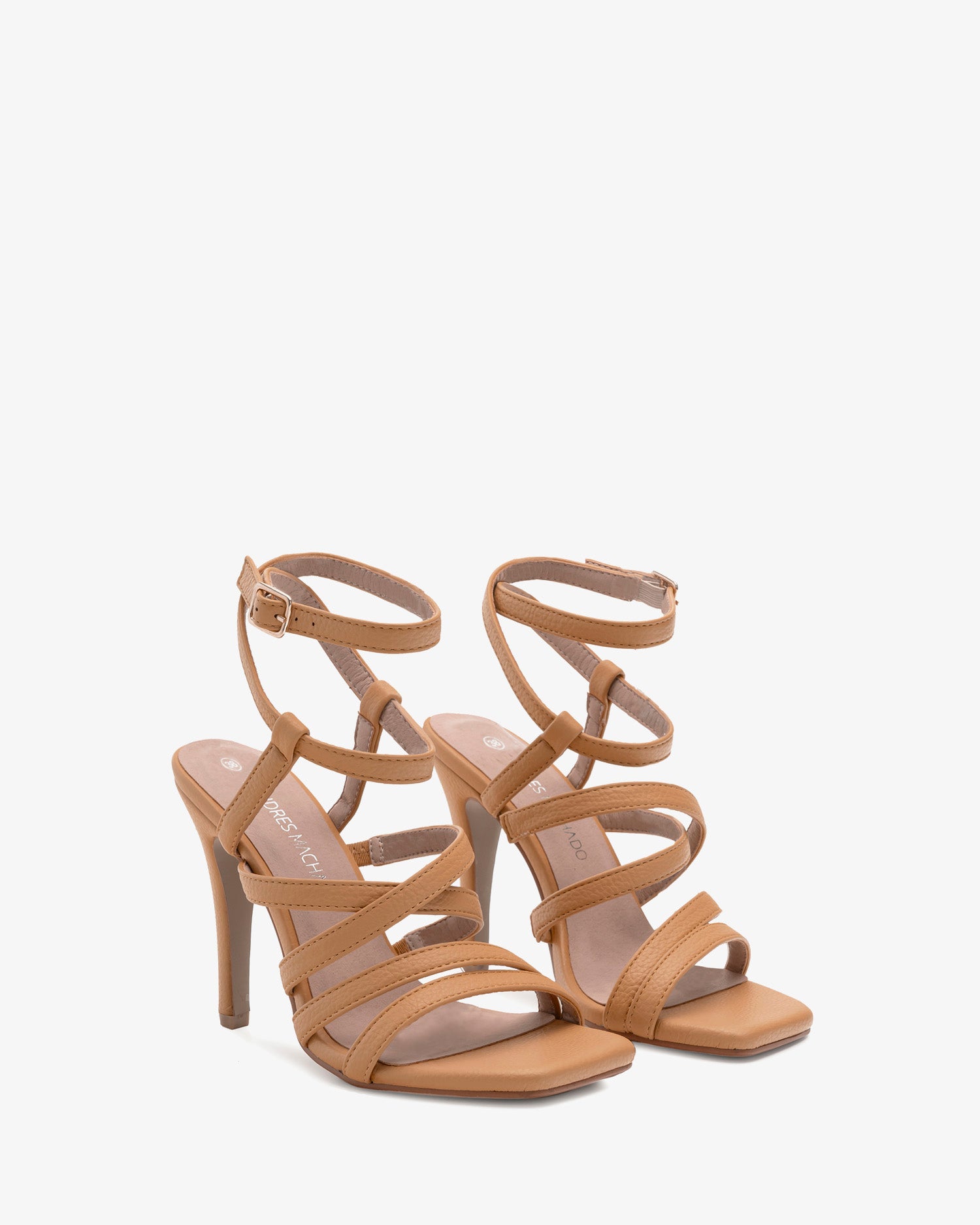 Miękkie sandały w kolorze płytek. Konstrukcja z wieloma paskami, cienkimi paskami na palcach i krzyżującymi się na podbiciu. Zapięcie na skrzyżowaną klamrę na podbiciu i klamrę oplatającą kostkę. Kwadratowe i odkryte palce. Obcas o wysokości 9 cm, dopasowany do małych rozmiarów od 32 do 35. Obcas o wysokości 11,5 cm do dużych rozmiarów od 42 do 45.