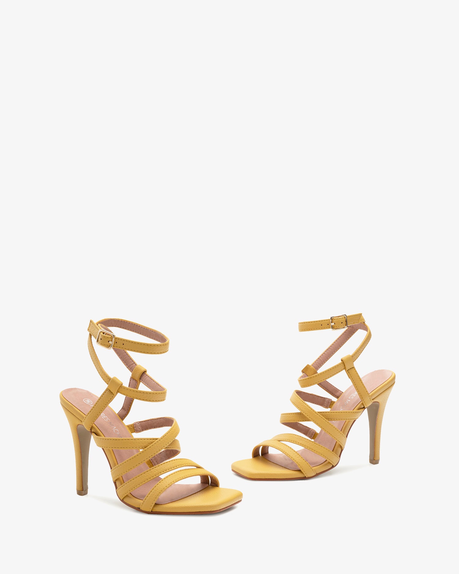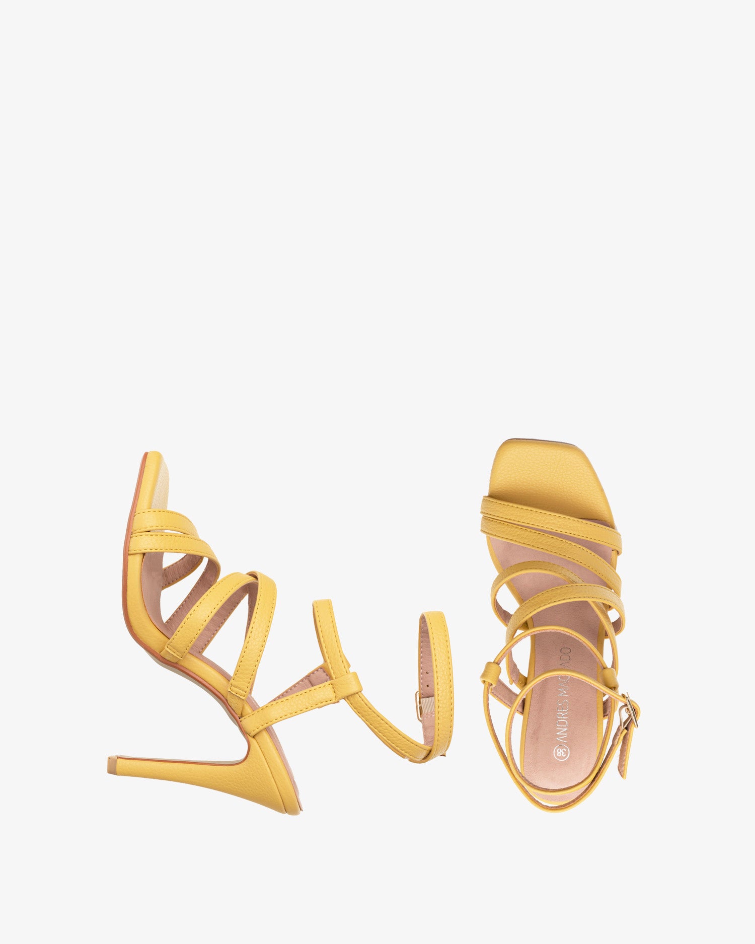 Miękkie sandały w kolorze żółtym. Konstrukcja z wieloma paskami, cienkimi paskami na palcach i krzyżującymi się na podbiciu. Zapięcie na skrzyżowaną klamrę na podbiciu i klamrę oplatającą kostkę. Kwadratowe i odkryte palce. Obcas o wysokości 9 cm, dopasowany do małych rozmiarów od 32 do 35. Obcas o wysokości 11,5 cm do dużych rozmiarów od 42 do 45.
