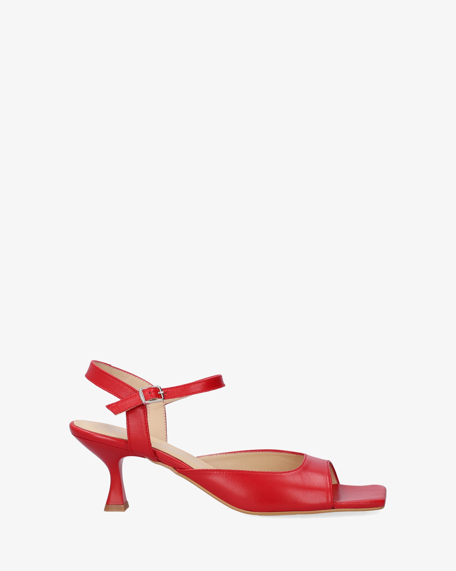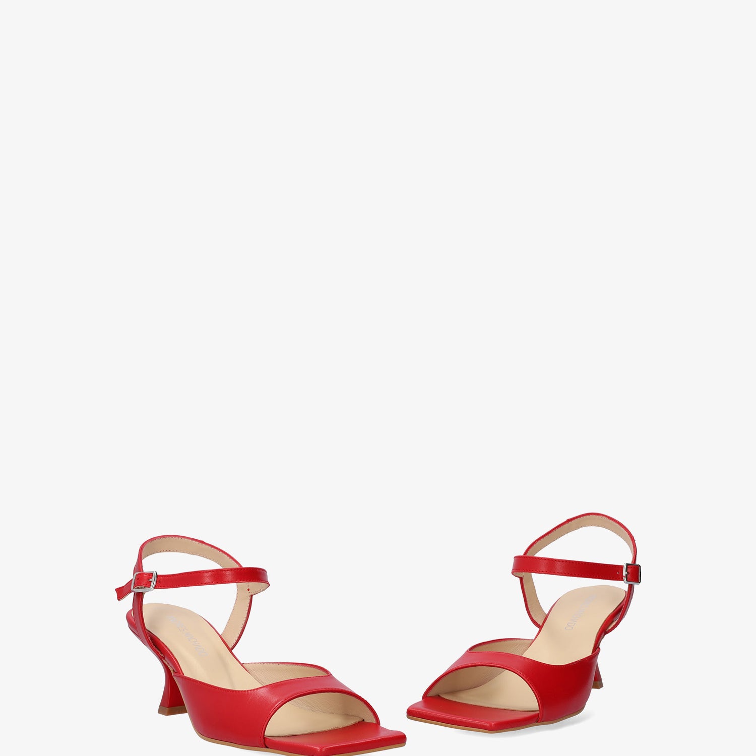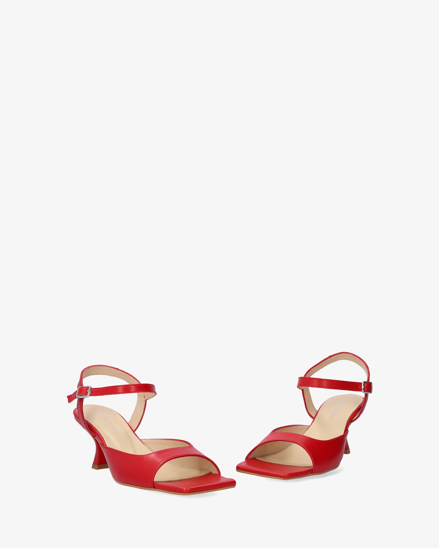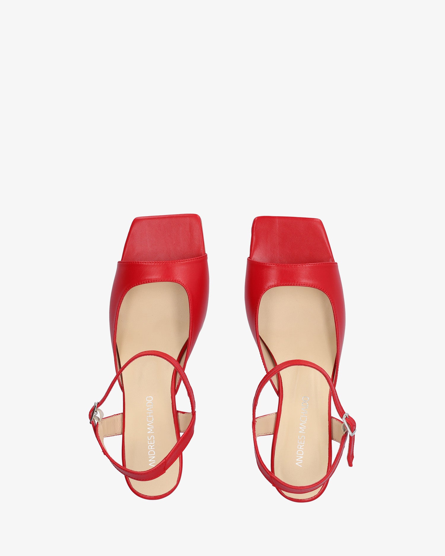 Sandały na obcasie typu kociak, wykonane ze skóry w kolorze czerwonym. Projekt z paskiem z przodu i zaokrąglonym kształtem na podbiciu w tym samym odcieniu. Wykończenie w formie kwadratowego noska. Zapięcie w postaci bransoletki oplatającej kostkę. Obcas o wysokości 7 cm pasujący do małych rozmiarów od 32 do 35. Obcas o wysokości 7,5 cm do dużych rozmiarów od 42 do 45. Wyprodukowano w Hiszpanii.