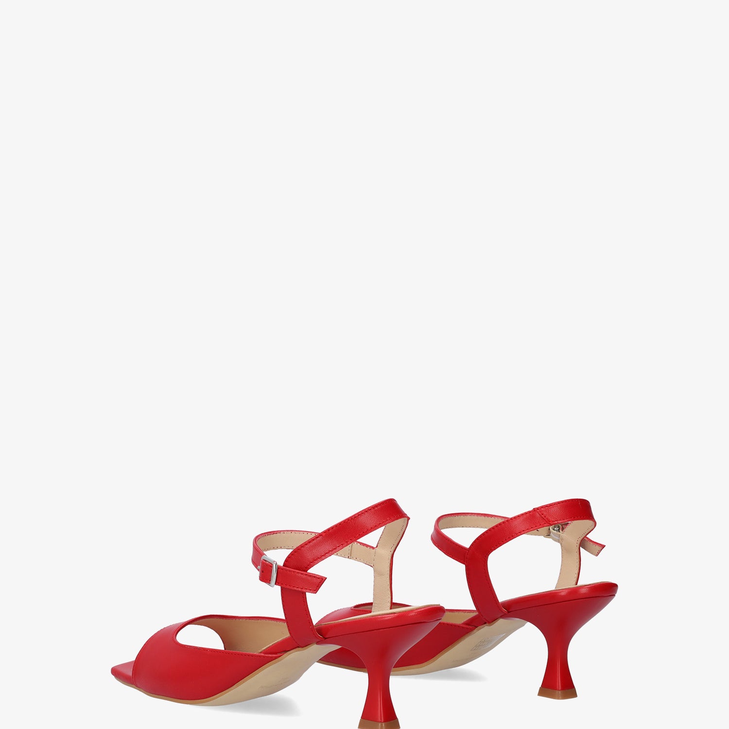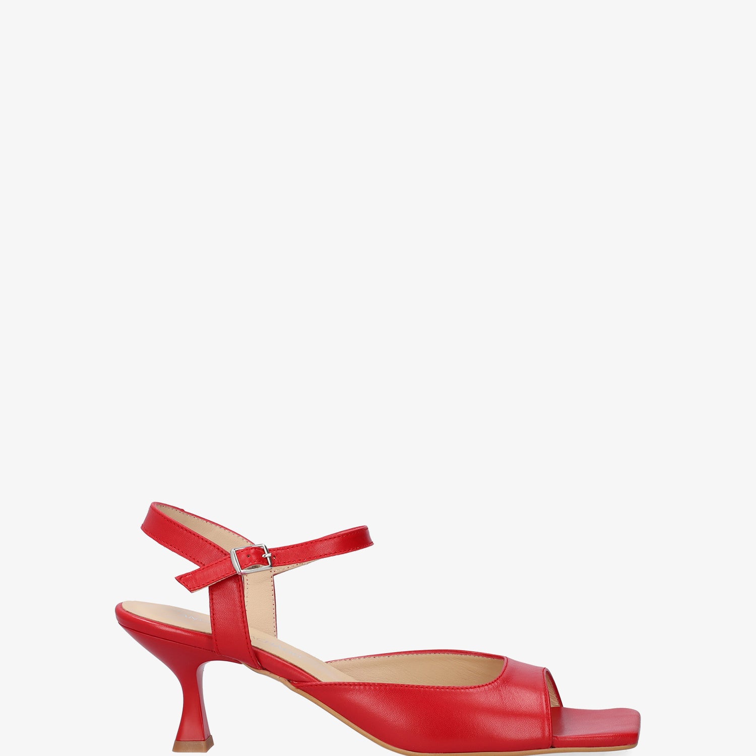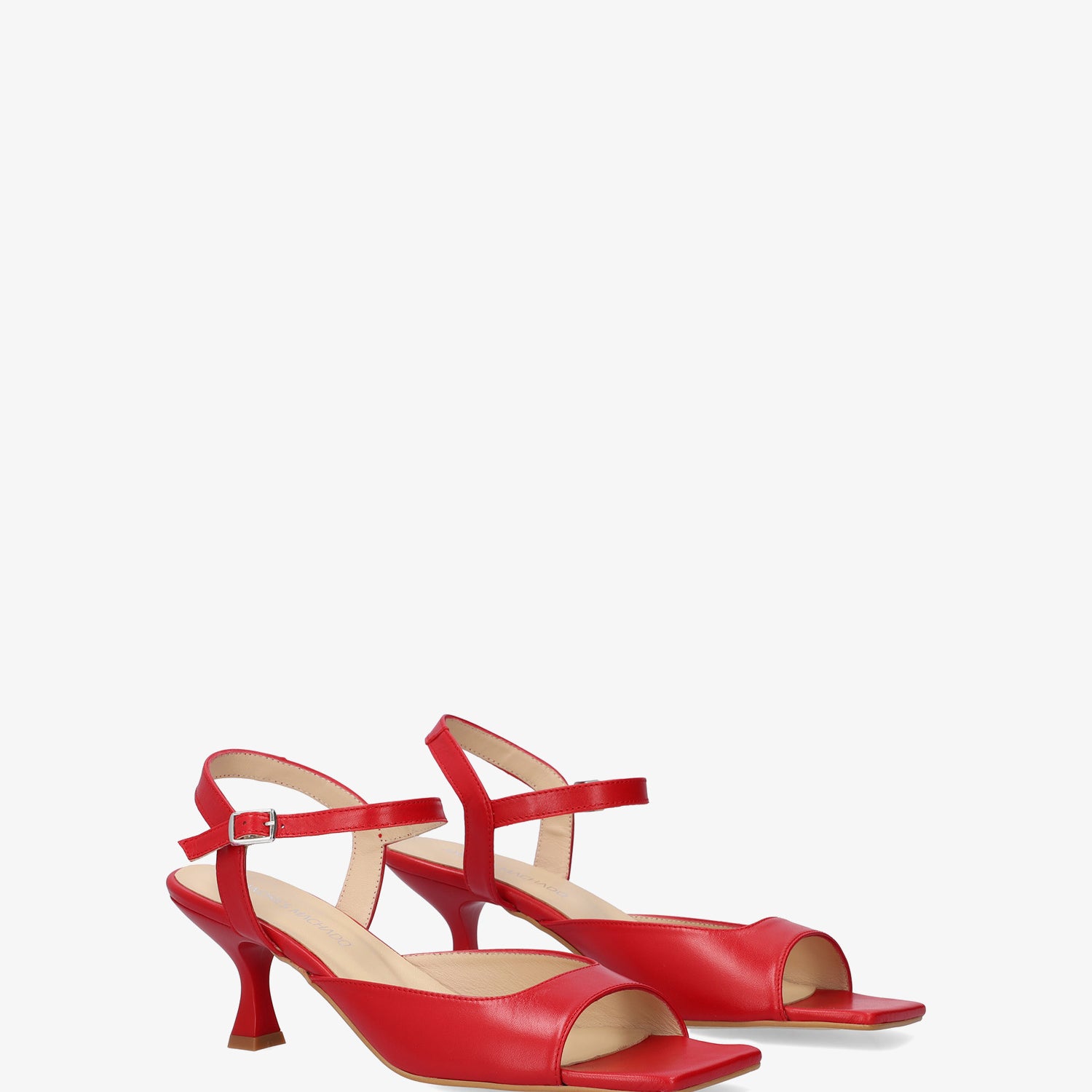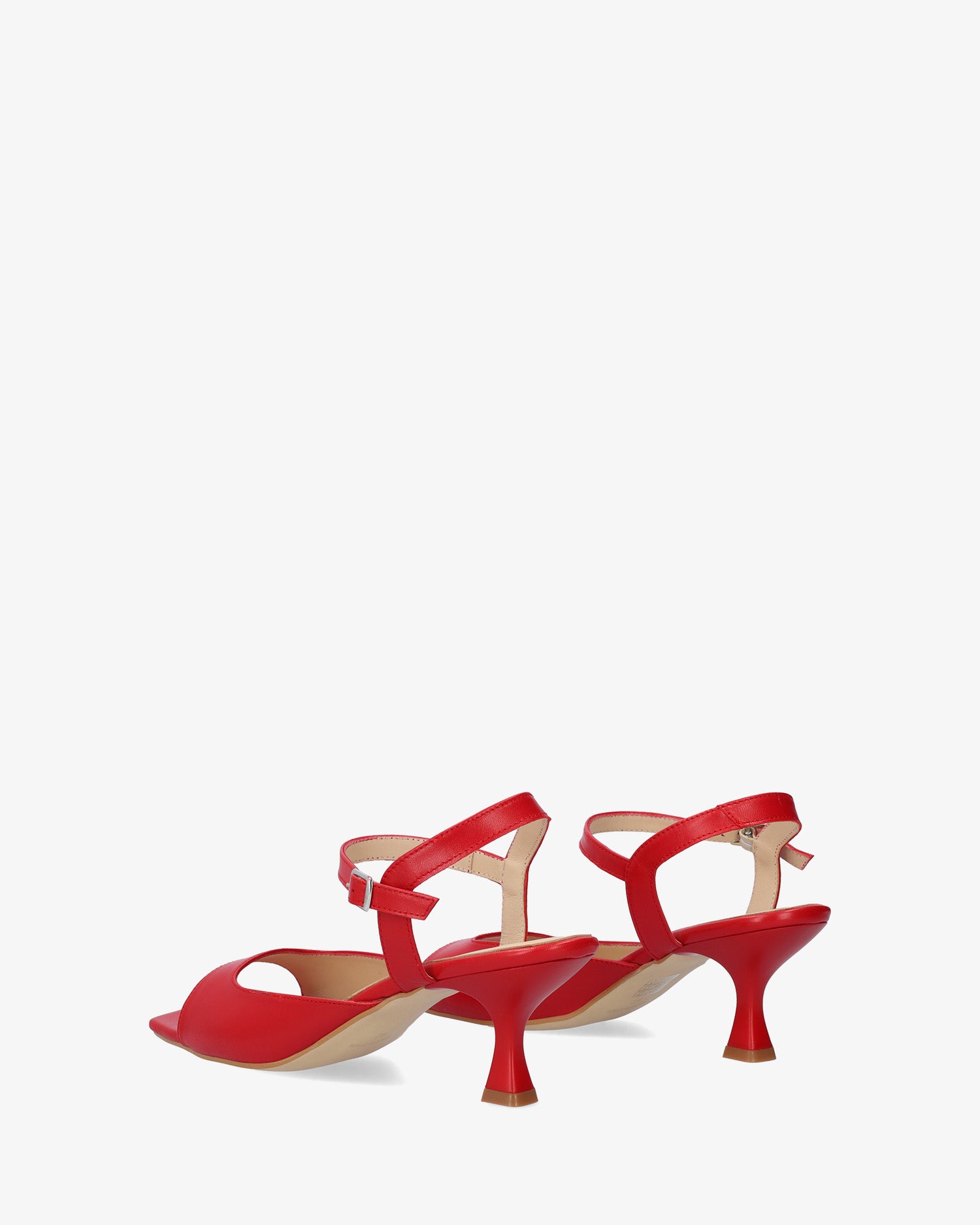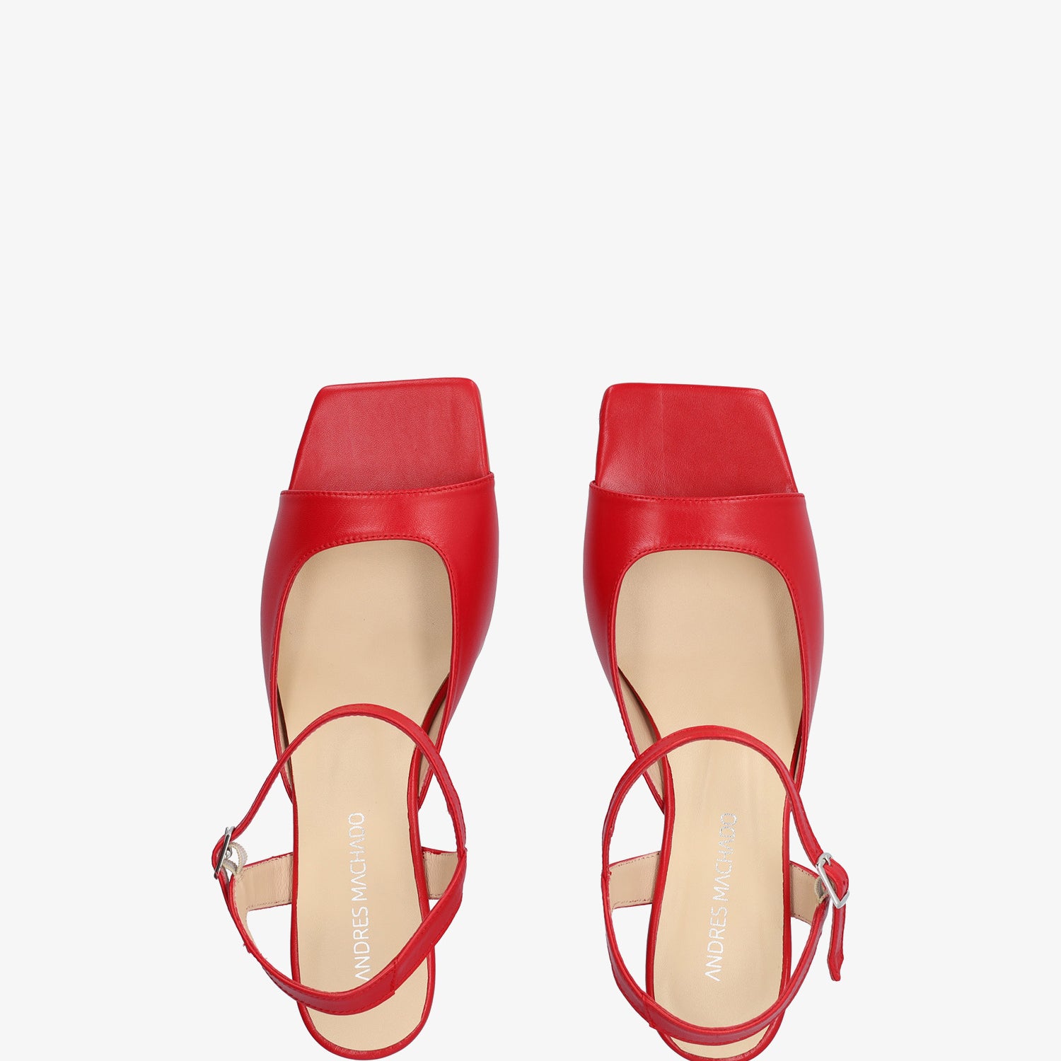 Sandały na obcasie typu kociak, wykonane ze skóry w kolorze czerwonym. Projekt z paskiem z przodu i zaokrąglonym kształtem na podbiciu w tym samym odcieniu. Wykończenie w formie kwadratowego noska. Zapięcie w postaci bransoletki oplatającej kostkę. Obcas o wysokości 7 cm pasujący do małych rozmiarów od 32 do 35. Obcas o wysokości 7,5 cm do dużych rozmiarów od 42 do 45. Wyprodukowano w Hiszpanii.