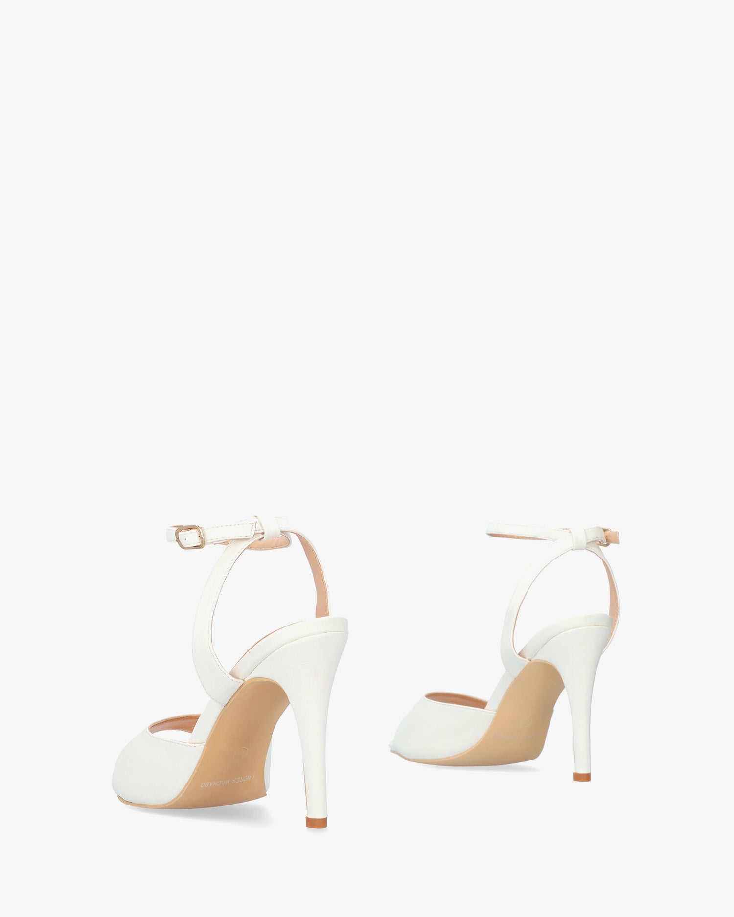 Miękkie białe sandały na wysokim obcasie. Model z odkrytą piętą i paskiem w kształcie litery U oplatającym przód w tym samym odcieniu. Zapięcie na metalową klamrę i pasek na kostkę. Odkryte palce. Obcas 10,5 cm dla małych rozmiarów od 32 do 35. Obcas 12 cm dla dużych rozmiarów od 42 do 45.