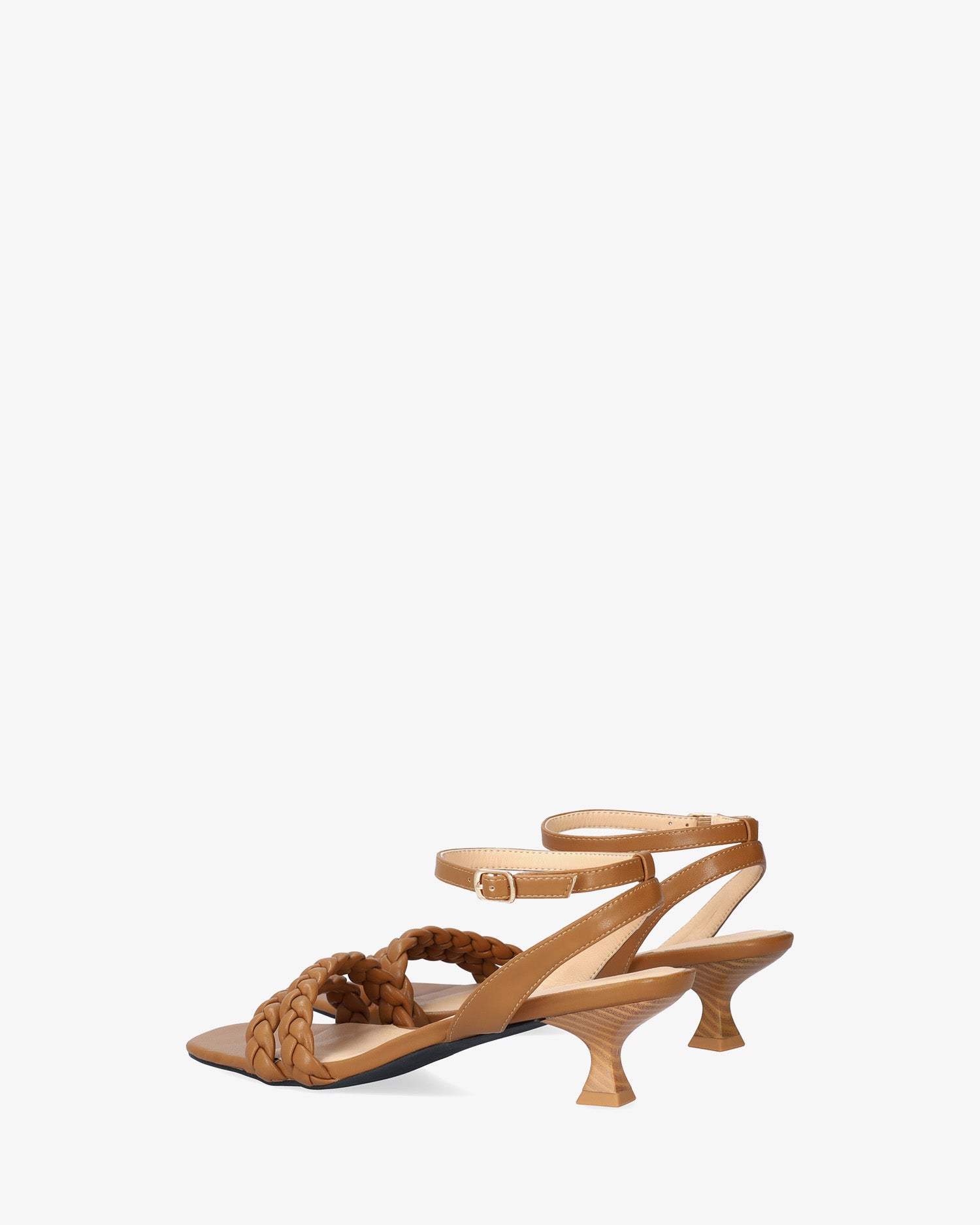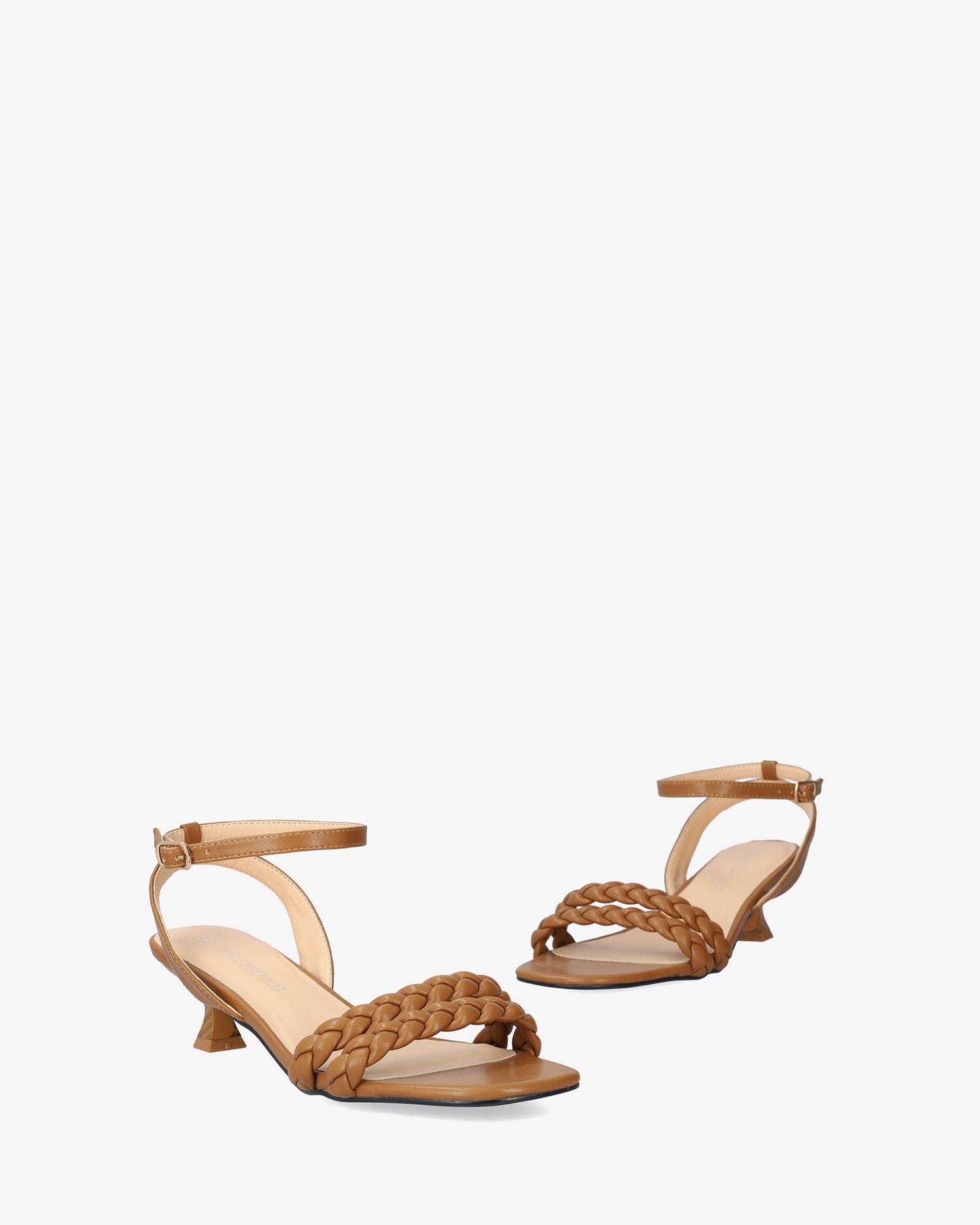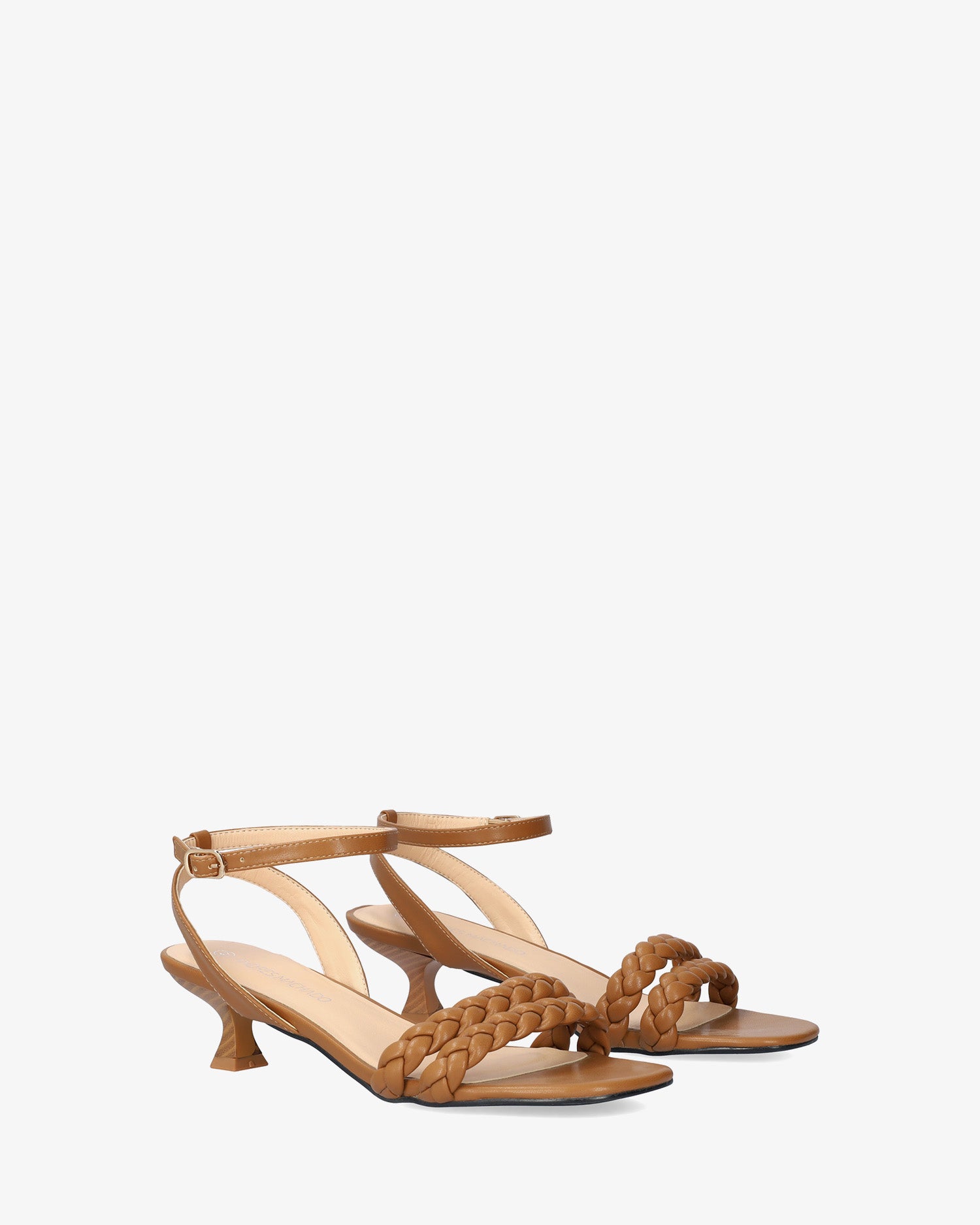 Sandały na obcasie typu kociak w miękkim brązie. Fason z odkrytym tyłem i dwoma równoległymi plecionymi paskami na palcach w pasującym kolorze. Zapięcie na klamrę i pasek na kostkę. Kwadratowe i odkryte palce. Obcas 5 cm dla małych rozmiarów od 32 do 35. Obcas 5,5 cm dla dużych rozmiarów od 42 do 45.