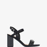 Sandały w kolorze czarnym, na kwadratowym obcasie. Fason z odkrytymi plecami i metalową klamrą na przednim pasku. Otwarte, zaokrąglone palce. Zapięcie na metalową klamrę wokół kostki i paski z boku. Obcas 8,5 cm dla małych rozmiarów od 32 do 35. Obcas 9,5 cm dla dużych rozmiarów od 42 do 45.