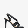 Miękkie czarne sandały na wysokim obcasie. Fason z odkrytym tyłem, dwoma szerokimi paskami z przodu i szerokim, krzyżującym się paskiem na podbiciu, przytrzymywanym przez cienki pasek z boku. Elastyczne wsparcie pięty. Otwarte, kwadratowe palce. Obcas 10,5 cm dla małych rozmiarów od 32 do 35. Obcas 11,5 cm dla dużych rozmiarów od 42 do 45.
