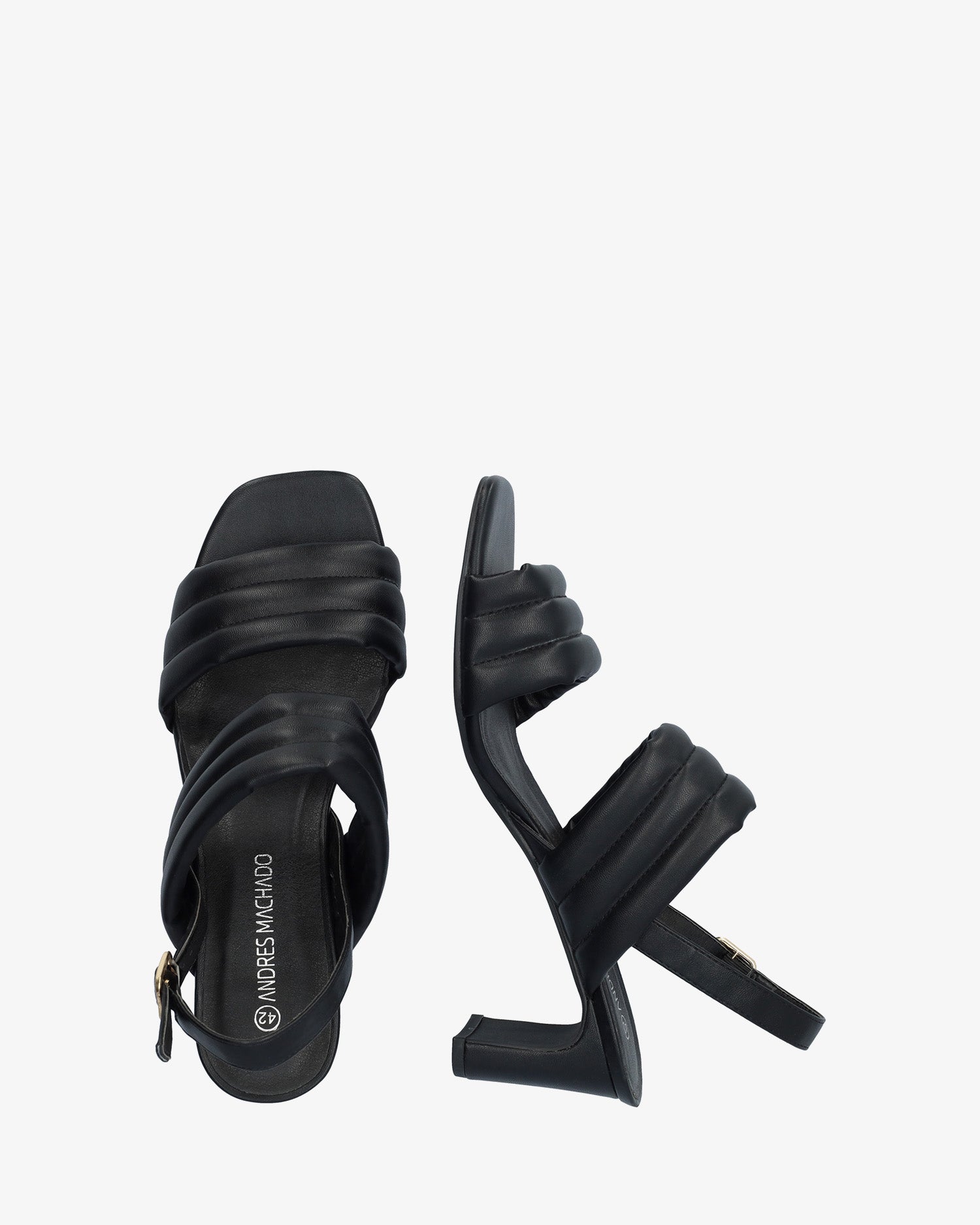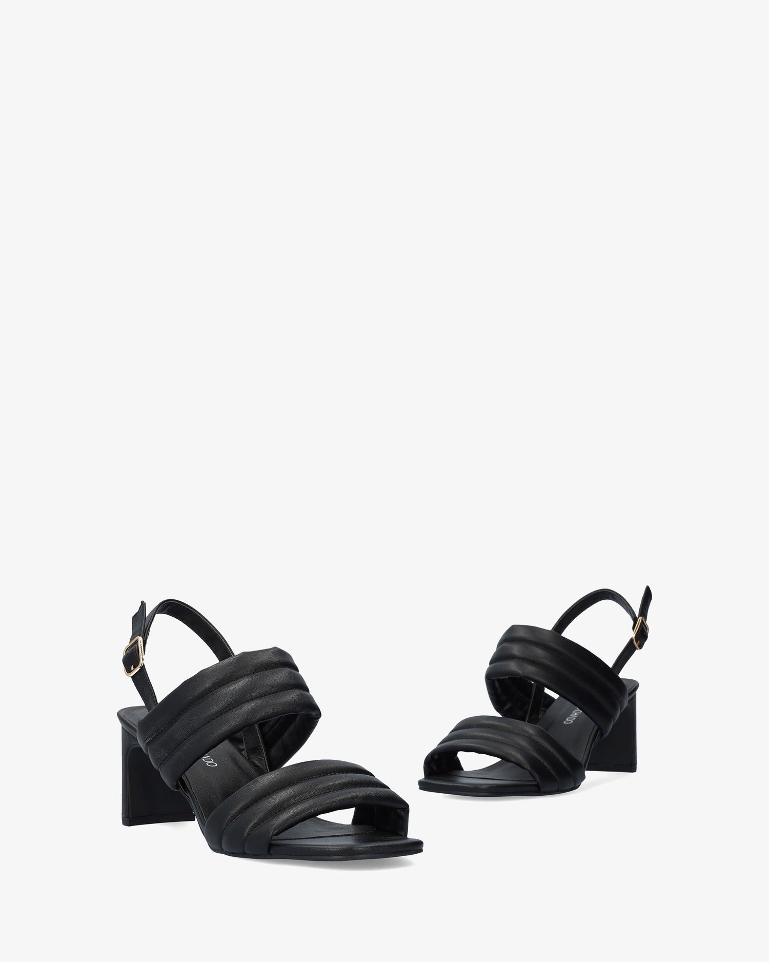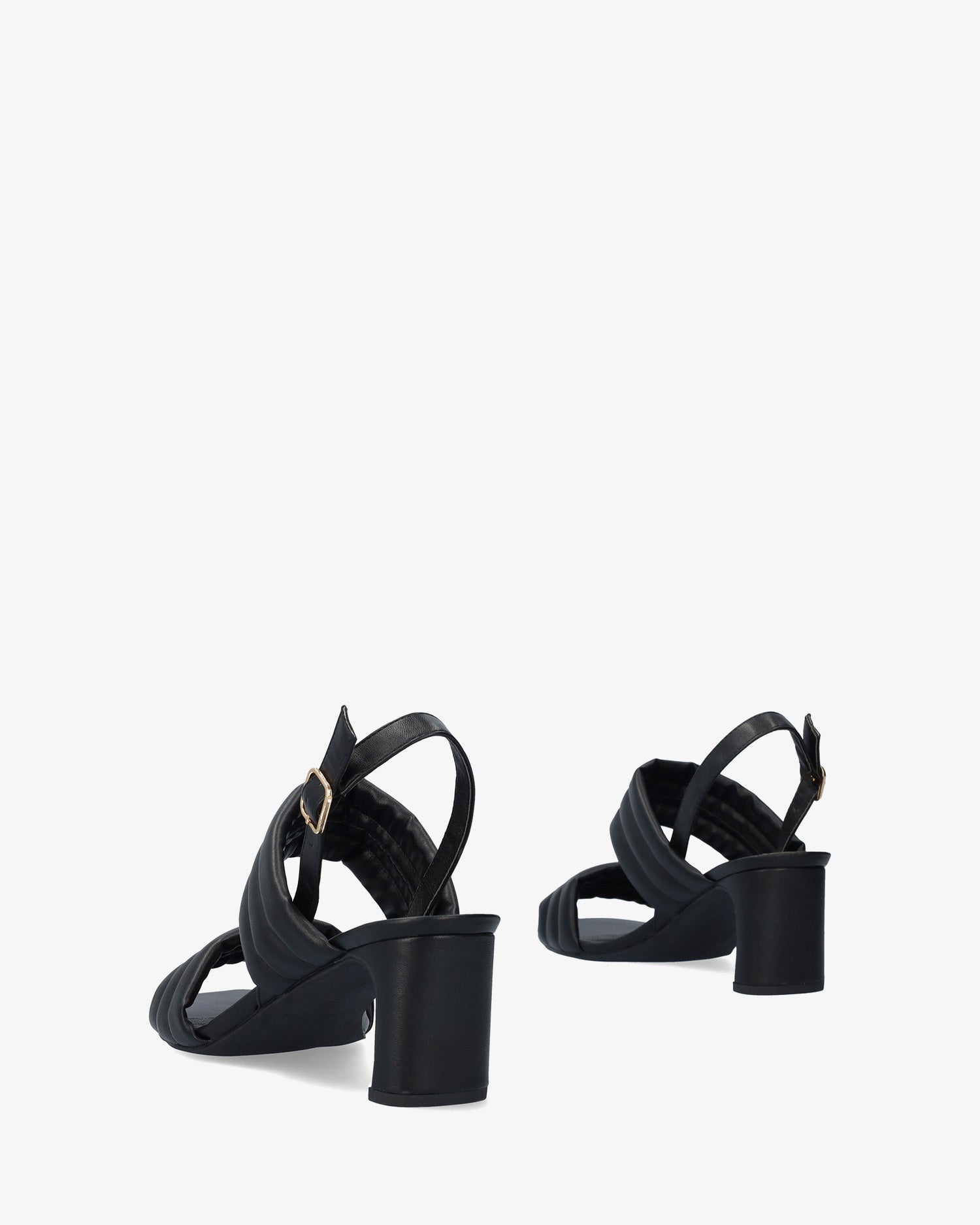 Sandały w kolorze czarnym, na półkwadratowym obcasie. Fason z odkrytymi plecami, szerokimi, tłoczonymi paskami i dopasowanymi przeszyciami z przodu i na podbiciu. Otwarte, kwadratowe palce. Zapięcie na metalową klamrę wokół kostki. Obcas 7,5 cm dla małych rozmiarów od 32 do 35. Obcas 8 cm dla dużych rozmiarów od 42 do 45.