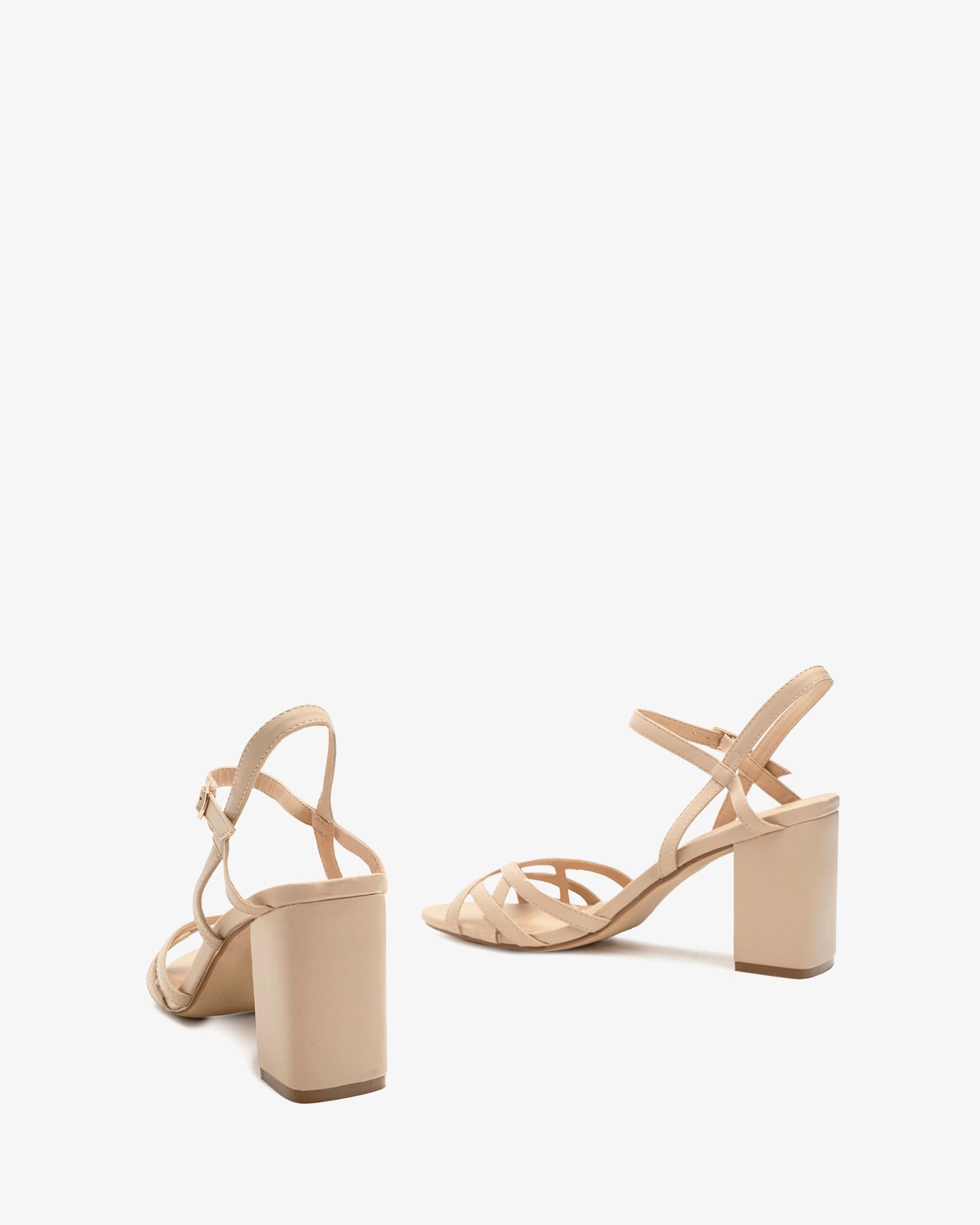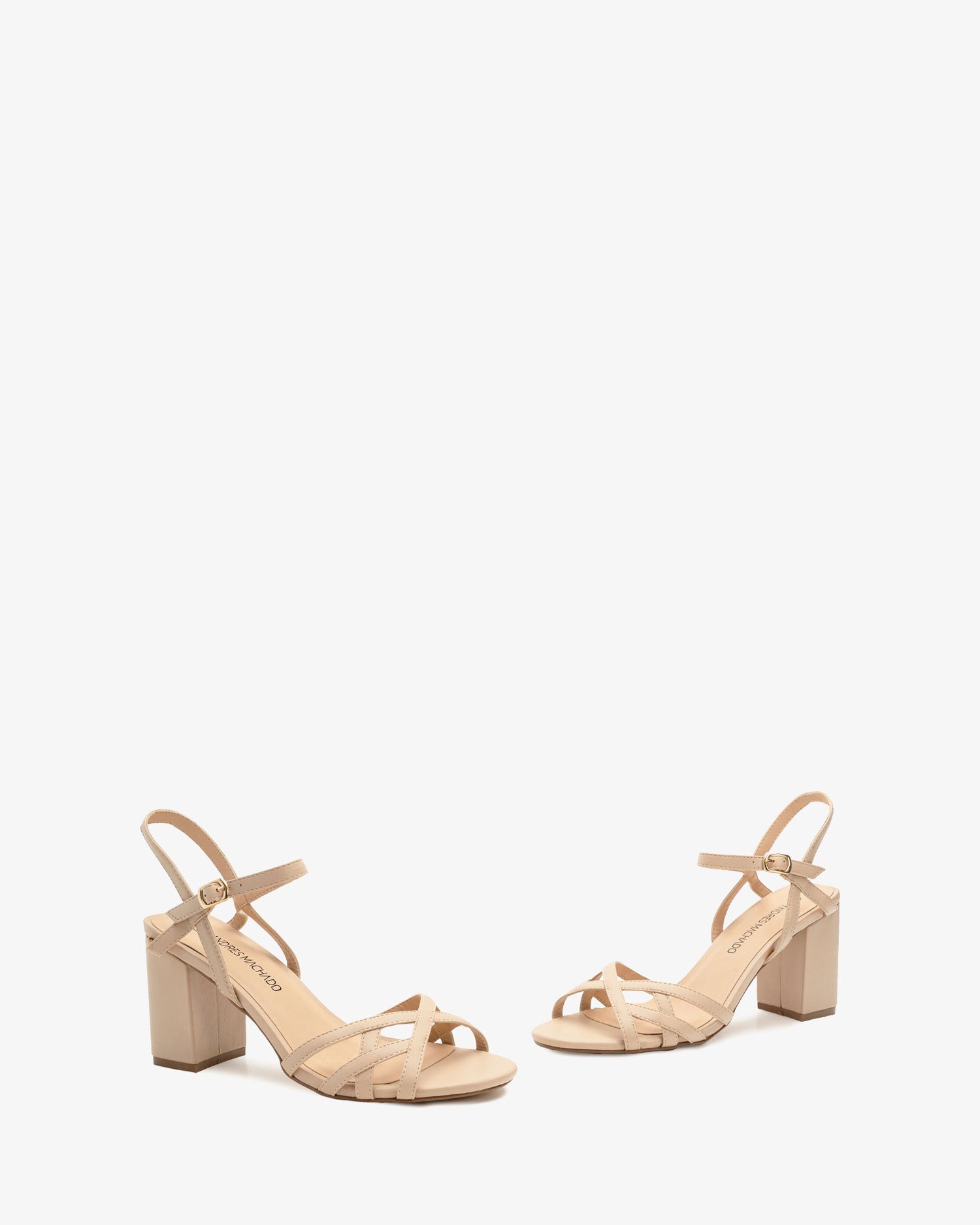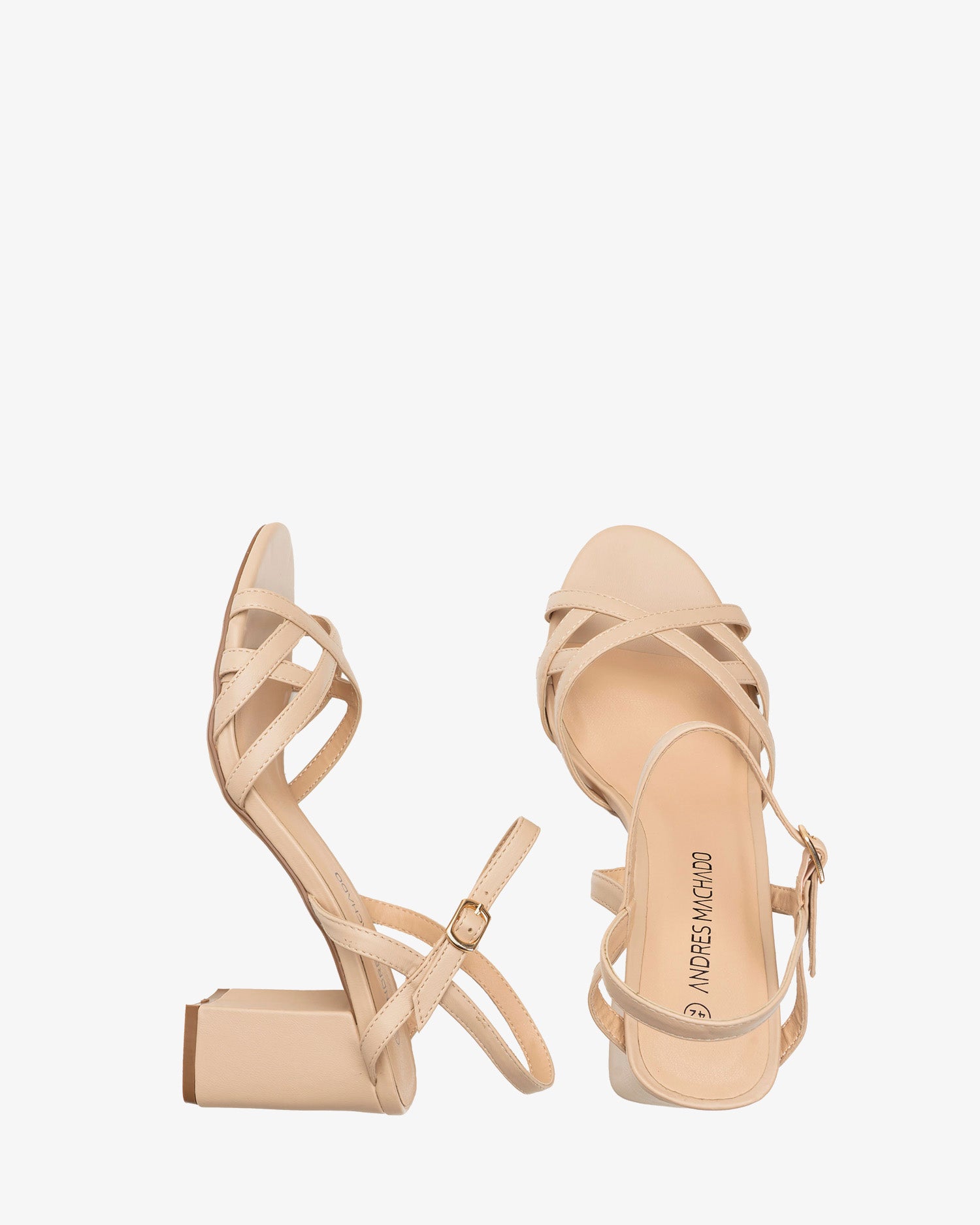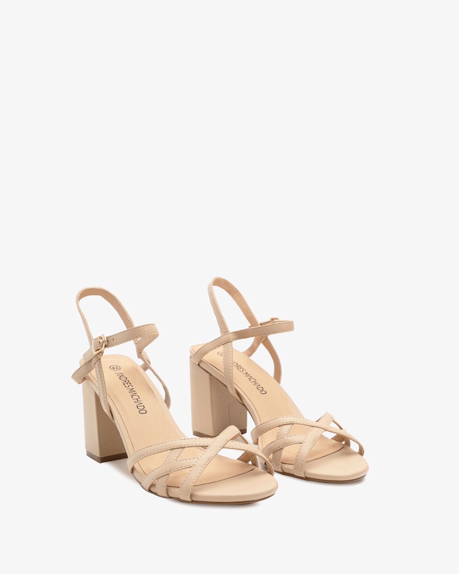 Miękkie sandały w kolorze kremowym. Konstrukcja cienkich, dopasowanych pasków skrzyżowanych przy palcach, ozdobionych przeszyciami. Zapięcie na klamrę z paskiem na kostce. Otwarta pięta. Szeroki, kremowy obcas o wysokości 8 cm dla małych rozmiarów od 32 do 35. Obcas o wysokości 9 cm dla dużych rozmiarów od 42 do 45.