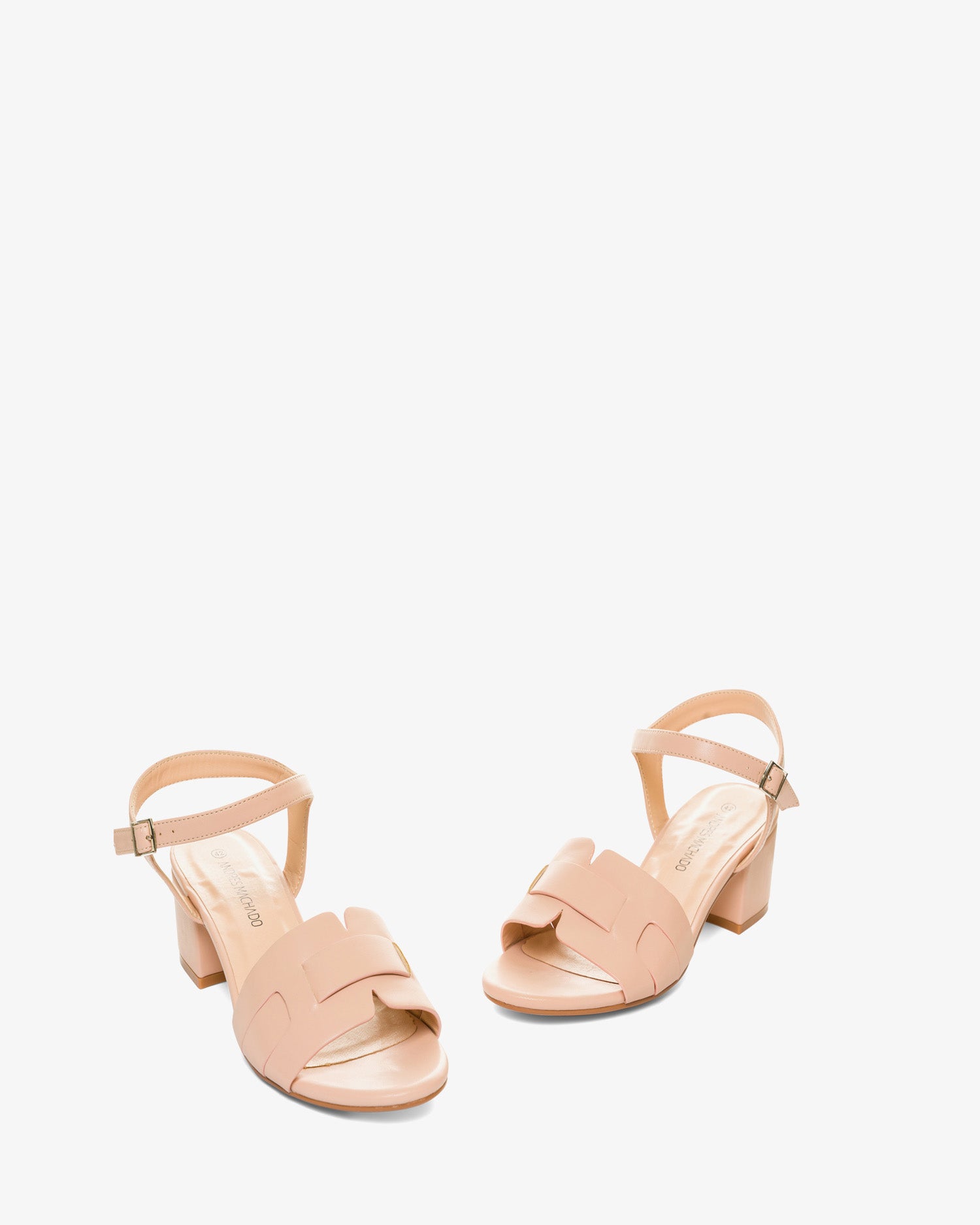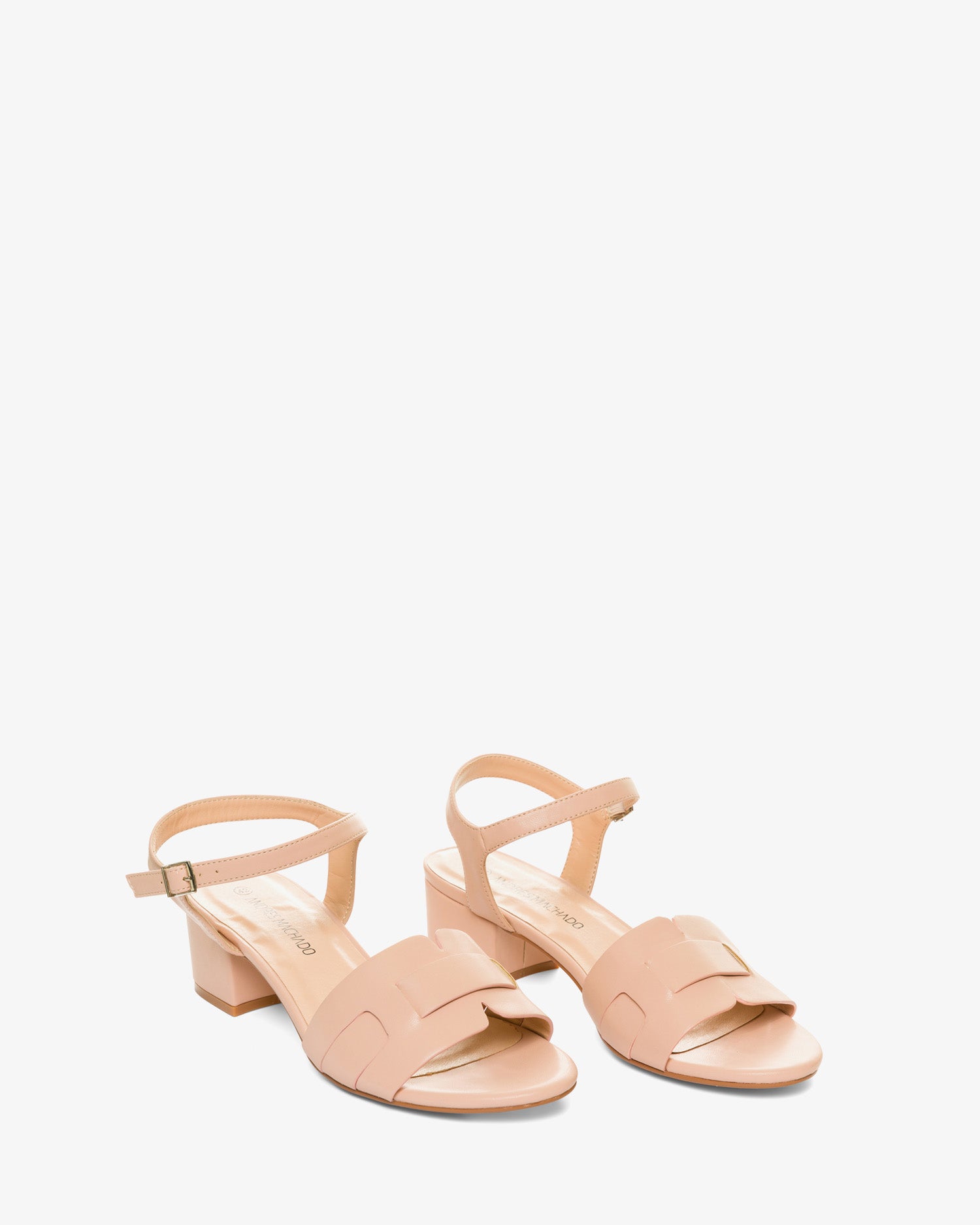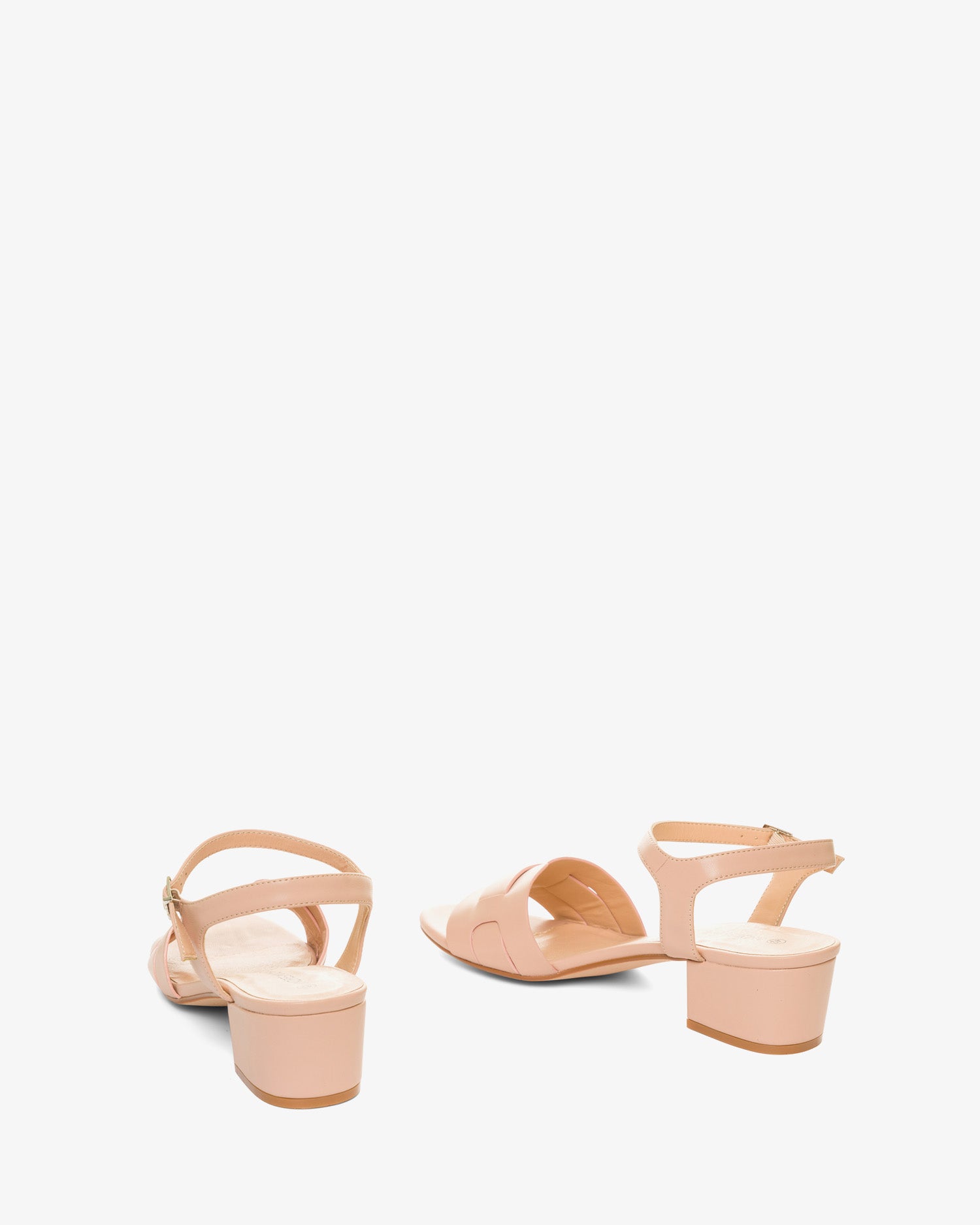 Sandały na szerokim obcasie w stonowanym kolorze. Buty typu slingback z szerokim i cienkim paskiem przeplatanym przy palcach. Zapięcie na metalową klamrę przy kostce. Zaokrąglone i odkryte palce. Obcas 5 cm dla małych rozmiarów od 32 do 35. Obcas 5,5 cm dla dużych rozmiarów od 42 do 45.