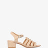 Miękkie sandały w kolorze makijażu na kwadratowym obcasie. Fason z odkrytymi plecami, z cienkimi, oddzielnymi, równoległymi ramiączkami połączonymi pasującym środkowym paskiem. Otwarte, zaokrąglone palce. Zapięcie na metalową klamrę wokół kostki. Obcas 5 cm dla małych rozmiarów od 32 do 35. Obcas 5,5 cm dla dużych rozmiarów od 42 do 45.