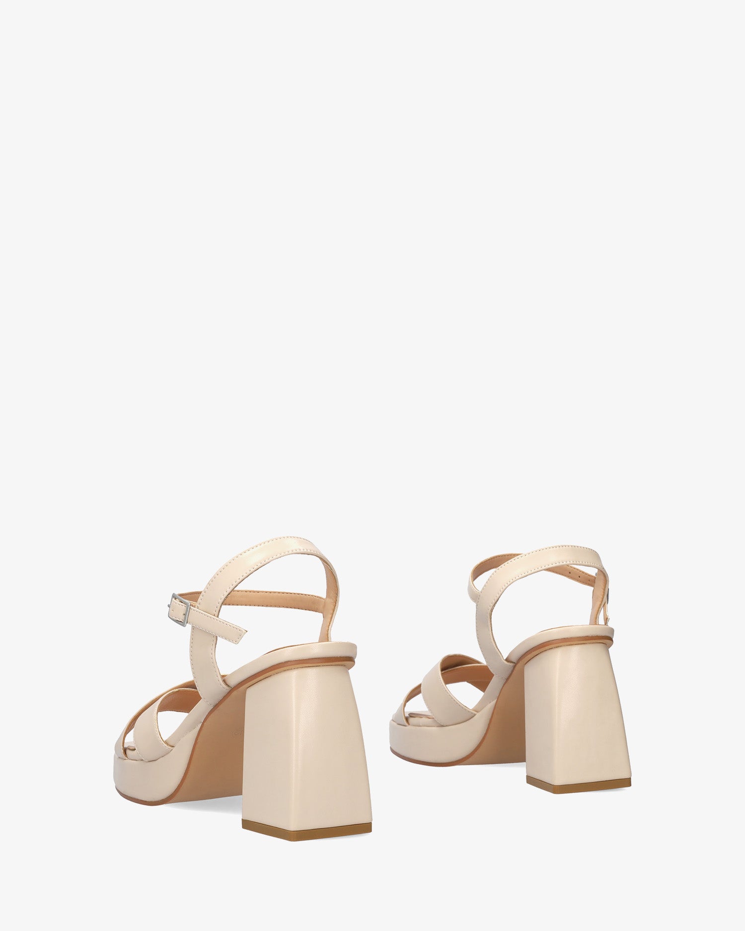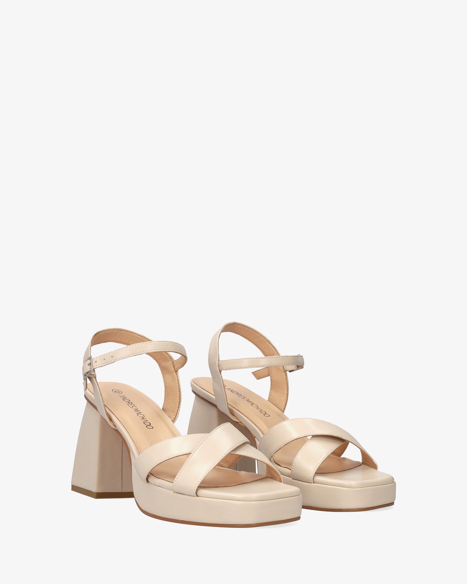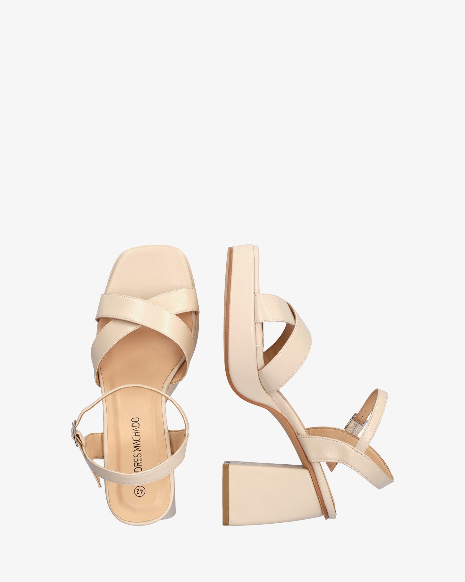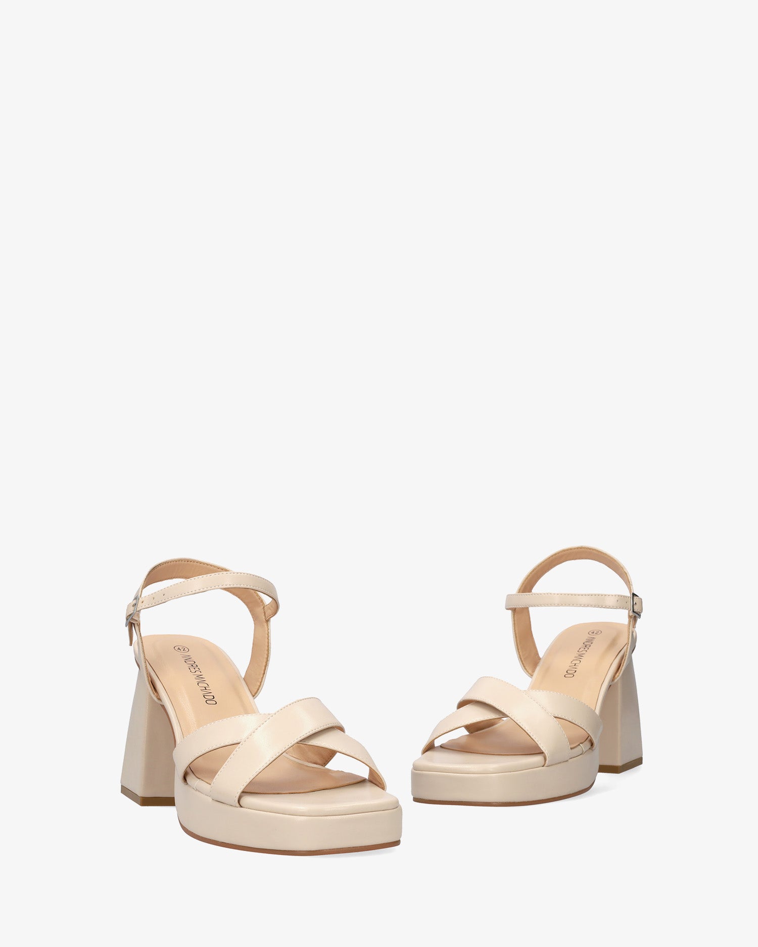 Miękkie sandały na szerokim obcasie i platformie w kolorze makijażu. Fason z odkrytym tyłem i kwadratowym noskiem, z dwoma szerokimi paskami połączonymi z przodu. Zapięcie na sprzączkę i cienki pasek na bransolecie. Dopasowany kolorystycznie obcas. Obcas o wysokości 10 cm i platforma o wysokości 2 cm dla małych rozmiarów od 32 do 35. Obcas o wysokości 10,5 cm i platforma o wysokości 2,5 cm dla dużych rozmiarów od 42 do 45.