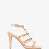 Miękkie sandały w kolorze makijażu na wysokim obcasie. Fason z odkrytymi plecami, trzema cienkimi ramiączkami z przodu i pasującą cholewką. Ozdobne złote nity na wszystkich paskach. Zapięcie na metalową klamrę i pasek na kostkę. Otwarte, kwadratowe palce. Obcas 10,5 cm dla małych rozmiarów od 32 do 35. Obcas 12 cm dla dużych rozmiarów od 42 do 45.