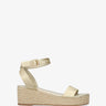 Miękkie sandały w kolorze złotym na koturnie z juty. Fason z odkrytymi plecami i szerokim paskiem z przodu. Zapięcie na metalową klamrę z pasującym paskiem i przeplataną bransoletą wokół kostki. Odkryte palce. Koturny i platforma z przodu wykonane z juty. Koturna o wysokości 6,5 cm i platforma o wysokości 3 cm dla małych rozmiarów od 32 do 35. Koturna o wysokości 6,5 cm i platforma o wysokości 3 cm dla dużych rozmiarów od 42 do 45.