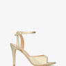 Miękkie złote sandały na wysokim obcasie. Model z odkrytą piętą i paskiem w kształcie litery U oplatającym przód w tym samym odcieniu. Zapięcie na metalową klamrę i pasek na kostkę. Odkryte palce. Obcas 10,5 cm dla małych rozmiarów od 32 do 35. Obcas 12 cm dla dużych rozmiarów od 42 do 45.