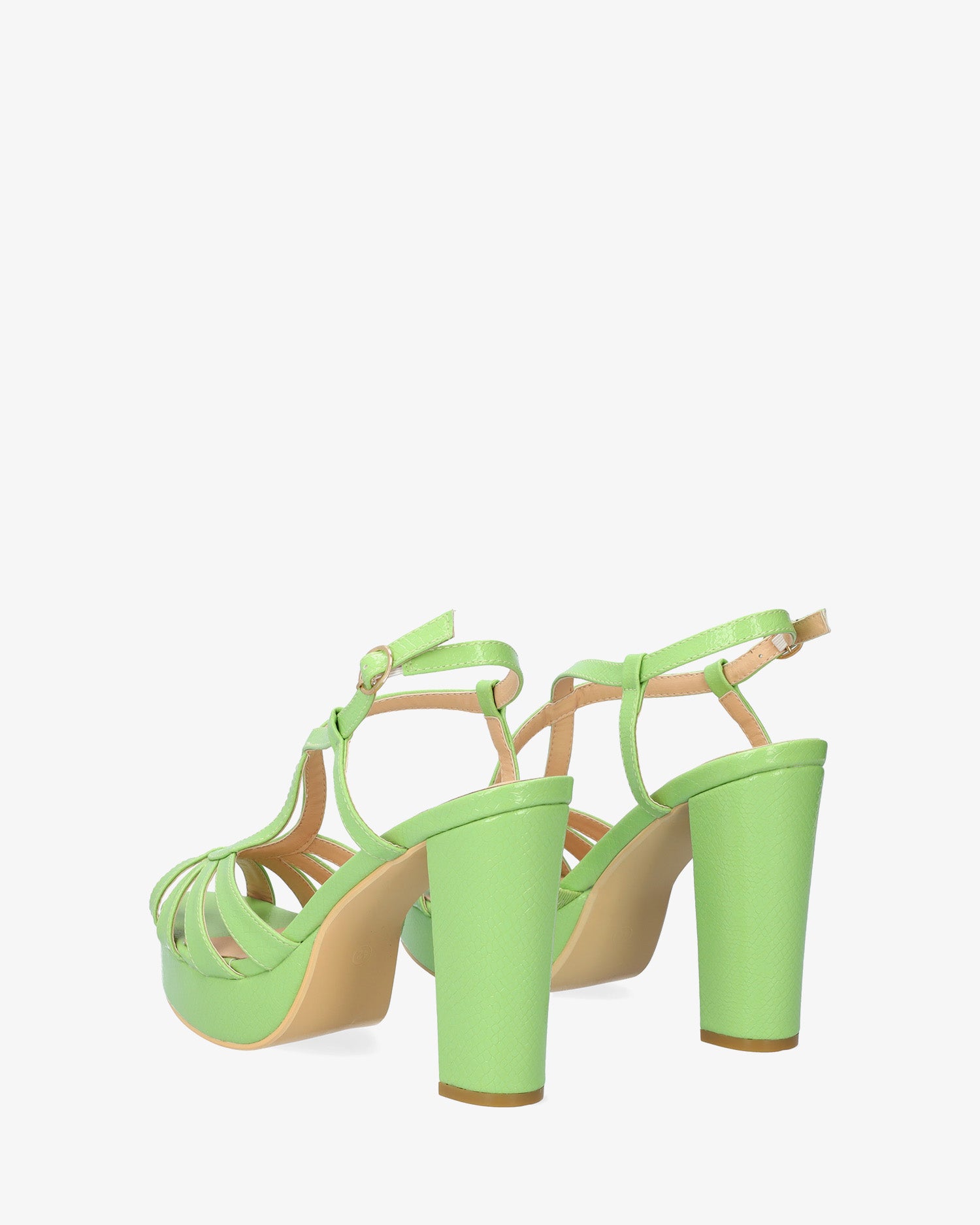 Sandały na wysokim obcasie, wykonane ze skóry lakierowanej w kolorze pistacjowym. Fason z odkrytym tyłem, owalnymi paskami na podbiciu, zapinany na sprzączkę, wyściełany lakierowaną skórą. Zaokrąglone i odkryte palce. Wysokość 3 cm, dopasowana podszewka na platformie i szerokość 10,5 cm, prosty obcas dla małych rozmiarów od 32 do 35. Wysokość 3 cm, dopasowana podszewka na platformie i szerokość 12,5 cm, prosty obcas dla dużych rozmiarów od 42 do 45.