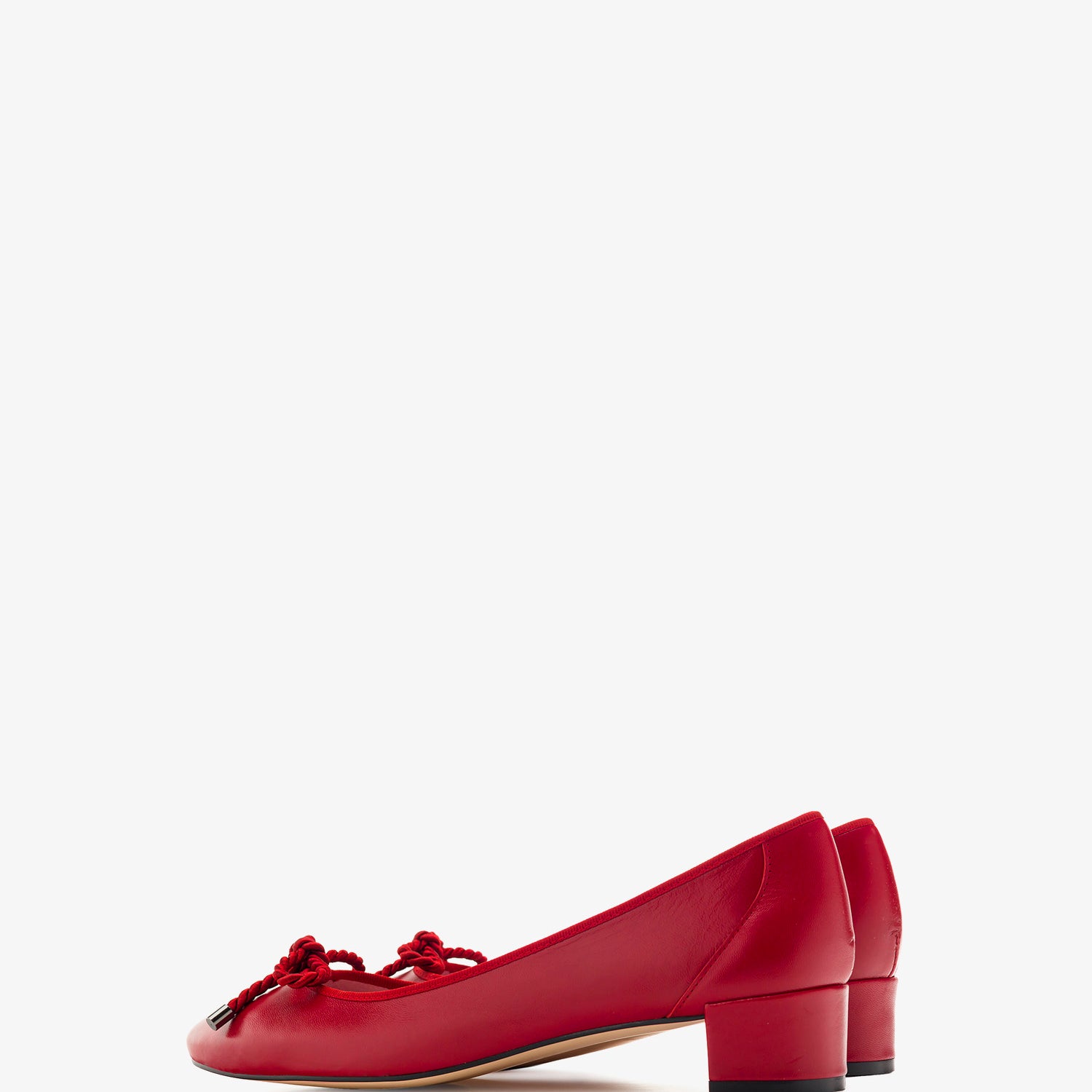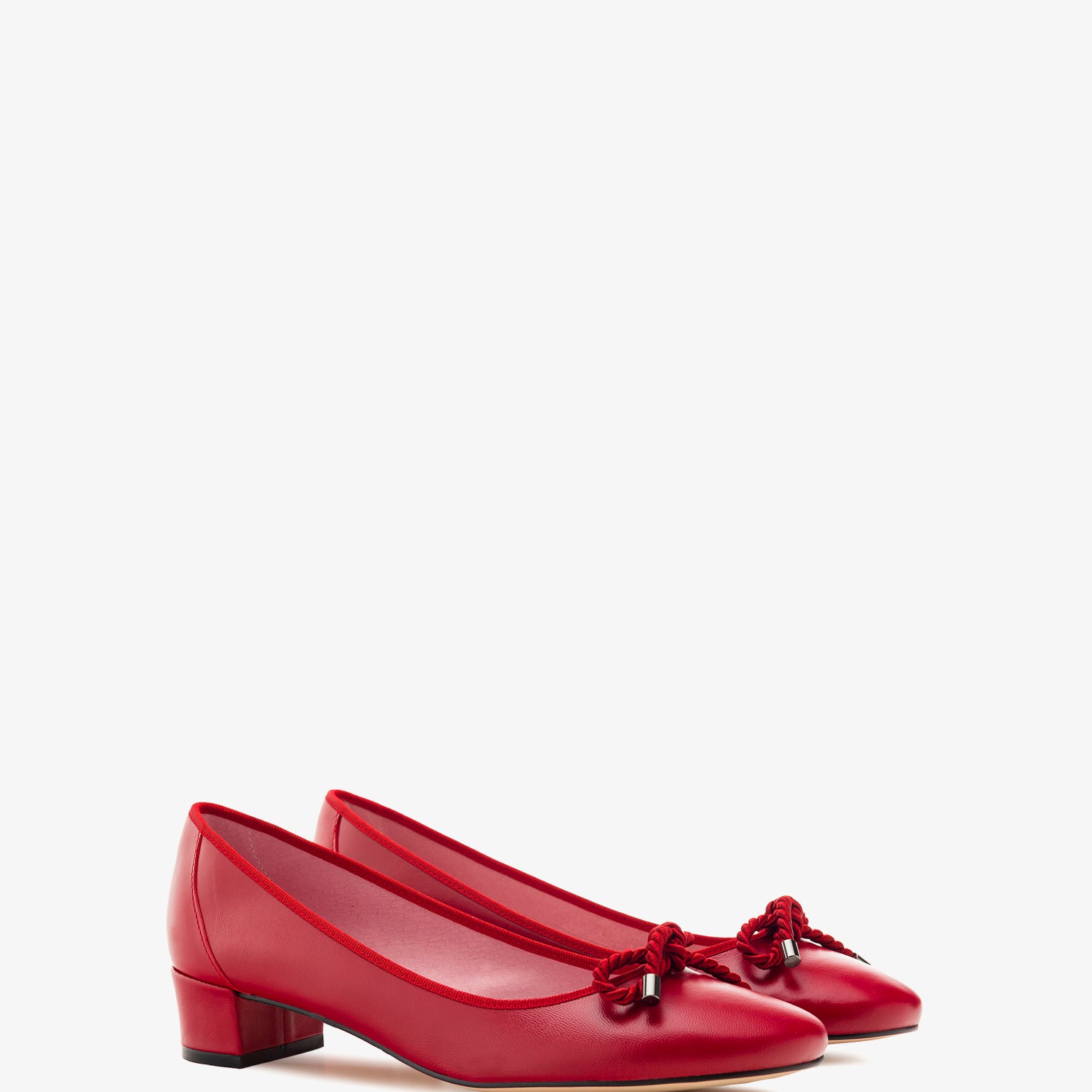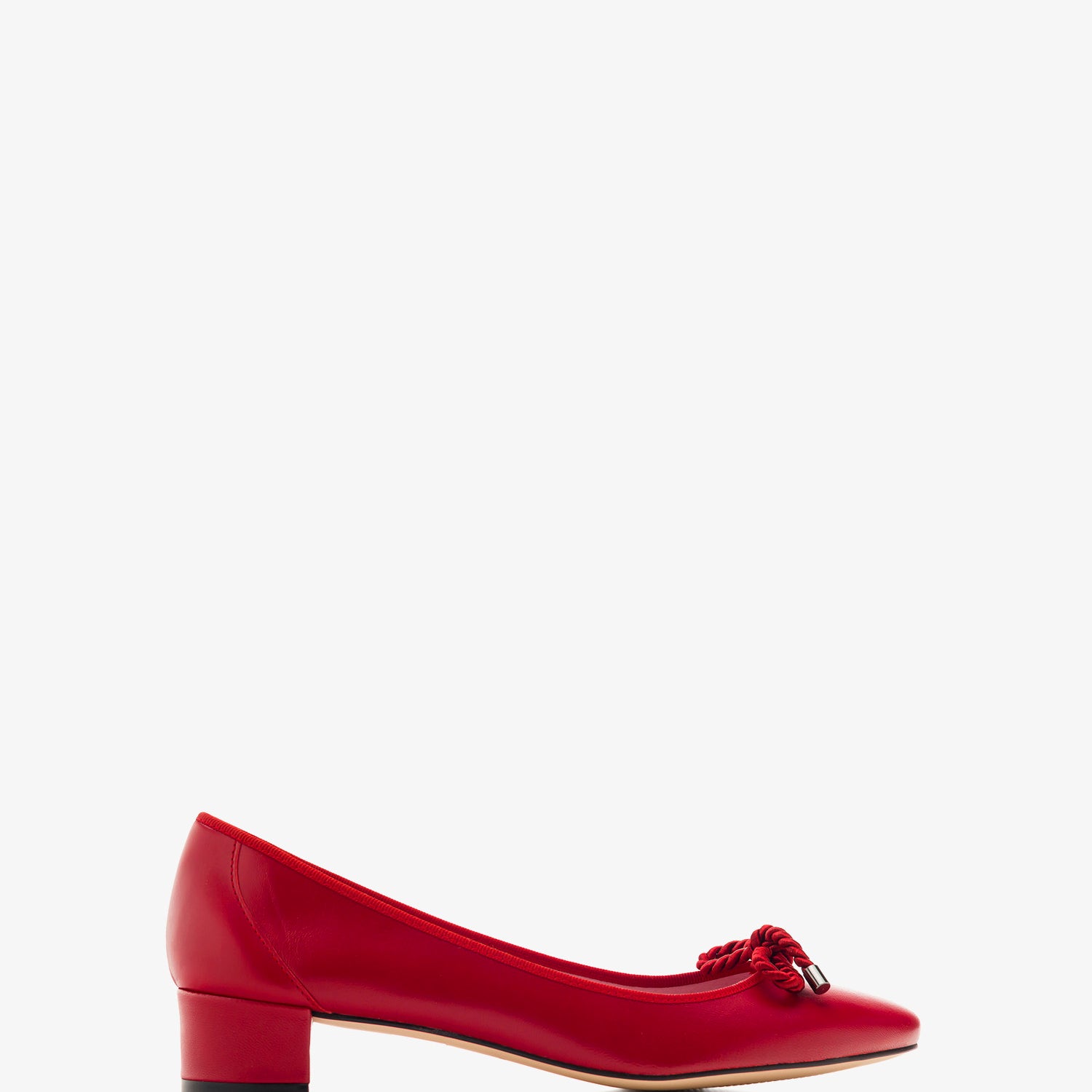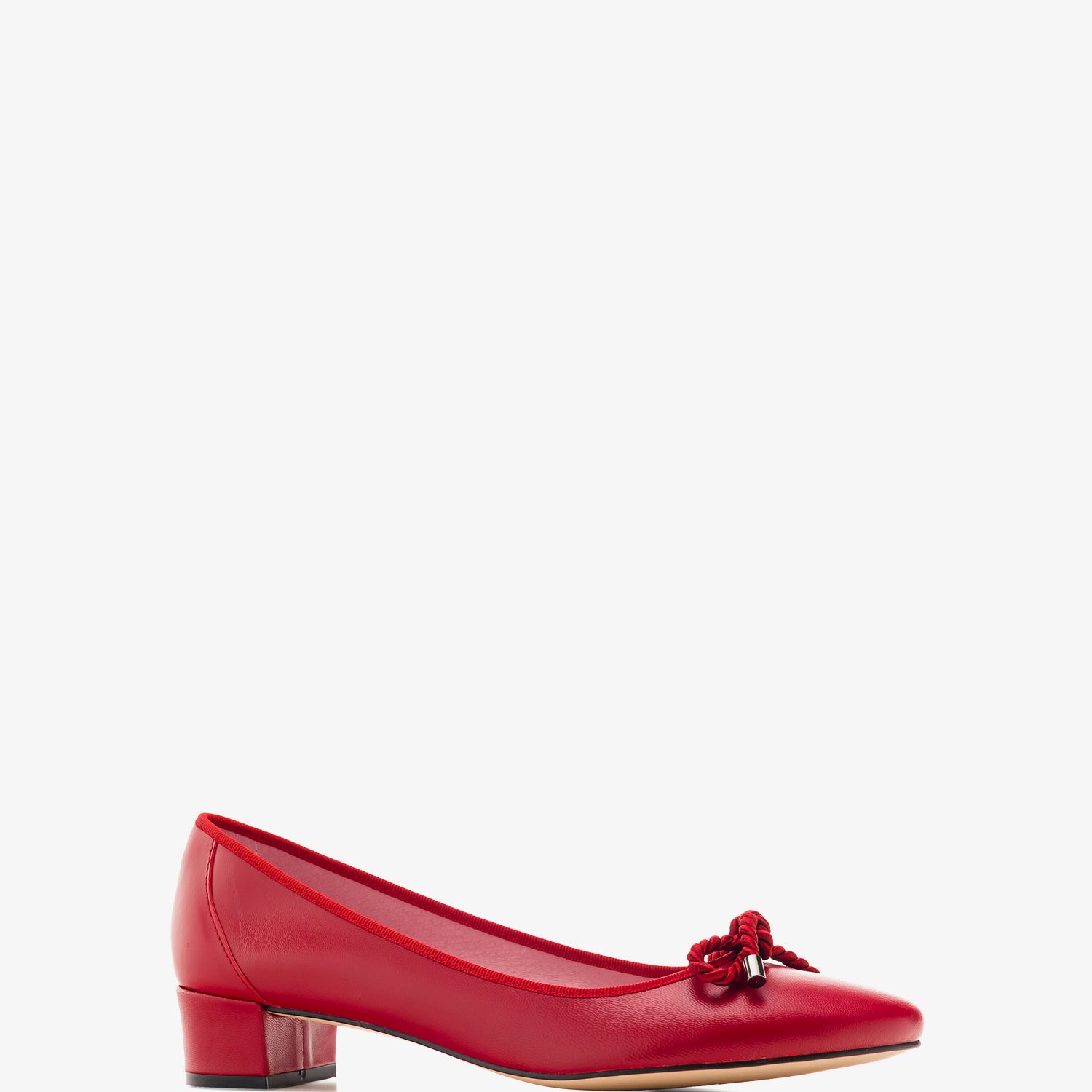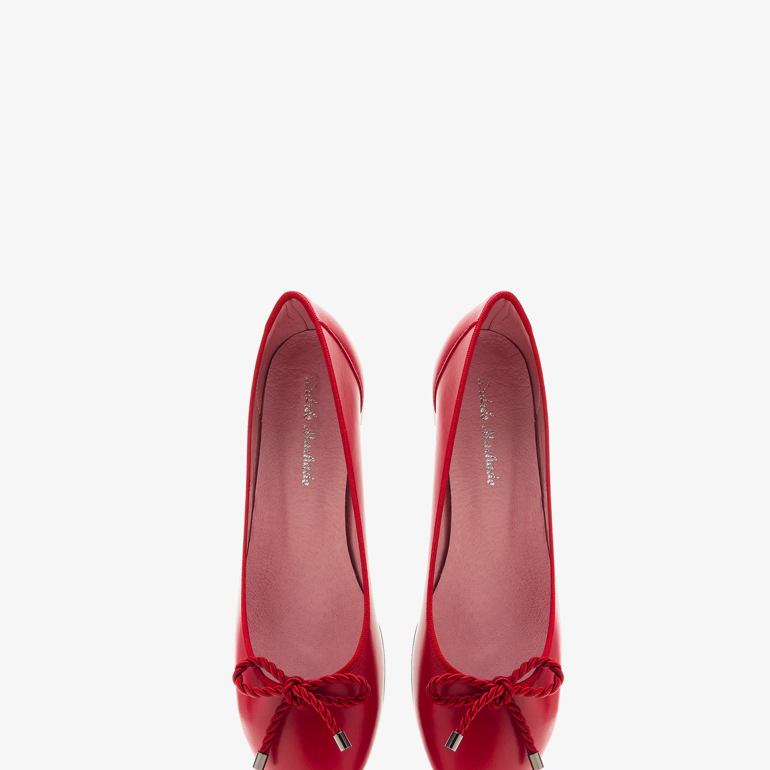 Tancerka w czerwonej skórze. Podszewka i wkładka wykonane ze skóry w kolorze wielbłądzim. Węzeł marynarski z pasującą plecioną nicią przy dekolcie. Obcas o szerokości 3 cm, w tym samym kolorze, dla małych rozmiarów od 32 do 35. Obcas o szerokości 3,5 cm dla dużych rozmiarów od 42 do 45. Wyprodukowano w Hiszpanii.