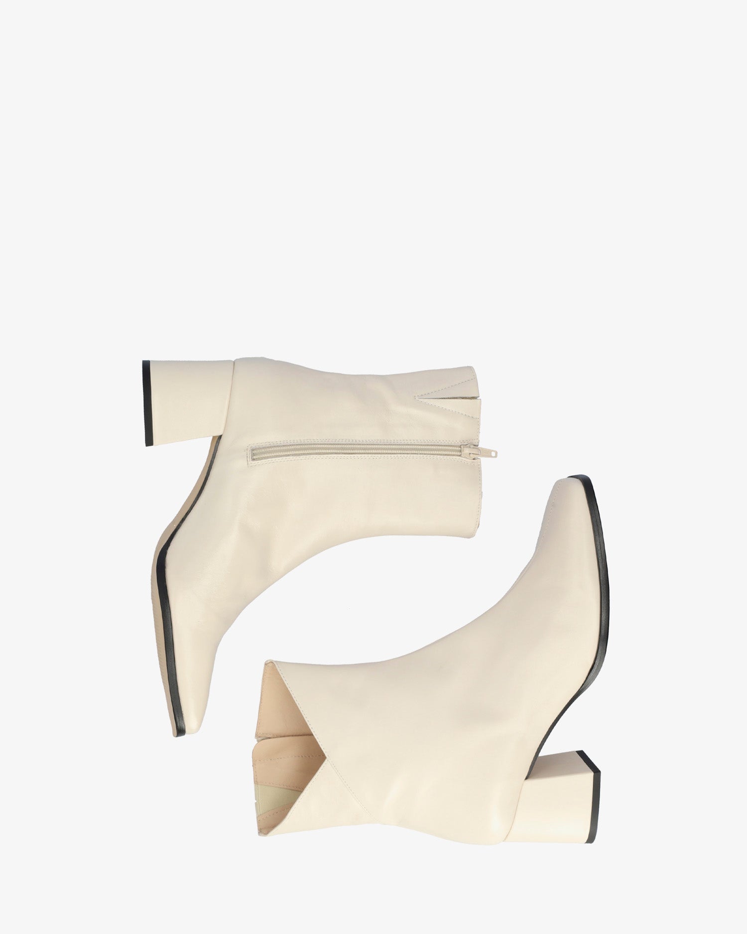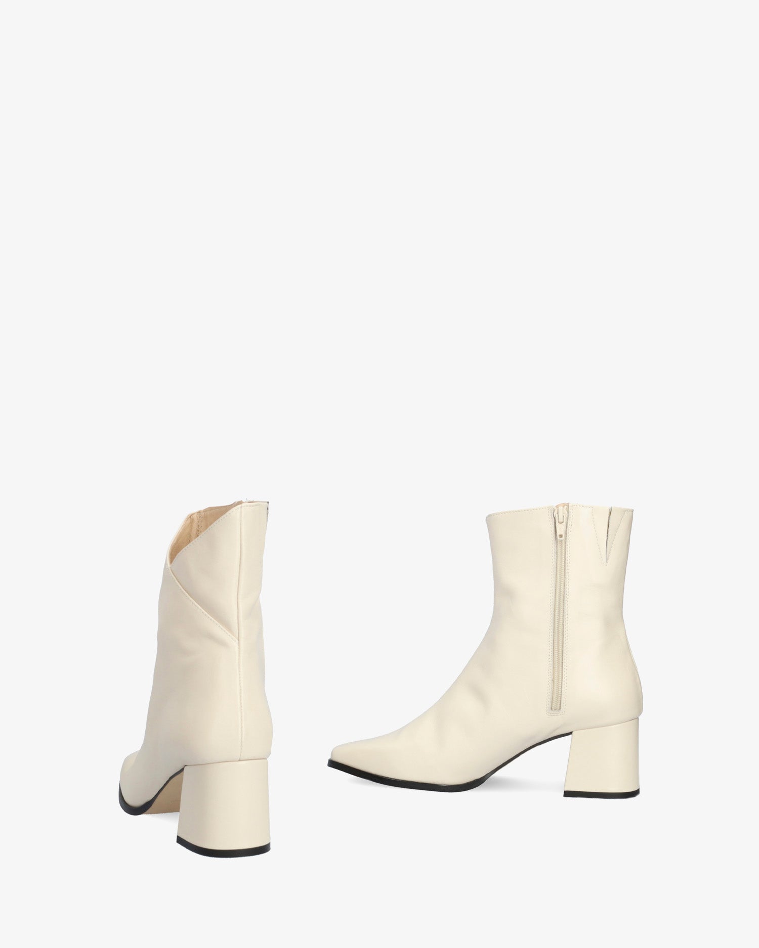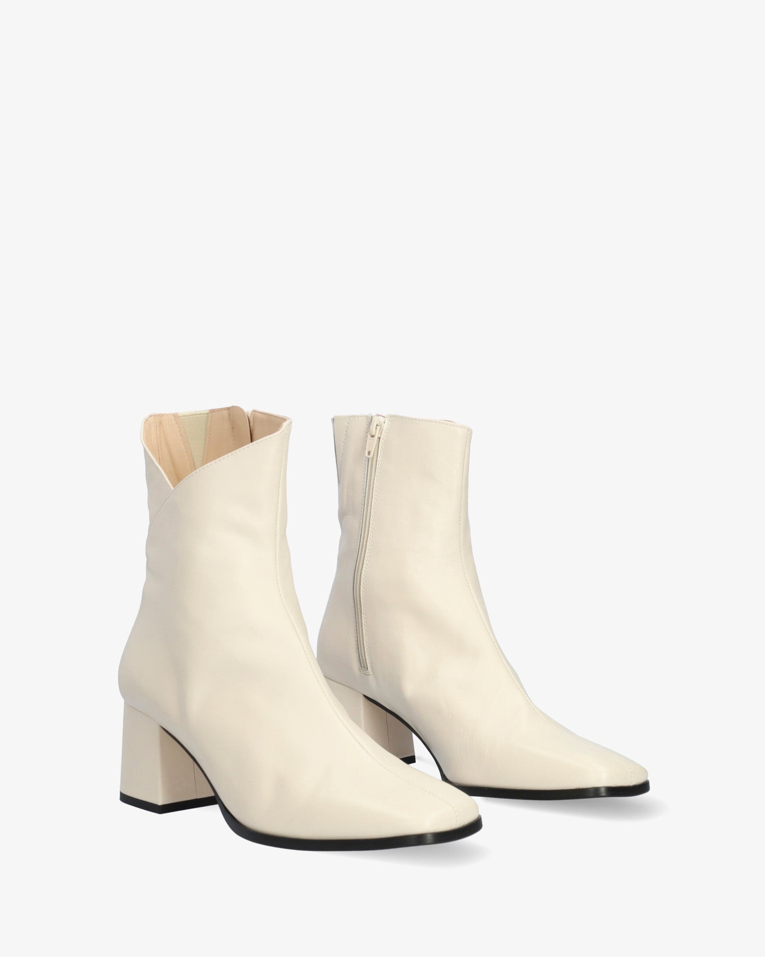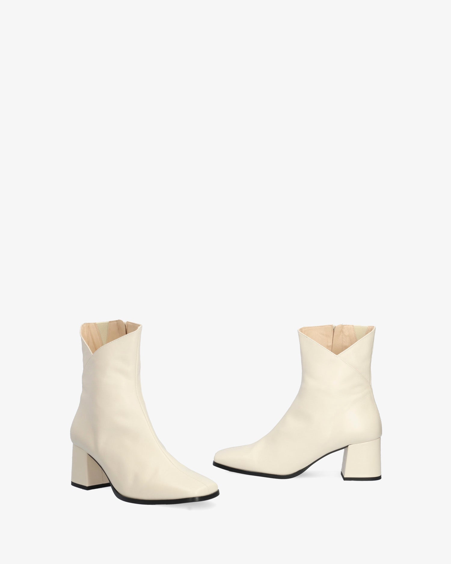 Skórzany but w kolorze lodu. Centralny szew biegnący od palców do górnej części cholewki. Szczegół otwartego, zewnętrznego wału w kształcie litery V. Zapięcie na suwak po wewnętrznej stronie. Podszewka ze skóry beżowej. Wykończenie w formie kwadratowego noska. Obcas o wysokości 6 cm, szeroki, podszyty materiałem w tym samym kolorze, odpowiedni dla małych rozmiarów od 32 do 35. Obcas o wysokości 6 cm odpowiedni dla średnich rozmiarów od 36 do 41. Obcas o wysokości 6,5 cm odpowiedni dla dużych rozmiarów od 42 do 45. Wyprodukowano w Hiszpanii.