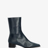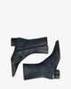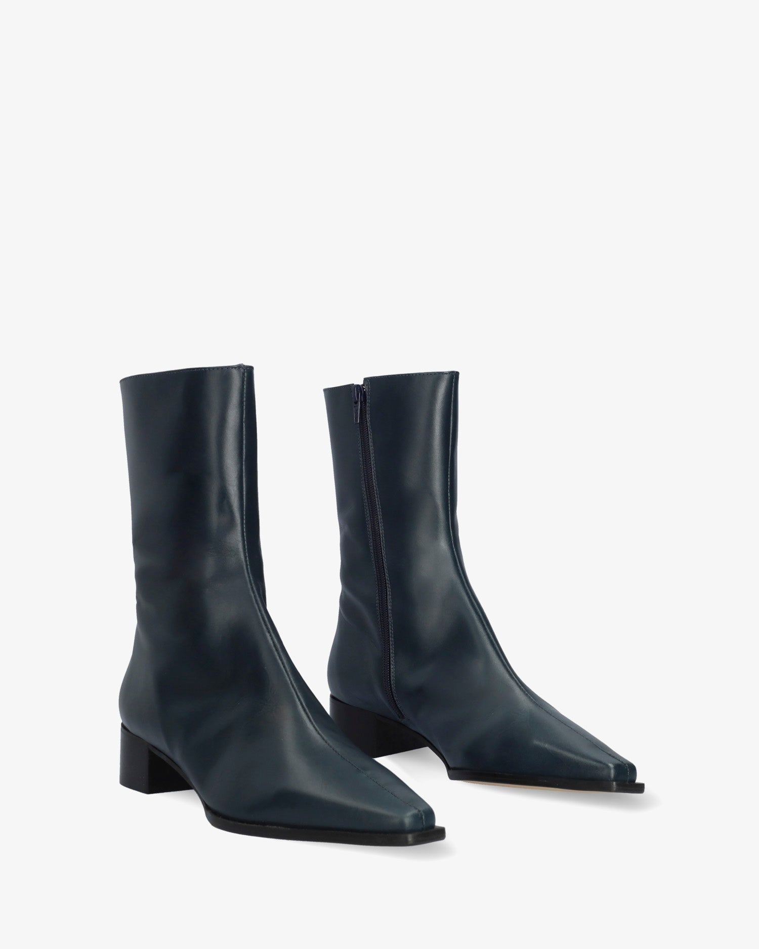 Skórzany but w kolorze granatowym. Szczegóły przeszycia od środka palców do górnej części cholewki. Wykończenie w formie kwadratowego noska. Dopasowany zamek błyskawiczny po wewnętrznej stronie. Podszewka ze skóry beżowej. Szeroki obcas o wysokości 3,5 cm dla małych rozmiarów od 32 do 35. Obcas o wysokości 4 cm dla średnich rozmiarów od 36 do 41. Obcas o wysokości 4 cm dla dużych rozmiarów od 42 do 45. Wyprodukowano w Hiszpanii.