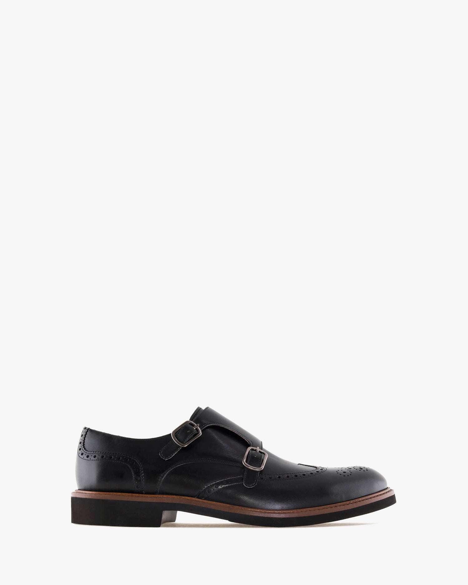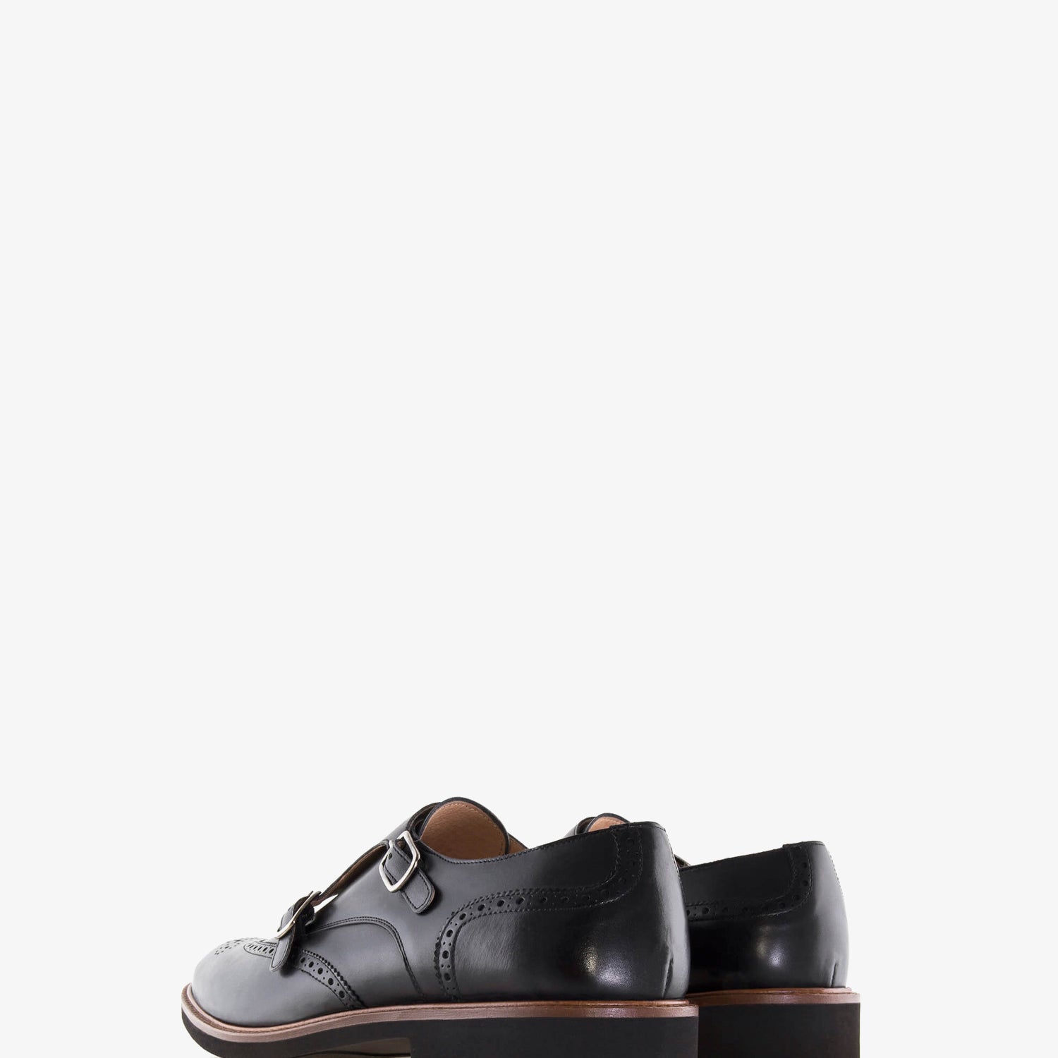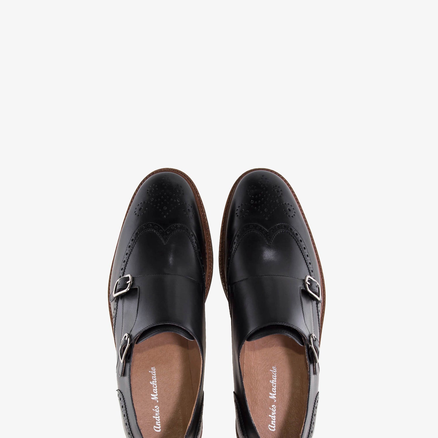 Czarne skórzane buty typu monk z dwiema metalowymi klamrami i elastycznym zapięciem. Ozdobny szczegół w postaci ściętych krawędzi cięcia. Wkładka i podszewka w kolorze wielbłądzim. Czarna podeszwa. Małe rozmiary od 37 do 40. Duże rozmiary męskie od 47 do 50. Wyprodukowano w Hiszpanii.